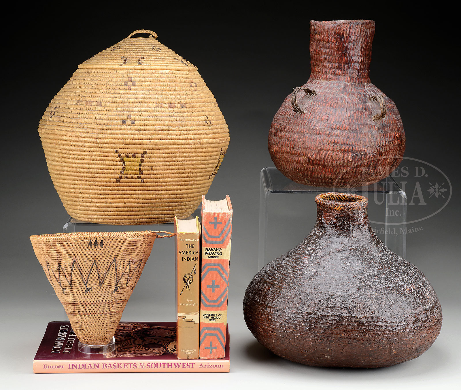 GROUP OF FOUR NATIVE AMERICAN BASKETS TOGETHER WITH THREE BOOKS.1st quarter 20th century. Lot includes; One 8″ x 8″ Piute polychrome bird in basket. Two Piute basketry pitch covered water bottles, larger 11″ x 14″, smaller 12″ x 9″ has braided horsehair carrying straps. Late 19th century, 12-1/2″ x 13-1/2″ Eskimo covered woven in grass with minimal design. Along with three Native American reference books. CONDITION: Piute, finely woven, near mint condition. Water bottles, both good. Eskimo has detached lifting handle on top, various in-use wear on edge, stitch loss. 52009-1 (800-1,200) – Lot 3230