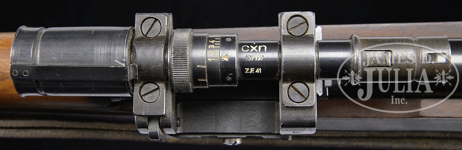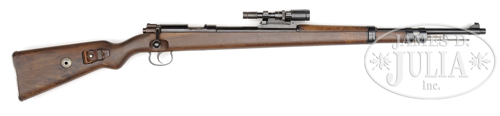 *◊ SCARCE GUSTLOFF-WERKE 22 CALIBER TRAINER WITH Zf41 SCOPE AND MOUNT.SN 238008. Cal. .22. Standard Gustloff KKW marked with the firms logo, “KAL.22 LANG FUR BUCHSEN”, and Eagle over “N” on both bbl and receiver. Rifle is in overall very nice as refinished condition has an unmarked Zf41 style left side rail mounted for use with a standard Zf41 scope and mount. Configuration appears to be from the era. Excellent condition “cxn” marked scope SN 137137, comes with both front and rear shields. Optics fairly clear un-numbered mount is marked “duv” “WaA 214”. Comes with orig war time KKW/K98 leather sling. PROVENANCE: Collection of Dr. Geoffrey Sturgess. CONDITION: Very fine. High polished bluing approximately 98% with plum coloring of rear receiver and blued portions of the bolt assembly, unmarked stock is very fine with no major dings, scratches or handling marks. Bore is bright and shiny with strong lands & grooves. 4-53271 DW10 (800-1,500) – Lot 3232