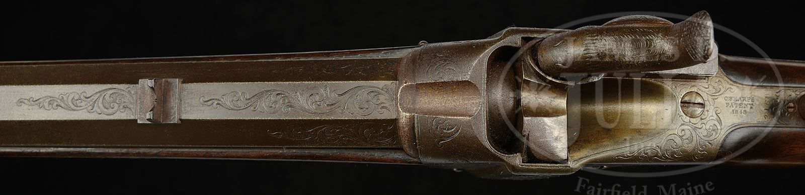 RARE FACTORY ENGRAVED MODEL 1852 SHARPS SPORTING RIFLE WITH HEAVY OCTAGON BARREL.SN 3160. 90 Bore (about 38 Cal). 25-1/4″ bbl. According to Frank Sellers’ in his text Sharps Firearms he states only about 600 1852 sporting rifles were made of which only 3 were engraved in 90 bore and six were “extra engraved” in 90 bore with oct bbl. So this is indeed a rare gun that also exhibits addition of rear tang sight and double set triggers. Gun is totally iron mounted and mounted with deluxe burl walnut stocks. SN 3160 is found on frame; no other SNs are found but bbl has a “33” stamped on bottom and forestock has same assembly number “33” penciled inside. Engraving is in the Germanic style with arabesque and floral design with fairly full coverage to lock, frame, lever, baseplate, patchbox and portions of buttplate and bbl. This is a rare gun with multi groove sharps rifling that is rarely offered. PROVENANCE: Rev. Liester Myers, San Jose, CA. Lewis Yearout 1976. Estate Collection of Lewis & Leyton Yearout. CONDITION: Bbl is freckled and brown overall with pin prick pitting with some areas of orig brown finish especially in protected areas and bottom of bbl where protected by forestock. Rest of metal surfaces exhibit similar color, rust and pitting. Engraving all discernible as are Sharps patent marks on lock and frame. Forestock is sound retains most of its refinished varnish; buttstock is refinished with glued repair where stock is broken between baseplate and patchbox. Two 1″ x 1/2″ insets can be seen at this break. Buttstock retains most of its revarnished finish. Gun functions mechanically and has discernible rifling. Patchbox has an extra Maynard spring, nipple and fixed front sight. 4-53991 JS75 (5,000-8,000) – Lot 3232