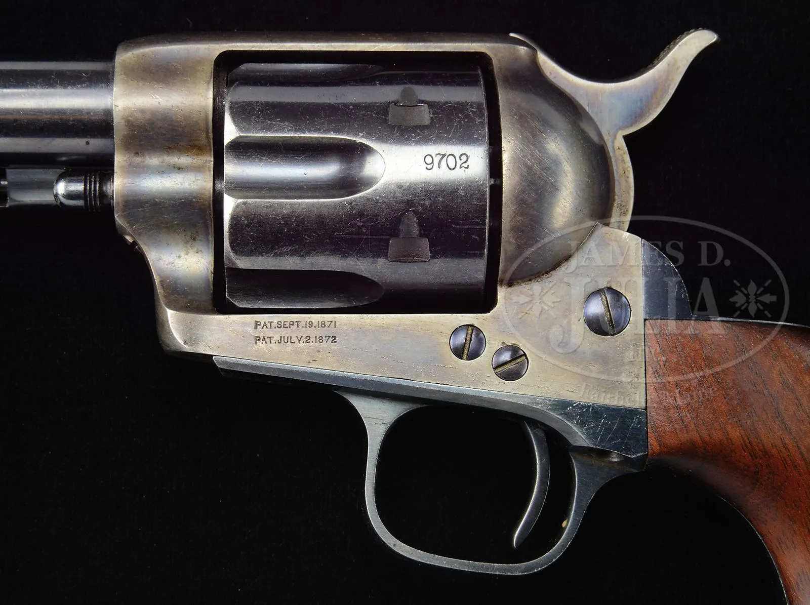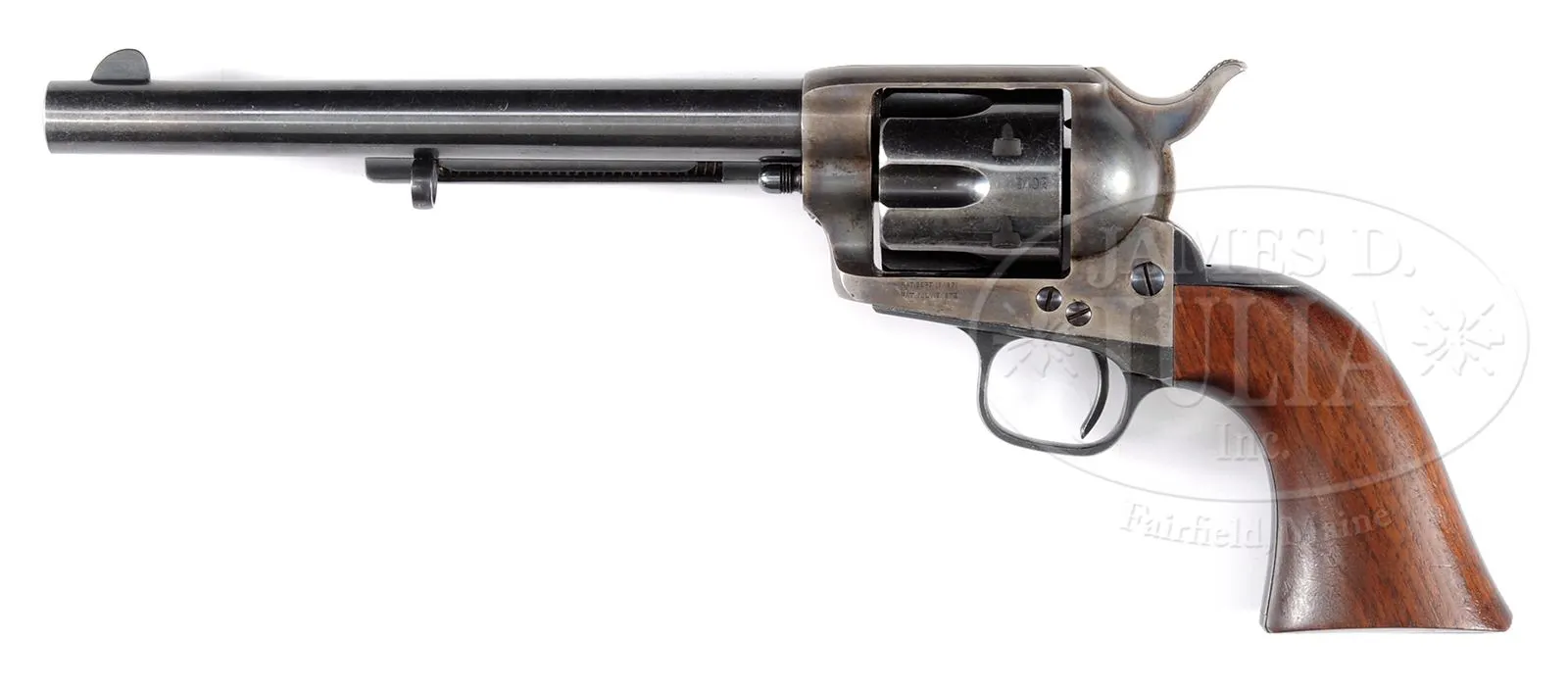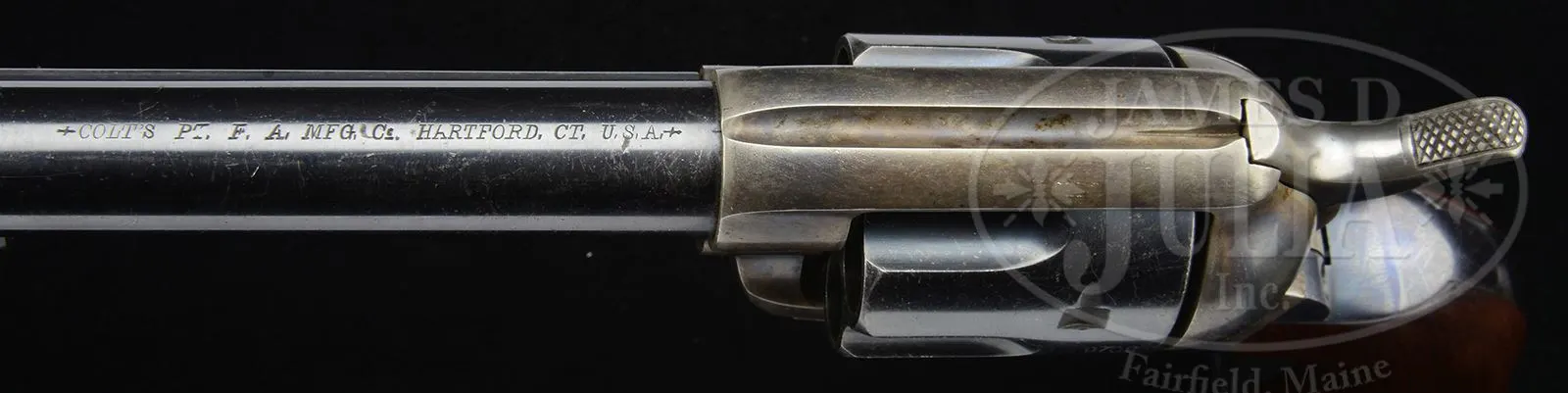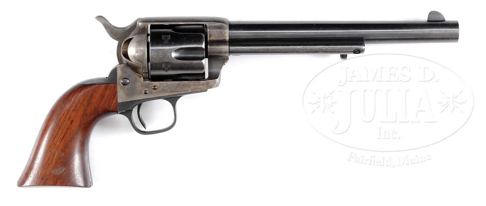 COLT SINGLE ACTION ARMY REVOLVER RESTORED BY TOMMY HAAS.SN 19702. Cal. .45 Colt. Blue and color case hardened with 7-1/2″ bbl, thinned front sight with 1-line script letter address. Left side of frame has 2-line patent dates and is mounted with oil finished 1-piece walnut grip. Revolver has complete, very high quality Tommy Haas restoration with bright Colt-Style blue and case colors. Accompanied by a Colt Factory letter which identifies this revolver in .45 Colt with blue finish, bbl length and type of stocks not listed and shipped to Spies, Kissam & Co., NY, NY, on July 23, 1875, in a shipment of 45 same type arms. Spies, Kissam was one of Colts major distributor that supplied arms to dealers on the American Frontier giving rise to the probability that this revolver saw hard service over the years which necessitated the restoration. PROVENANCE: The Estate Collection of Phil A. Bleakney, Jr. CONDITION: Very fine, overall retains about all of its fine Haas restoration, showing about 95-96% strong blue and about all of its case colors, moderately to heavily faded. Grip frame and grip are sharp and clean. Mechanics are crisp, bore is bright and shiny. 49059-80 JR (6,000-10,000) – Lot 3232 Click here to view provenance