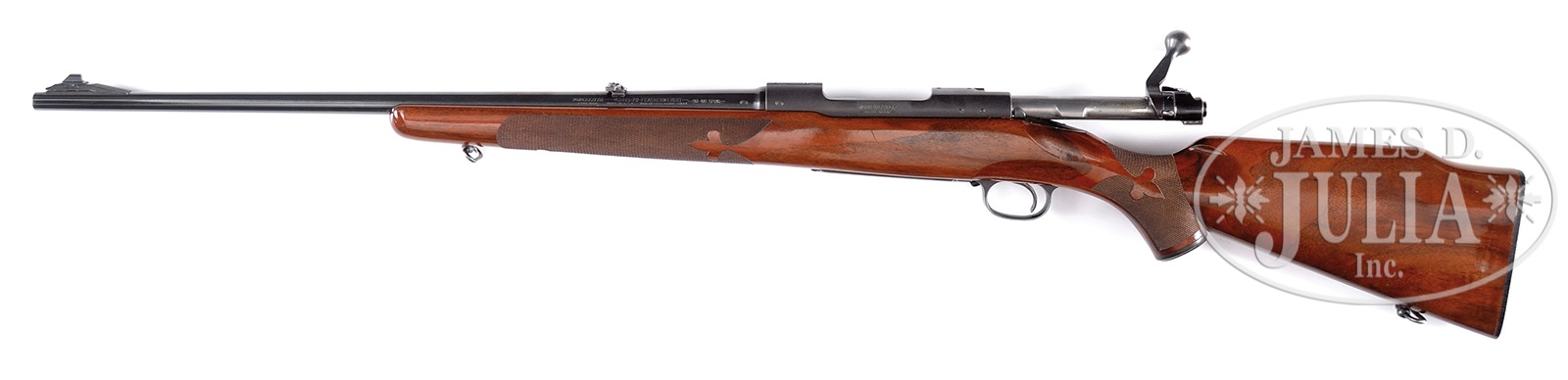 *WINCHESTER MODEL 70 FEATHERWEIGHT CUSTOM STOCKED BOLT ACTION RIFLE.SN 559044. Cal. 30-06. Third type pre-64 featherweight action. 22″ bbl with ramp mounted 103C front sight and 16B folding leaf rear sight. Bolt is numbered to rifle. Custom Monte Carlo walnut Sporter stock. Stock features fleur-de-lis wraparound hand checkering and Iver Johnson hard rubber grip cap. Stock utilizes orig sling swivels and has LOP of 13-5/8″ to orig plastic butt plate. CONDITION: Over 90% blue on bbl and action with fading on bolt handle. Alloy trigger guard and floor plate have light faded finish. Gloss finish stock shows scattered scratches and handling marks. Very good bore. 50604-17 DS (1,500-2,500) – Lot 3234