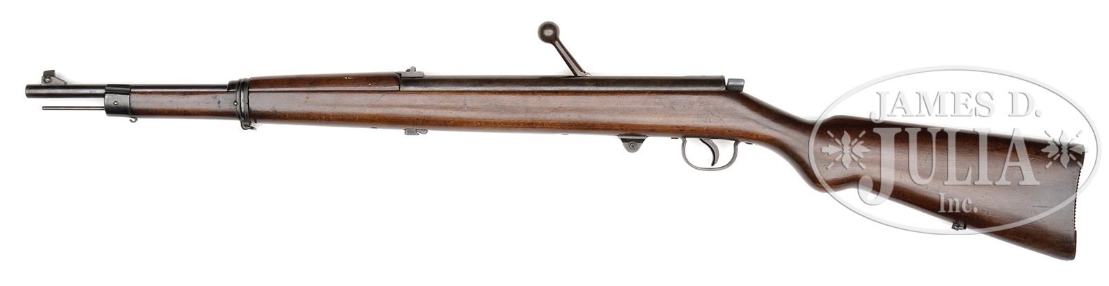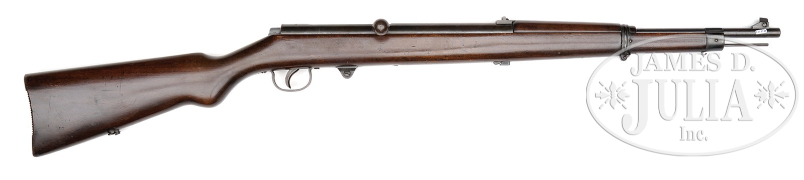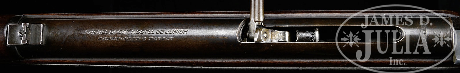 NICE NATIONAL SOCIALIST ERA 4 MM HAENEL SPORT MODELL 33 JUNIOR AIR RIFLE.SN 21678. Cal. 4mm. These rifles were used for youth and para-military training in the 1930’s. The interesting Haenel 33 design utilized a 6-round cast magazine, which is inserted under the rifle. The spring action is cocked by pulling the handle to the rear and then pushing to the front and right to secure. Rifle is made up of stampings and the magazine & safety are zinc alloy die-castings. This example is fully functional, has strong compression, appears all orig and matching. The receiver bears the model designation and the makers trademark and the top bbl is marked “MADE IN GERMANY”. The only other marking is the SN, which appears on the bottom stock. Includes mock cleaning rod and has screw adjusted front and rear sights. PROVENANCE: Collection of Dr. Geoffrey Sturgess. CONDITION: Fine. Bluing approximately 90% with some fading on top receiver and bolt. One brass replacement screw on the trigger guard. Hardwood stock is in very nice condition with only a few handling marks and minor scratches. 4-53315 DW4 (250-500) – Lot 3235