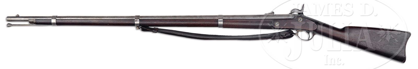 SCARCE FINE 1861 DATED SPRINGFIELD RIFLED-MUSKET WITH BAYONET.SN NSN. 58 cal. 40″ bbl. This is a very nice example of Civil War model 1861 Springfield dated 1861 which over 450,000 were made in 1861 and 1862 and few survive in high condition as this was the workhorse musket of the Union Army during the Civil War. Indeed these muskets were often captured and saw continued use by the Confederacy. This gun is consistent with other 1861 Springfields being iron mounted, fitted with three flat bands that are spring retained, two leaf rear sight and swelled tulip tip ramrod. This gun is properly marked “US/SPRINGFIELD” with Eagle forward of hammer on lock and “1861” on tail of lock and on bbl flat and “VP/Eagle Head” proof. There are two inspectors cartouches crisply stamped opposite lock as can be seen in photos. This is not a surplus gun and no doubt saw some service but is in wonderful condition and a survivor of the early Civil War. This particular Springfield is hard to find in nice condition and appears 100% orig and complete in every regard including bayonet and its orig regulation leather sling. Pictured on pp 22 and 23 of The US Model 1861 Springfield Rifle Musket by Daniel D. Hartzler, Larry W. Yantz and James B. Whisker. PROVENANCE: LTC (r) Bert Millikin Collection. CONDITION: Very good overall. Metal is gray/bright showing old cleaning, staining and light pitting, especially at breech. Markings are all discernible though bbl date and “VP” proof are worn as can be seen in photos. The accompanying bayonet is in good matching condition, fits gun well. Stock is very good-fine overall with crisp edges, good inspector cartouches with a few scattered dings and dents. This gun functions mechanically and has good discernible rifling. 4-51246 JS3 (3,000-4,000) – Lot 3239