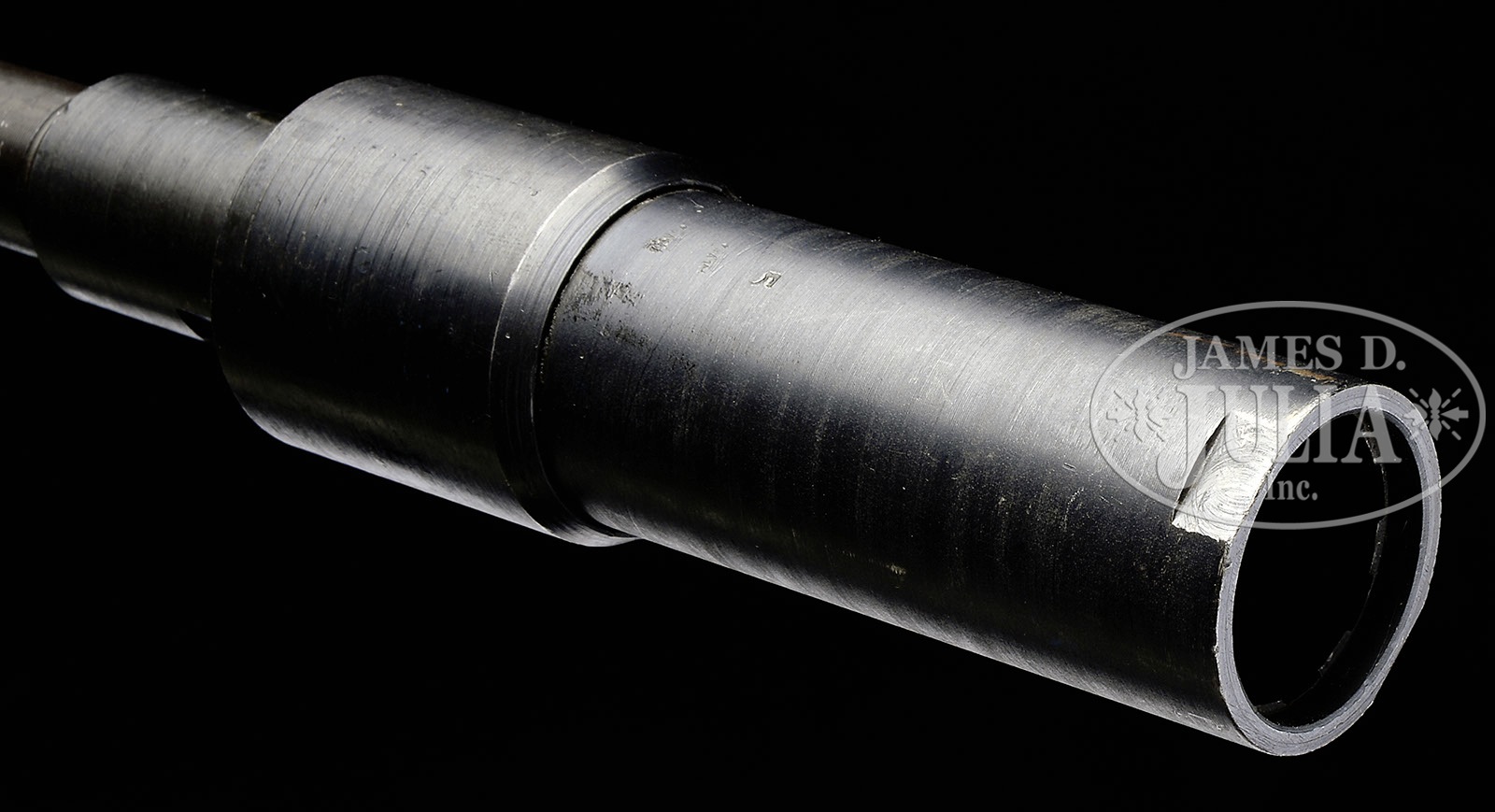 *◊ SPECTACULAR WORLD WAR II GERMAN STEYR GRB39 ANTI TANK GRENADE LAUNCHER.SN 12878. Cal. 7.92mm Patr. 318. Spectacular opportunity to obtain a museum quality example of the seldom seen Steyr manufactured Granatbuechse 39 (GrB39), used extensively in the early days of WWII. Originally developed from the PzB38 anti-tank rifle which first design used a newly developed siper-high velocity rifle caliber ammunition known as the Patrone 318 with armor piercing-tracer-lachrymatory bullet. The weapon was quickly found to be too heavy, and overly complicated and was thus lightened and simplified, and ultimately produced and adopted as the PzB39 in 1940. Nevertheless experience showed that the round was ineffective against most modern tank armor which was rapidly increasing in thickness and both models were too heavy. Thus, the vast majority were converted to grenade launchers (GrB39). This rare example is in orig wartime converted condition, and marked on the top receiver “GrB39 12878 bnz. 1941 1941” which indicates manufacture at the Steyr factory early in the war. The smooth bored (converted) bbl is dated “40”, marked “bnz”, while the rifled grenade discharge cup is marked “GrB39” and additionally with WaA. The weapon is overall profusely proofed with German “WaA 623” acceptance markings. Has excellent condition additional rear sight & sheet metal stamped front ranging sight graduated from 0 to 150 meters, as attached during the conversion process. This rifle comes with its orig carrying handle, orig wartime leather carrying sling and green leather padded shoulder stock. It also comes with a 1939 dated authentic but mis-matched bi-pod. Weapon appears complete and fully functional. PROVENANCE: Collection of Dr. Geoffrey Sturgess. CONDITION: Excellent overall. Retains 90+% bluing. Occasional scratch & ding, bore is shiny. Grenade discharge cup rifling is shiny with strong lands & grooves. Leather padding on buttstock shows some minor wear, but still very presentable & serviceable. Parts are mis-matched due to conversion from PzB to GrB configuration but appear contemporary to the launcher. 4-52024 DW28 (8,000-15,000) – Lot 3240