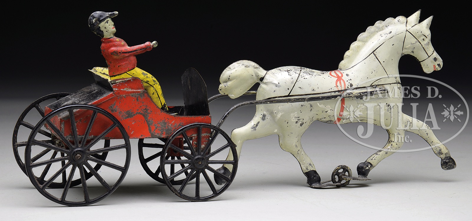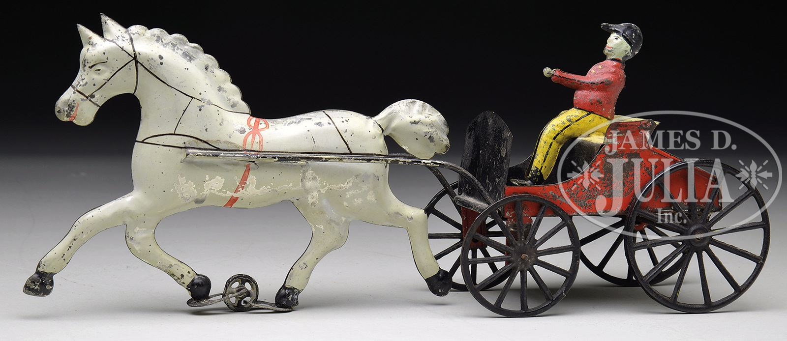 14″ DOCTORS CART WITH FULL BODIED HORSE.A great form and an unusually large size for a toy of this nature. The horse itself is finely detailed including its puffy tail, an abundance of black stenciled trappings and its figure-8 belly band. Seated figure (red on jacket touched up) has more of a jockey appearance than a doctor, so perhaps calling this toy a doctor’s cart is a misnomer. SIZE: 14″ l. CONDITION: Overall very good plus. 1-14206 (2,200-3,000) – Lot 3242 Auction: Advertising, Toy & Doll - Spring 2014 Please Note: All prices include the hammer price plus the buyer’s premium, which is paid by the buyer as part of the purchase price. The prices noted here after the auction are considered unofficial and do not become official until after the 46th day. |