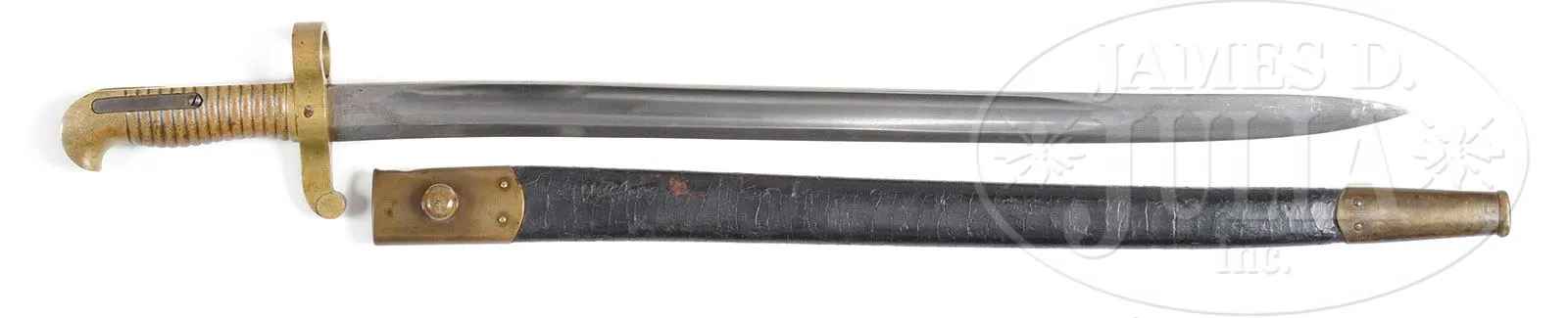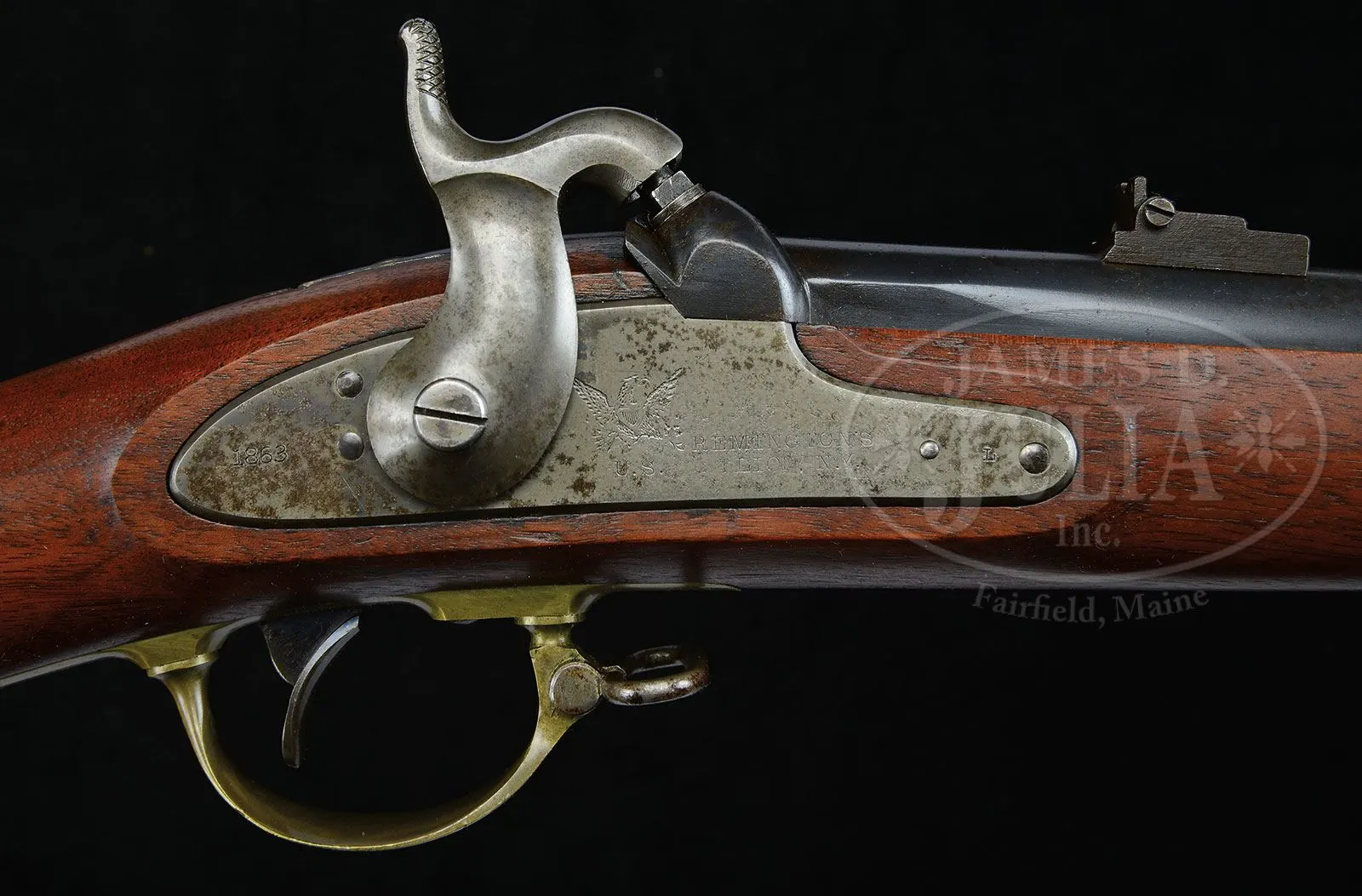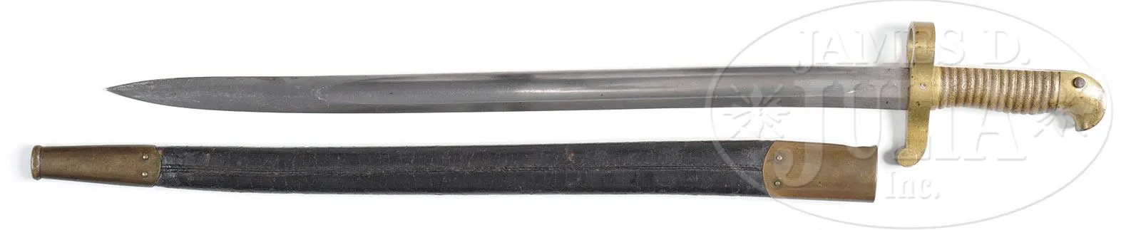 SN NSN. 58 cal. 33″ bbl. This is a fine example of the popular Remington Civil War rifle in extremely fine condition. This gun conforms to normal configuration with a blued rnd bbl with “VP”/eaglehead proofs and “1863″ date on bbl tang. Left side of bbl stamped “STEEL” followed by “HST” inspector mark, 2-leaf rear sight and distinctive Remington part cylindrical front sight and bayonet lug. This gun is brass mounted with two spring retained bbl bands, nose cap, trigger guard, buttplate and patchbox. These brass components each have small brass inspector’s initials such as “A”, “C”, “P” or “B”. Stock has two crisp inspector cartouches which appear to read “HDJ” and “BH”. This is a fine, complete and original example of the popular brass mounted Remington rifle with beautiful stock and metal retaining much of its original finish with a like-new shiny bore. Accompanied by proper inspected bayonet and scabbard which measures 21″ long, straight, with socketed brass grip and “birds head” pommel, concentric ring hand guard. PROVENANCE: LTC (r) Bert Millikin Collection. CONDITION: Very fine overall. Bbl retains 95%+ orig blue finish with areas of small nicks, dents and scratches. About 1/2″-1″ flawed area of bbl near rear band with numerous small dings and loss of color to brown. Bore is excellent with crisp, shiny rifling. Lock and hammer are gray/silver overall with scattered areas of staining and pitting and traces of case color. Brass is very good overall with scattered nicks, scratches and yellow patina. Stock is sound and solid with small storage scratches, dings and dents. Bayonet is very good, scabbard leather starting to dry out and chip, but sound. Inspector’s cartouches are crisp as can be seen in photographs. Mechanically gun functions well. This is a fine, complete and original example of the popular brass mounted Remington rifle with beautiful stock and metal retaining much of its original finish with a like-new bore. 4-51250 JS15 (3,000-5,000) – Lot 3245