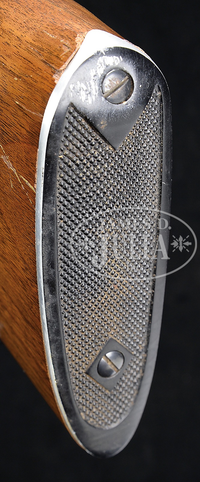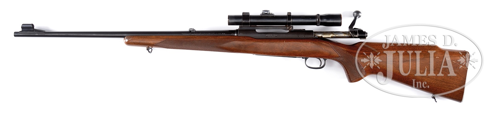 *WINCHESTER MODEL 70 FEATHERWEIGHT IN .308 WITH ALUMINUM BUTTPLATE AND SCOPE.SN 267876. Cal. 308. Standard configuration and markings with 22″ bbl, aluminum bottom metal, aluminum buttplate, and checkered walnut stock with Monte Carlo. Weaver K 2.5 scope with crosshair reticle is in old Redfield rings and one piece base. CONDITION: Excellent. Metal parts retain nearly all of their orig finish. Stock has a considerable number of light marks and scuffs. Heel of buttplate dented and scuffed with associated wood compressed, chipped and cracked. Bore is excellent. Action is smooth. Scope is good, optically good. 50604-16 MGM323 (1,500-2,500) C&R – Lot 3245