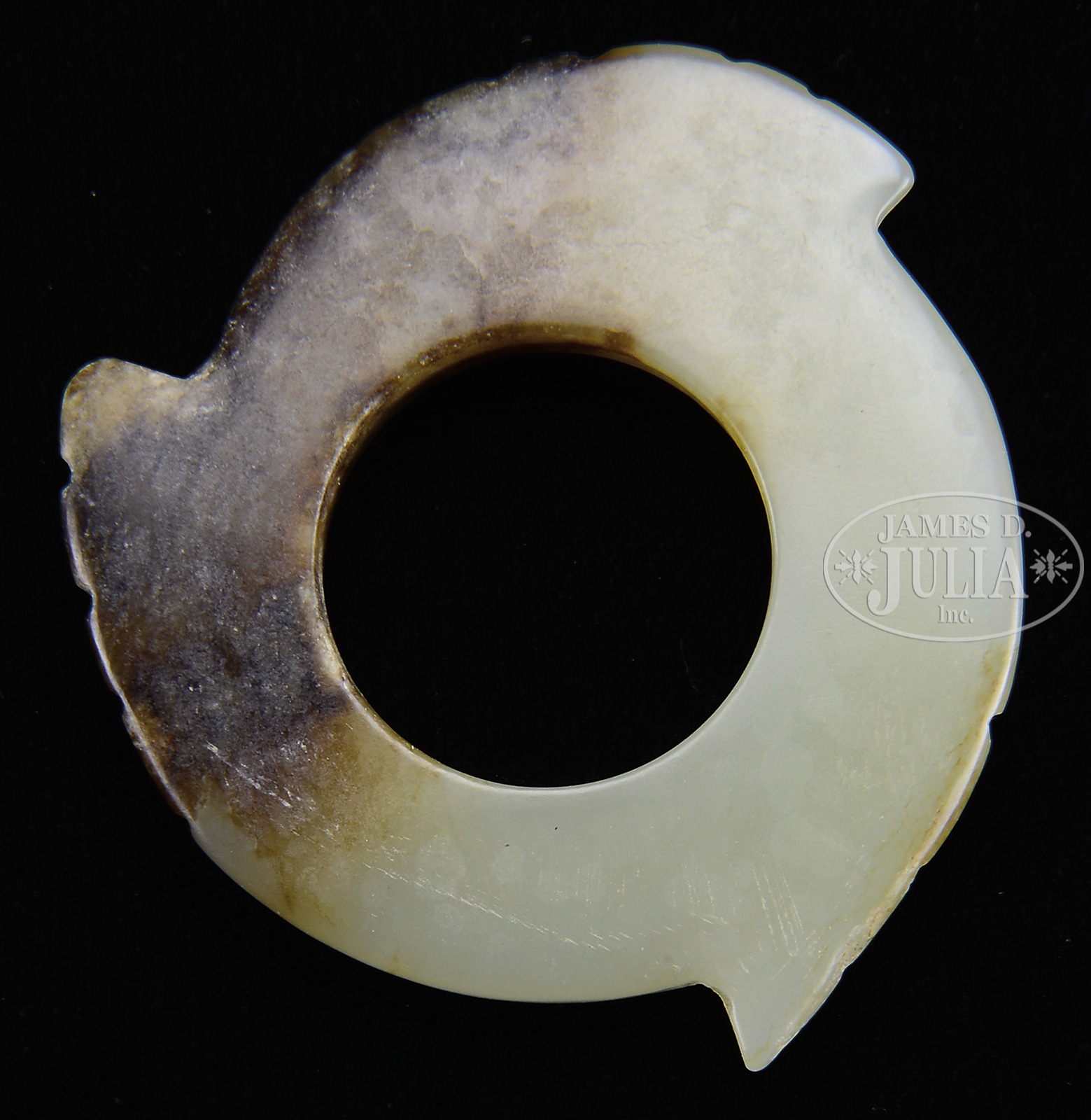 CARVED JADE DISC.Qing Dynasty period or earlier, China. Carved in the form of Xuan Ji, with russet on the side. SIZE: L: 1-7/8 in (4.8 cm). CONDITION: Good. 9-96966 (2,000-2,400) – Lot 3249
