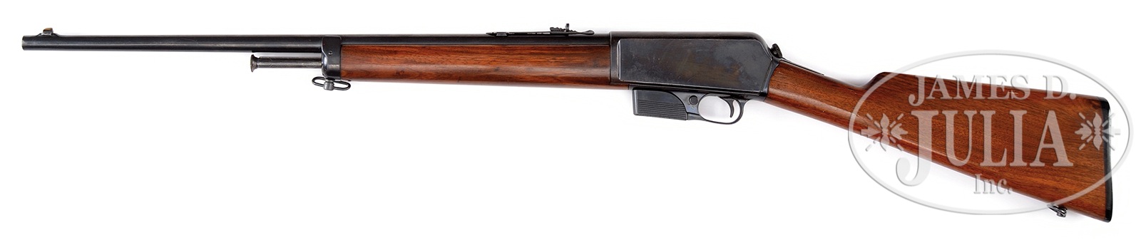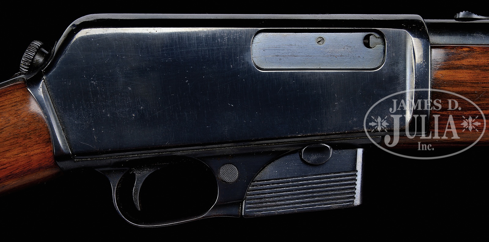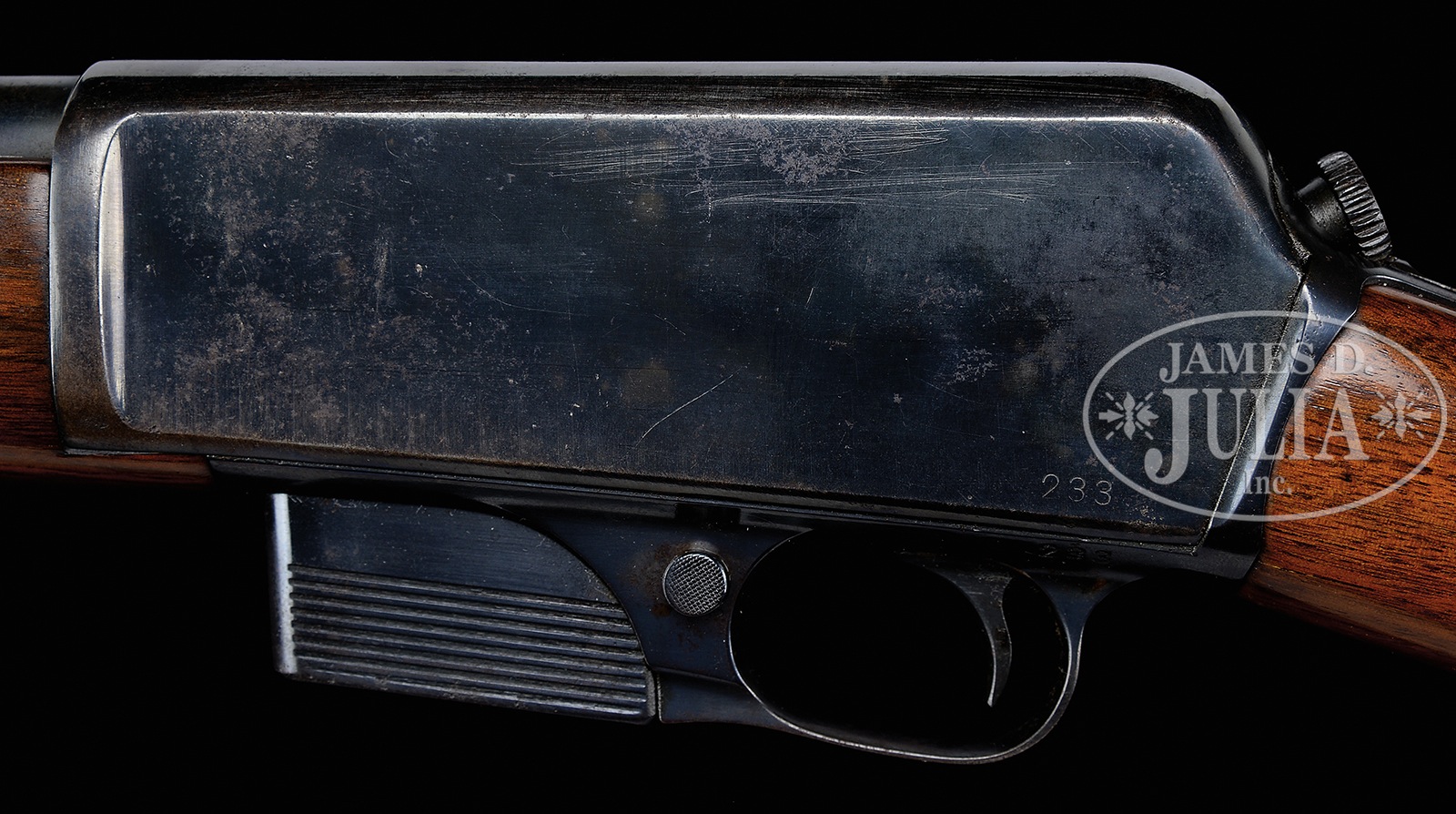 *WINCHESTER MODEL 1905 SEMI-AUTO RIFLE.SN 233. Cal. 35. Very early three digit SN. 22″ rnd bbl, open sporting sights. Takedown receiver. 5-shot removable mag marked “-.35 Cal.-” at bottom. Straight grip. Winchester logo hard rubber buttplate. Sling swivels added. CONDITION: Good as totally refinished. Bbl, receiver & forend cap have all been reblued. Roll stamp on bbl & proof marks muted. Blue shows wear & handling marks. Wood has been gloss refinished with metal now proud of wood. Bright bore with good rifling & minor pitting. Mechanics appear sound. 50974-3 TJW (750-1,250) C&R – Lot 3249