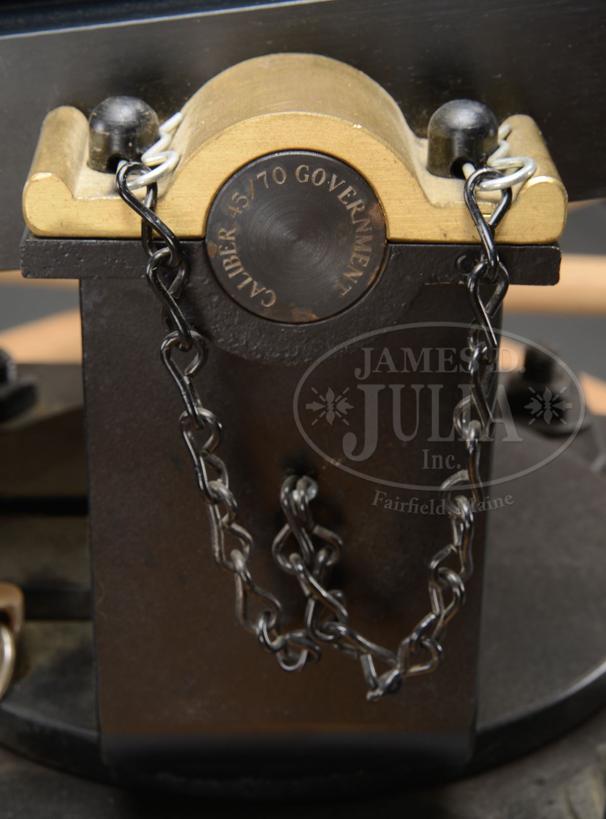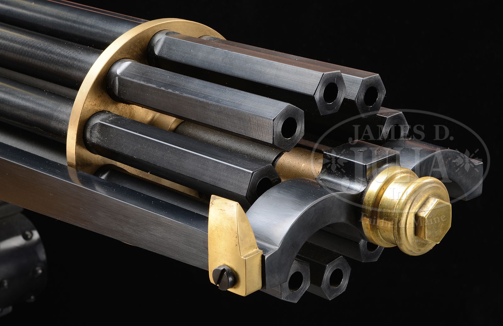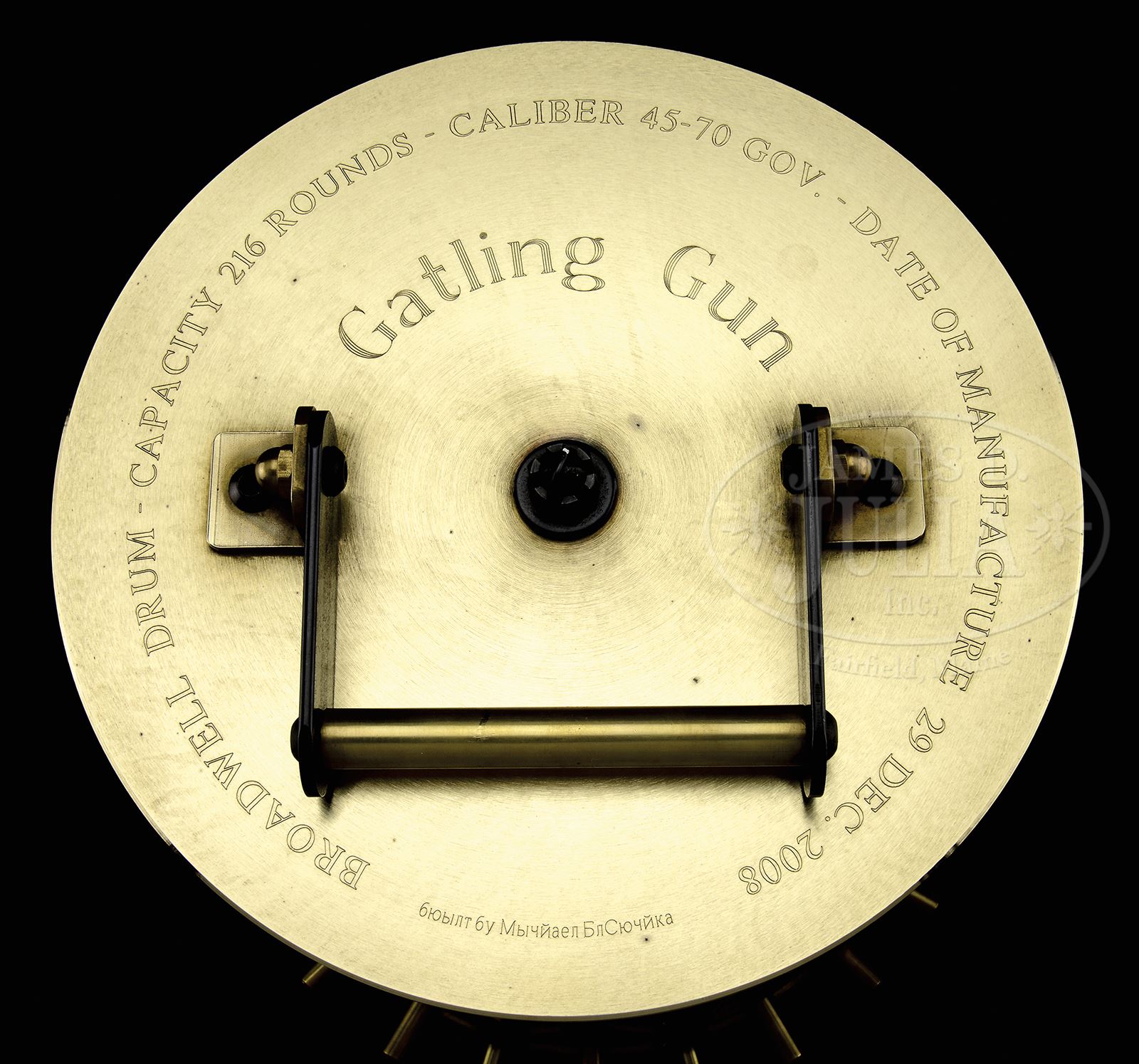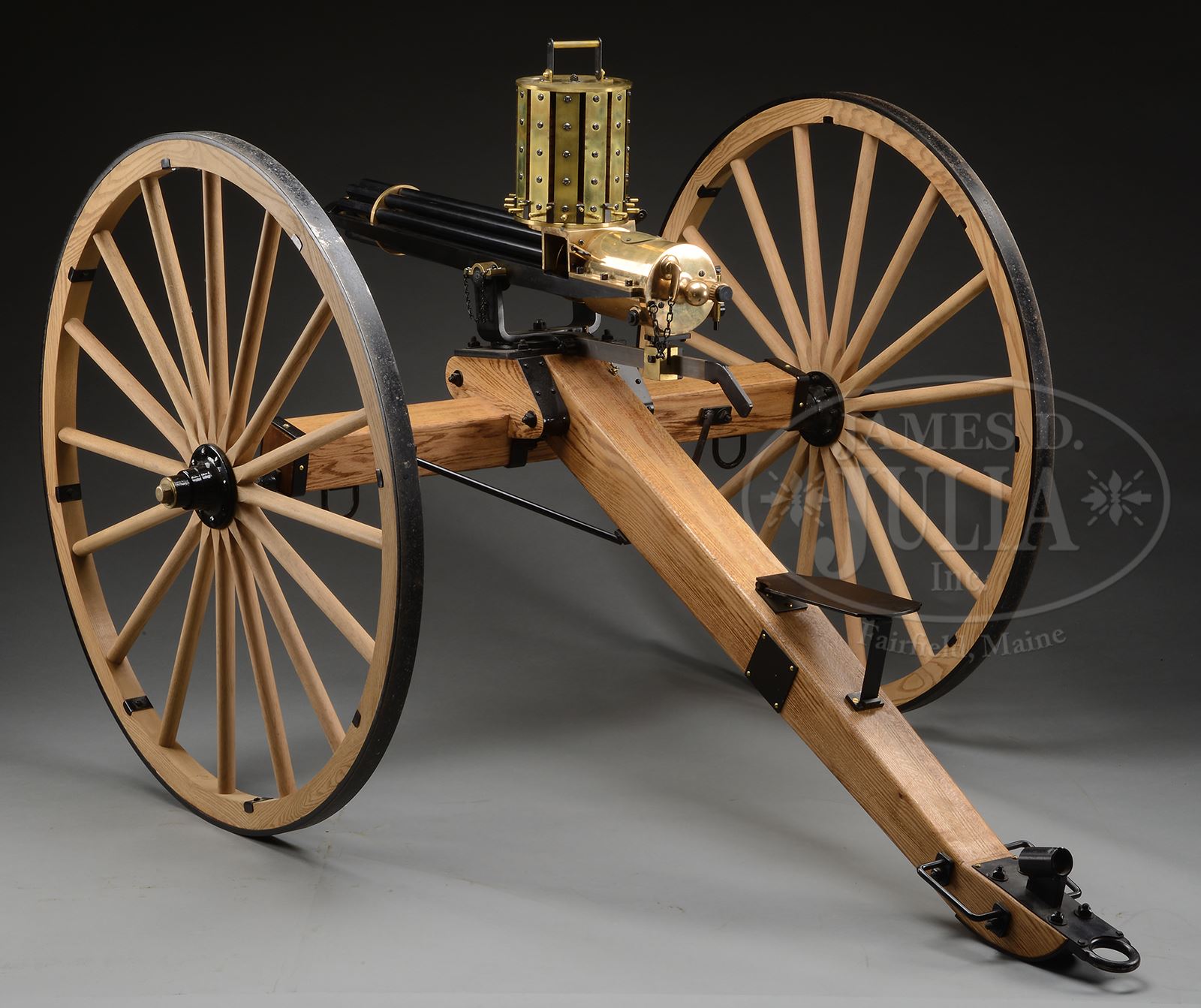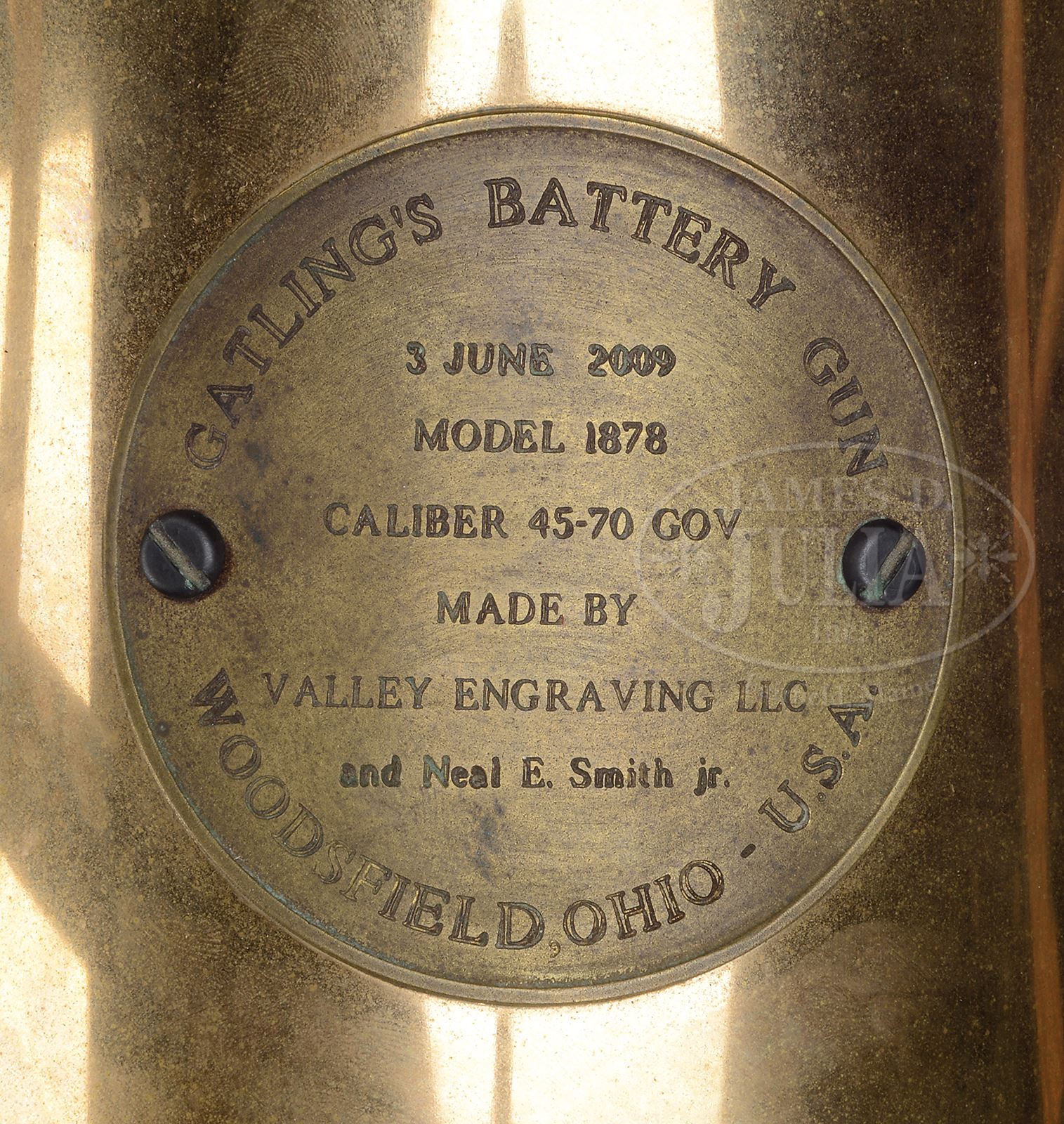 *VALLEY ENGRAVING REPRODUCTION GATLING’S BATTERY GUN MODEL 1878.SN 011-005F. Cal. 45-70. Wonderful reproduction 10-barrel Gatling with 32″ bbl cluster mounted in orig type brass housing with steel frame. Trunnions are 1-1/4″ and the cascable is 2″. The articulated magazine base is for a Broadwell drum. Mounted in an iron yoke on iron furniture, all of which is mounted on an extraordinary reproduction oak carriage with correct concave, iron bound wheels that have ash spokes and an oak rim with 1/2″ thick steel outer rim. Accompanying, in brackets under the trail, is the iron tipped oak tiller. Top of the rear housing is fitted with a 3-1/2″ rnd plate bearing the manufacturers name & address, the date 3 June 2009, Model 1878, Caliber 45-70 Gov., made by Valley Engraving LLC and Neal E Smith Jr. Accompanied by 2 reproduction Broadwell drums, engraved on the top plate, “BROADWELL DRUM / CAPACITY 216 ROUNDS / CALIBER 45-70 GOV DATE OF MANUFACTURE 29 DEC. 2008” along with a line of Cyrillic writing. Both drums have brass and iron carrying handle on top. Few reproduction Gatling guns reach this level of sophistication or attention to detail. CONDITION: Appears to be new and unfired, retaining virtually all of its fine orig finish to both gun and carriage. Mechanics are crisp. Bright shiny bores. 49318-10 JR (55,000-75,000) – Lot 3251
