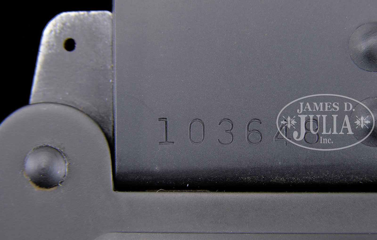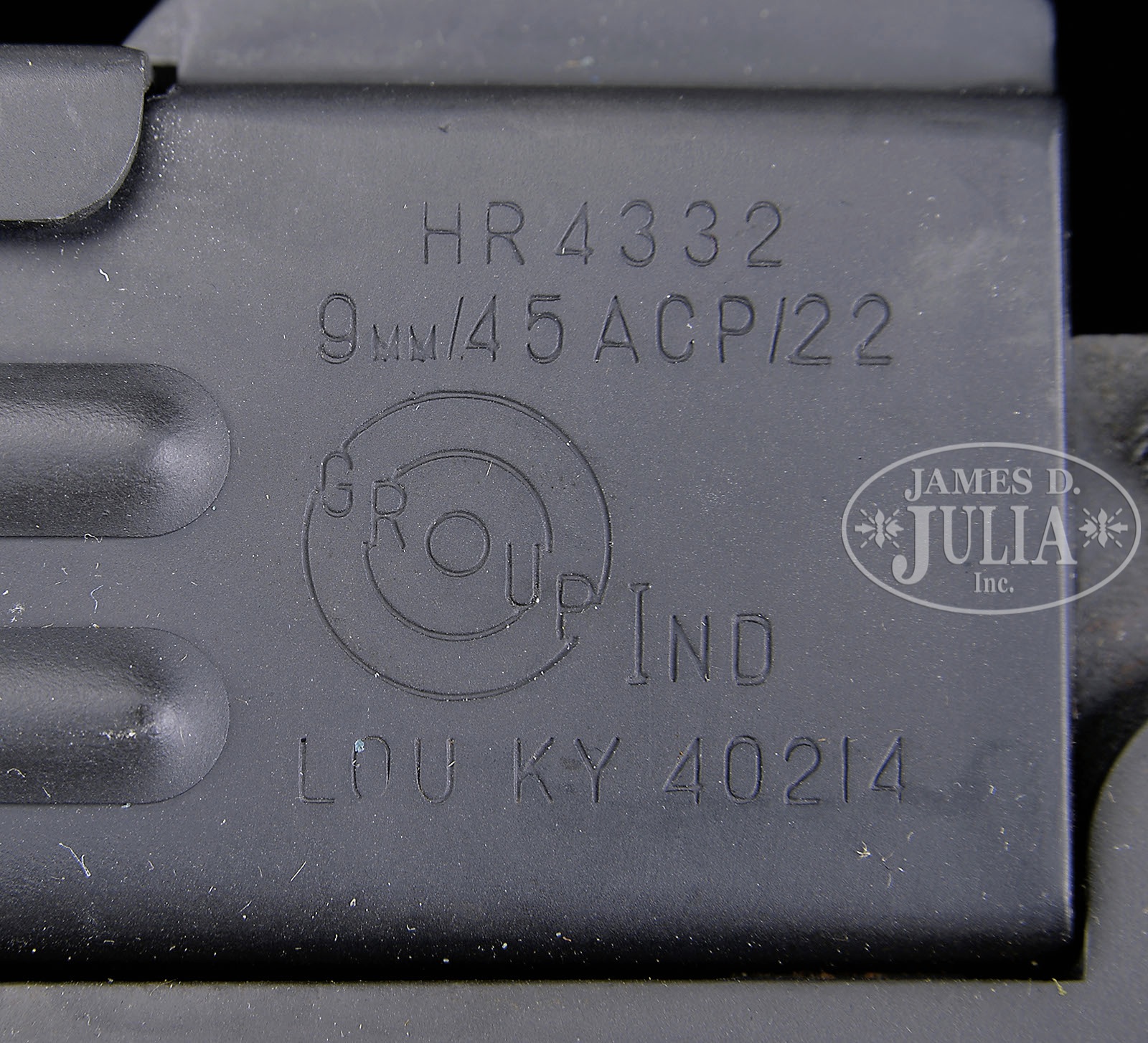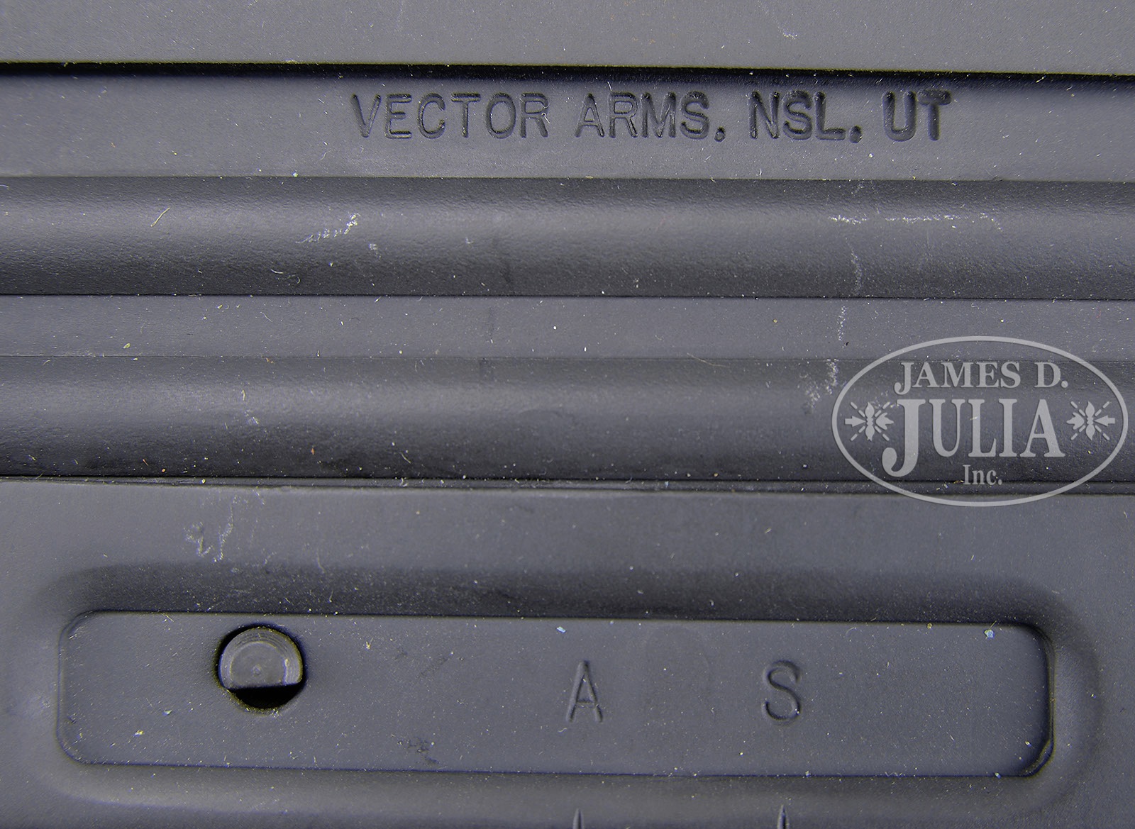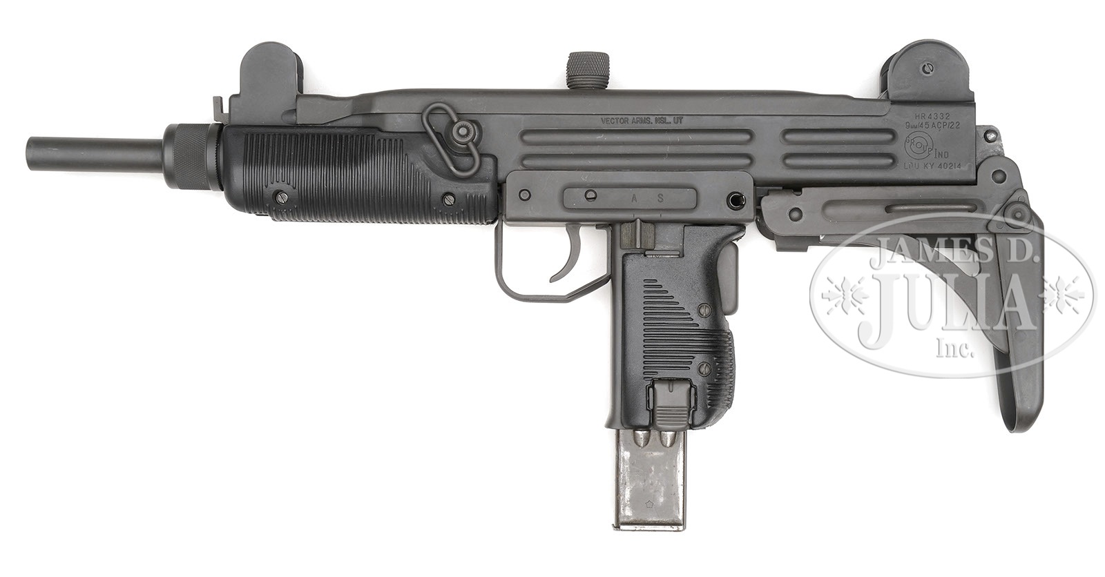 **UZI SUB MACHINE GUN ON GROUP INDUSTRIES REGISTERED RECEIVER IN BOX (FULLY TRANSFERABLE).SN 103648. Cal.9mm with 10-1/4″ bbl. IMI manufactured parts on Group Industries receiver marked “VECTOR ARMS. NSL.UT” with web sling. Accessories include five magazines and one Desert Publications Uzi SMG Operation Manual, with Vector Arms warranty sheet inserted between the pages. All contained in white cardboard box with last four digits of SN in black ink on one end. A real top quality job was done putting this one together. Firing mechanism functions smoothly when operated by hand. This weapon appears fully functional. CONDITION: Overall condition is as new. 99%+ orig gray Parkerized finish with only the slightest of blemishes where the cocking handle touches receiver. Folding stock works perfectly. Sling is of excellent quality and condition. Bore is mirror bright and excellent. Three of the magazines have a smooth gray finish, two show more use, one of which has white paint on the floorplate. It would be just about impossible to upgrade the condition of the Uzi. Sure would be a lot of fun to shoot. 4-51040 JWK6 (5,000-8,000) – Lot 3252