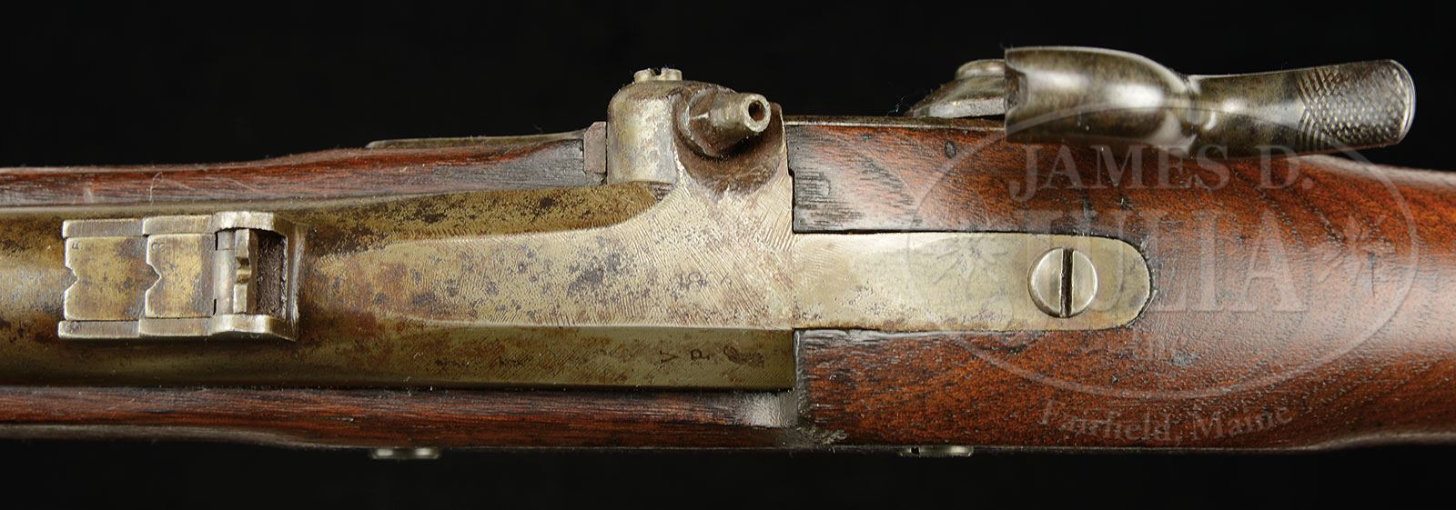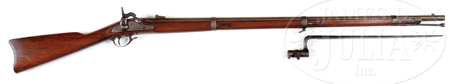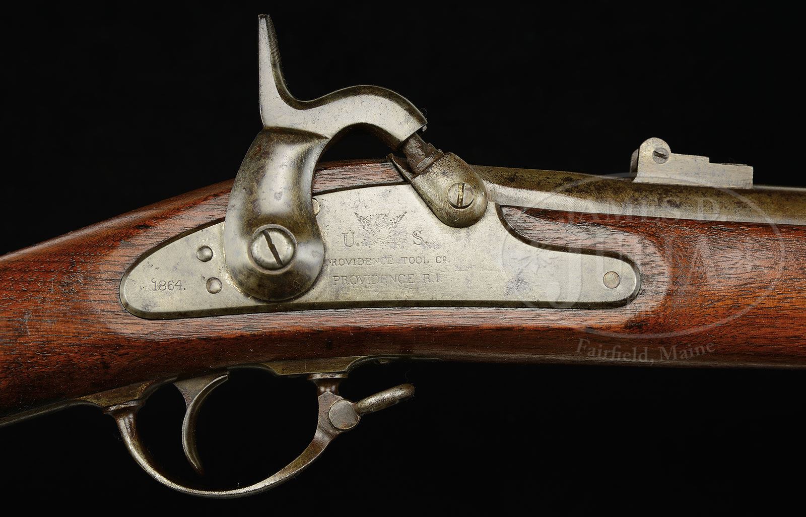 SN NSN. 58 cal. 40″ bbl. This is a very good example of Civil War “Providence Tool Company” contract of which a total of 70,000 model 1861 rifled muskets were delivered during the war to U.S. Government. Consistent with other 1861 contracts being iron mounted, fitted with three flat bands that are spring retained, two leaf rear sight and swelled tulip tip ramrod. This gun is properly marked “US/PROVIDENCE TOOL CO/PROVIDENCE RI” with Eagle forward of hammer on lock and “1864” on tail of lock and on bbl flat with “VP/Eagle Head” proof and inspector initial “M” found on left side of breech. There is a single inspectors cartouche stamped opposite lock as can be seen in photos. Providence Tool Company unlike many contractors fabricated every part of their gun with a possible exception of the rear sights. Though this gun is dated 1864 it most likely predates June 10 as single leaf rear sights had been adopted and this gun still exhibits the earlier standard 1861 pattern two leaf sight. This particular contract is very good condition and appears 100% orig and complete in every regard. PROVENANCE: LTC (r) Bert Millikin Collection. CONDITION: Good to very good overall. Metal is gray/brown showing old cleaning, staining and tool and file marks especially around breech. Markings are all discernible though bbl date is weak or partially obscured by file marks. Stock is sound and very good overall with one 4″ crack near butt and rounded edges where sanded, cartouche still fully discernible as can be seen in photos. This gun functions mechanically and has discernible rifling though pitted overall.The accompanying bayonet is in good matching condition, fits gun well. 4-51247 JS12 (2,000-3,000) – Lot 3252