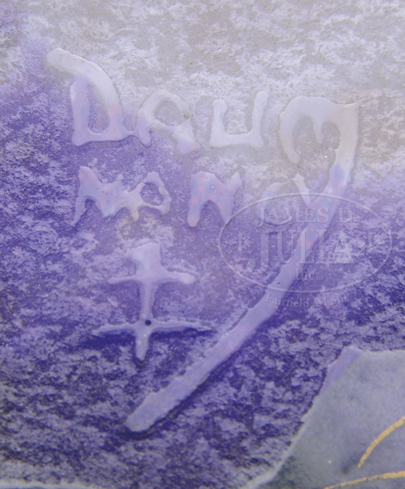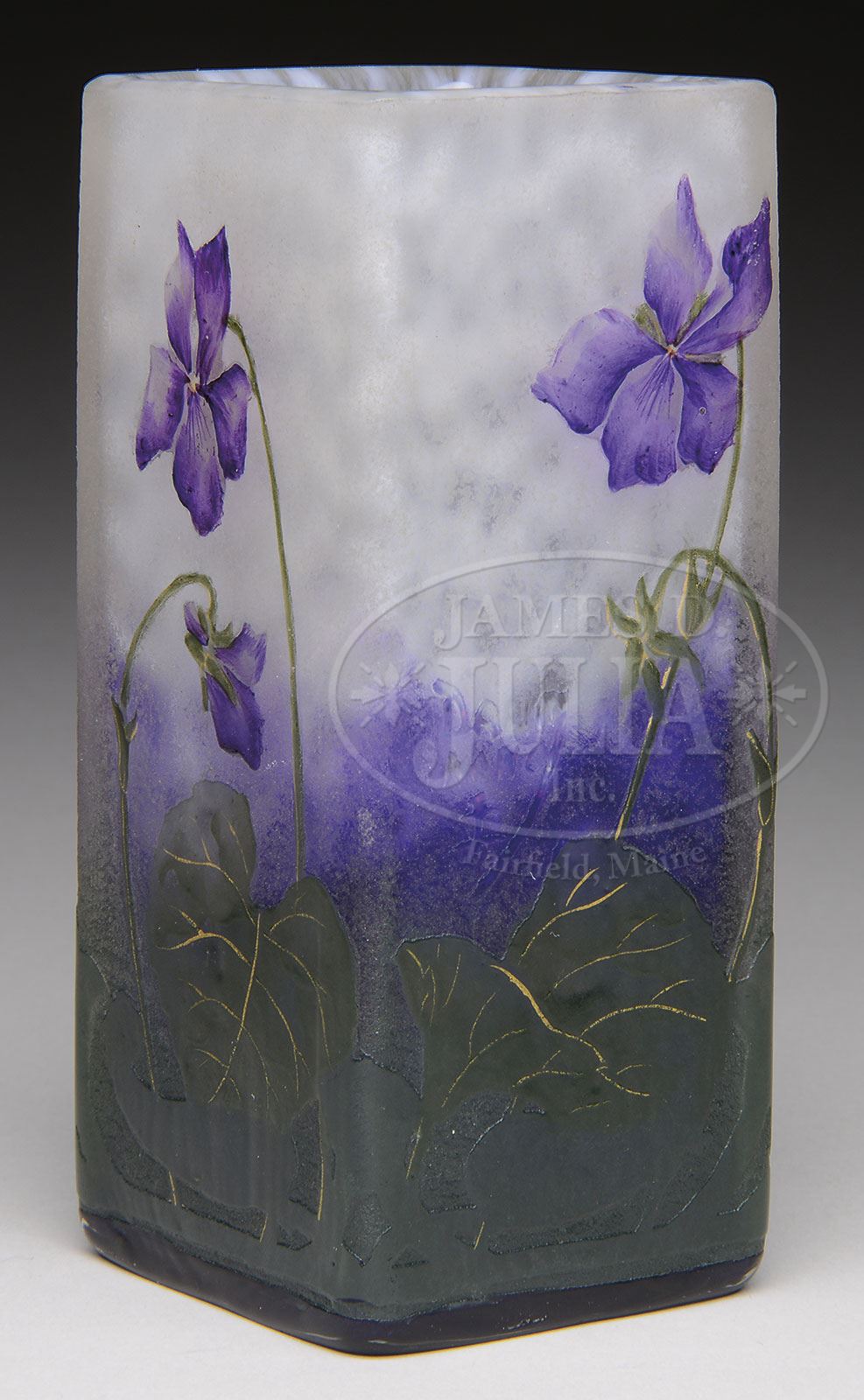 DAUM VIOLET VASE.Daum square vase is decorated on each side with cameo violets. The stems and leaves are enameled in green with gilded highlights while the violet flowers are enameled in shades of purple all set against an acid textured mottled purple shading to white background. Signed on the side in cameo “Daum Nancy” with the cross of Lorraine. SIZE: 4-3/4″ t. PROVENANCE: Private New England Collection. CONDITION: Very good to excellent. 5-69297 (1,000-1,500) – Lot 3253