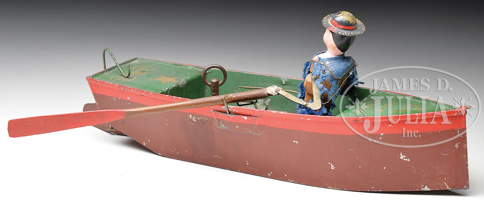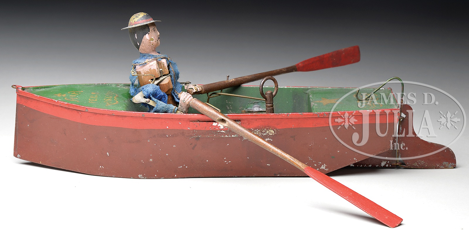 IVES CLOCKWORK ROWBOAT.Other than the clothing on this toy from the latter part of the 1800s this toy retains exceptional original paint. The green decking stenciled with gold lettering has a patent date of February 9th, 1869 and oftentimes various names were stenciled onto the boat as well. This particular example is lettered “Carrie”. When the mechanism is wound the child would place this boat in a pond and the gentleman oarsman would row furiously about in the water. Typical of Ives, they utilized figures with wooden bodies and an applied and painted brass mask face. Overall a fine example of a most impressive toy that is well over 100+ years old. The toy retains its original wooden oars which are oftentimes lacking and/or replaced. A really neat toy that is visually attractive as well as mechanically interesting. Seldom does one find a fine example such as this gently used piece. SIZE: 11″ long. CONDITION: As stated above, clothing is original but in poor condition and as is also typical the tin motor covering is an older replacement. 1-13893 (2,000-4,000) – Lot 3256 Auction: Advertising, Toy & Doll - Spring 2014 Please Note: All prices include the hammer price plus the buyer’s premium, which is paid by the buyer as part of the purchase price. The prices noted here after the auction are considered unofficial and do not become official until after the 46th day. |