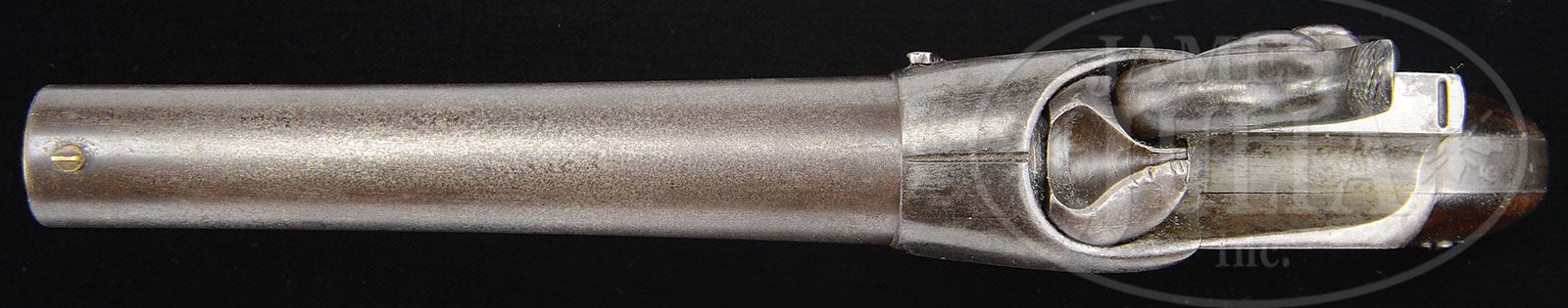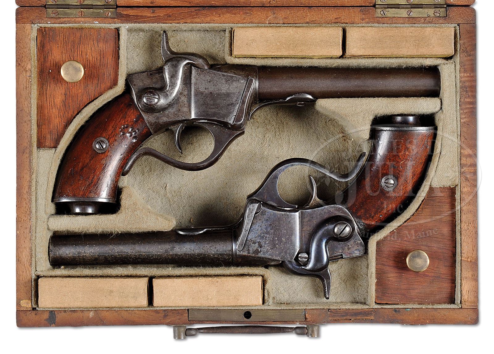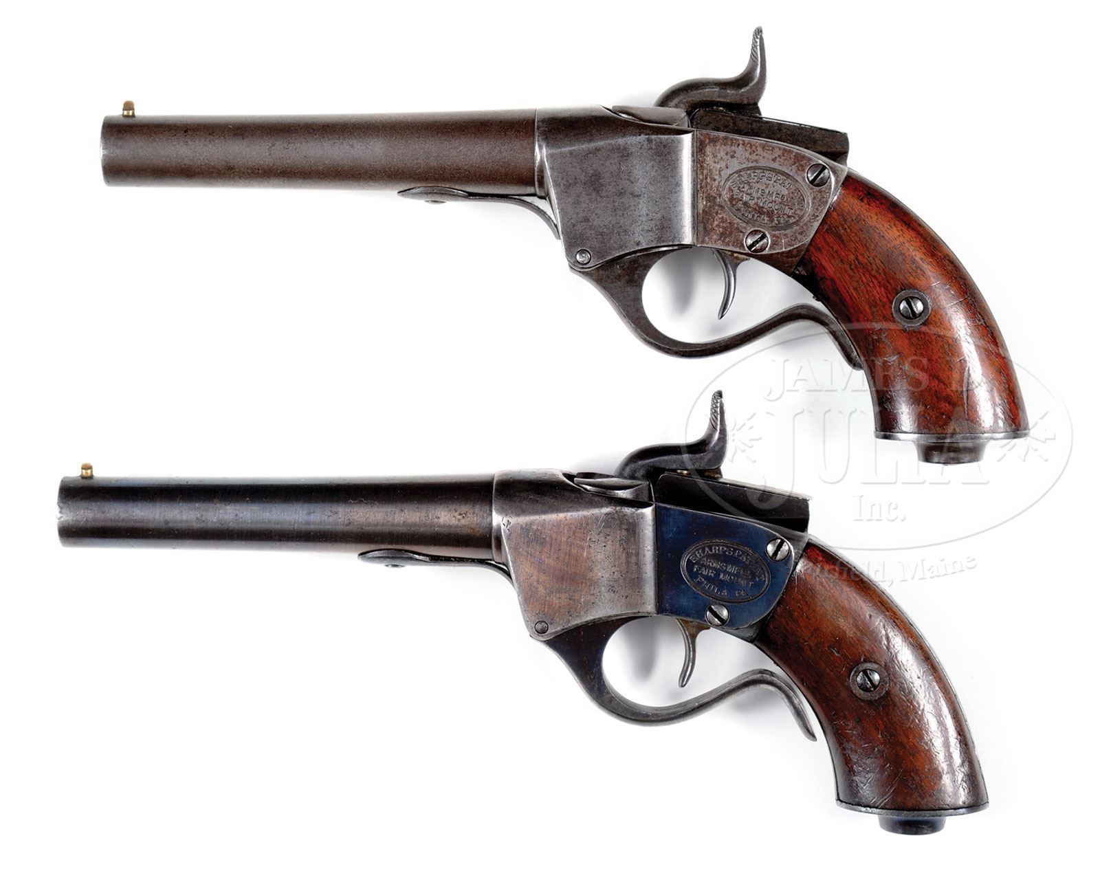 RARE PAIR CASED SHARPS FIRST TYPE BREECH-LOADING SINGLE SHOT PISTOLS.SN 4,319. This is a beautiful pair of the earliest Philadelphia produced Sharps pistols about 1856. This pair includes SN 4 which was made without bolster which few examples are known and less than 75 were made. A total of less than 500 small frame single shot pistols were made and our second example is SN 319 which has bolster. Both these guns conform to other surviving specimens with 5″ bbls, 34 Cal. with 5-lands and grooves. These guns also utilize Sharps pellet priming system. Guns were blued and case hardend. These exceptionally well made guns appear to have frames and grip straps machined together from a single block of metal. Matching SNs are found internally on breech blocks, left side of grip frame and on each left grip and externally on left side of lever and on backstrap. SN 4 is pictured and detailed on p.109 of of Frank Sellers text Sharps Firearms. This is a fine pair of scarce pistols including the rarely encountered early first type made without bolster. PROVENANCE: Collection of John Montague. CONDITION: SN 4 is very good to fine overall retaining strong traces of bright finish in protected areas. Metal overall is mottled gray with fine pin prick pitting in areas. Stocks are well fit with numerous small scratches and dents, still retaining about 50% orig varnished finish. Mechanically gun functions well with crisp bore. SN 319 is also very good to fine overall with remnants of an old refinish especially on frame. There are scattered areas of freckling and pin-prick pitting with small dents and dings on top of bolster and frame. There is a crack in the lever spring. Stocks are well fit retaining about 30% of their orig varnish. Mechanically gun functions well and bore exhibits strong, crisp rifling. Markings are crisp on both guns. Accompanying casing is for display only but present guns nicely including four reproduction cartridge packs. 4-54365 JS214 (8,000-12,000) – Lot 3256
