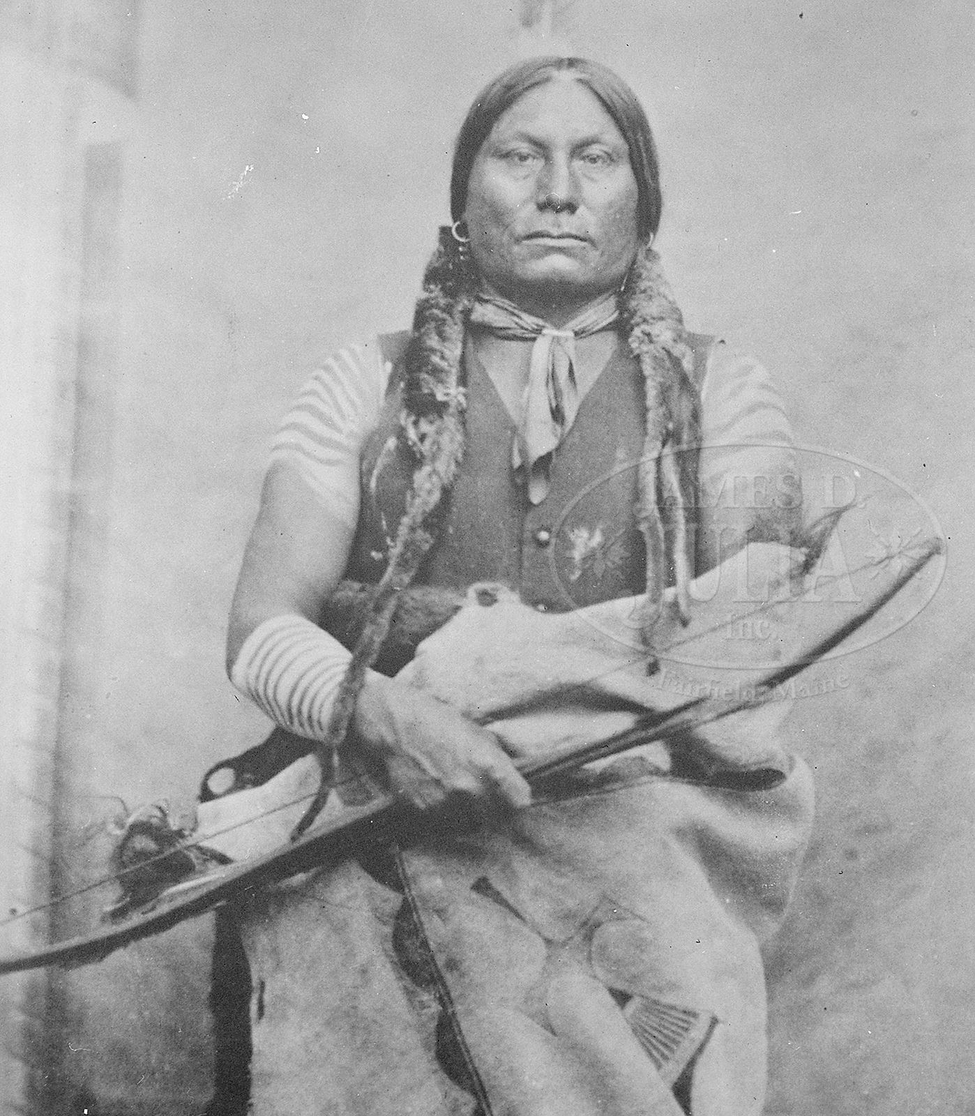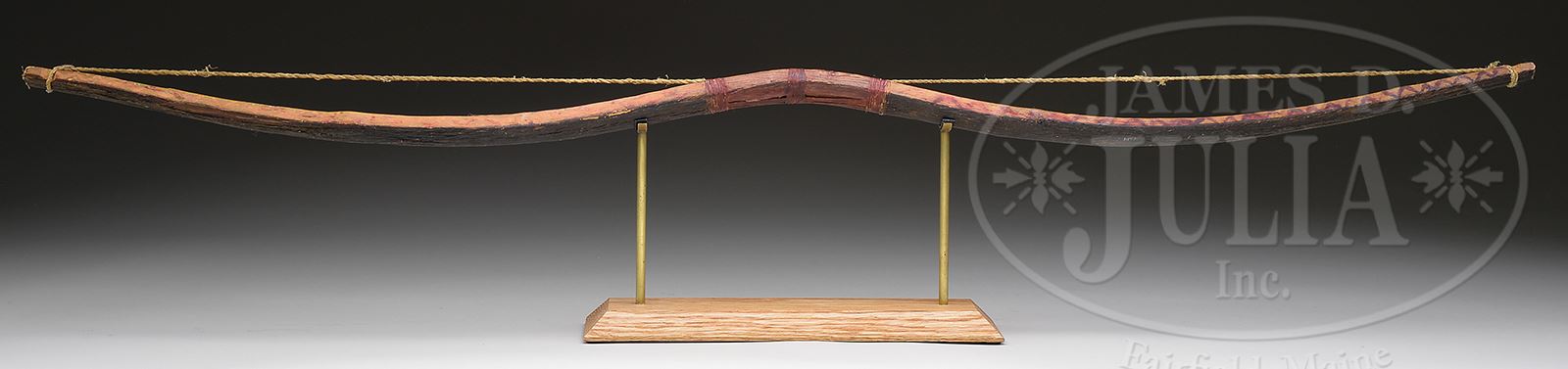 This wonderful decorated Sioux Bow, 41″ tip to tip and may be the bow that Chief Gall is seen holding including a famous photograph made of him by David F. Barry about 1881. An old worn typed label reads “Sioux Buffalo Bow / Gift from Chief Pezi” (Gall) / Standing Rock Res / Donated by J McLaughlin”. James McLaughlin author of My Friend The Indian, was long time Indian agent, present at Standing Rock Reservation from 1881 – 1890. McLaughlin knew Gall very well and writes prominently about his close personal friend, though not specifically stating this gift, but we are told other McLaughlin Indian objects are noted with similar typed tags. Though Gall is not as well known in the Custer massacre as Sitting Bull or Crazy Horse, Gall was indeed among the fiercest warriors. In the first volley, Gall’s two wives and three daughters were killed. An excellent biography on Gall by Robert Larson, Gall, Lakota War Chief, “A particularly bitter factor in the deaths of most of Gall’s family in 1876 was the involvement of Gall’s old nemesis Bloody Knife. Little Sioux, one of the Arikara warrior scouts who preceded Reno’s crossing of the Greasy Grass, claimed in a later interview that he and three other Arikara scouts saw three women and two children running as fast as they could toward the river. He fired twice at them, and then he and his comrades rode through the timber toward the river, where they killed all of them. Whether or not any of these victims were members of the Gall family cannot be proven with certainty, but Bloody Knife’s involvement in this phase of the battle seems unquestionable. As Custer’s chief Indian scout, he was probably at the head of this scouting party, searching for ponies and not being averse to killing Lakota families in the process. Obviously Gall was grief stricken when he saw the dead bodies of these family members. the Little Bighorn would mean glory for many of his comrades, but it would be an almost unbearable personal tragedy for him. He no doubt pondered the irony of this tragic development. He was one of the fiercest of the Lakota warriors, and yet he could not protect his own family. Of particular surprise to him was the fact that Reno’s troopers, as well as those hated Arikara scouts, got close enough to kill the most defenseless members of the Hunkpapa camp. Had the distraught war leader made this discovery upon his first return to camp, he would have vigorously pursued Reno’s troopers to their final defensive position on the hilltop east of the Little Bighorn. Revenge would have been his overwhelming emotion. When he finally did recover from his crippling anguish, startled by the sound of increasing gunfire to the north, his mood was dominated by a thirst for vengeance. “It made my heart bad,” he later remarked. “After that I killed all my enemies with the hatchet.”” This particular title also shows good 1881 D.F. Barry facsimile photograph on p. 139, owned by Historical Society of North Dakota, showing Gall with quite possibly this bow. Rarely do historical bow’s or other objects directly relating to prominent Indians from the Battle of The Little Big Horn ever come to market. CONDITION: Very good to fine overall. Bow retains good red, black and yellow decoration with wear where held sinew wrapped decoration is intact and bow string is present though knot loose on one end. Accompanying pasted tag is soiled but still discernible. It is interesting to note that the decorations there are 9 light stripes on one internal edge near center and 7 light stripes on other side of middle and that Gall wore 9 white stripes on his right forearm which I have not noted on other American Indians as decorations. Accompanying custom stand is very good as is. Accompanying copy of Larson’s biography. 49129-1 JS (20,000-40,000) – Lot 3256