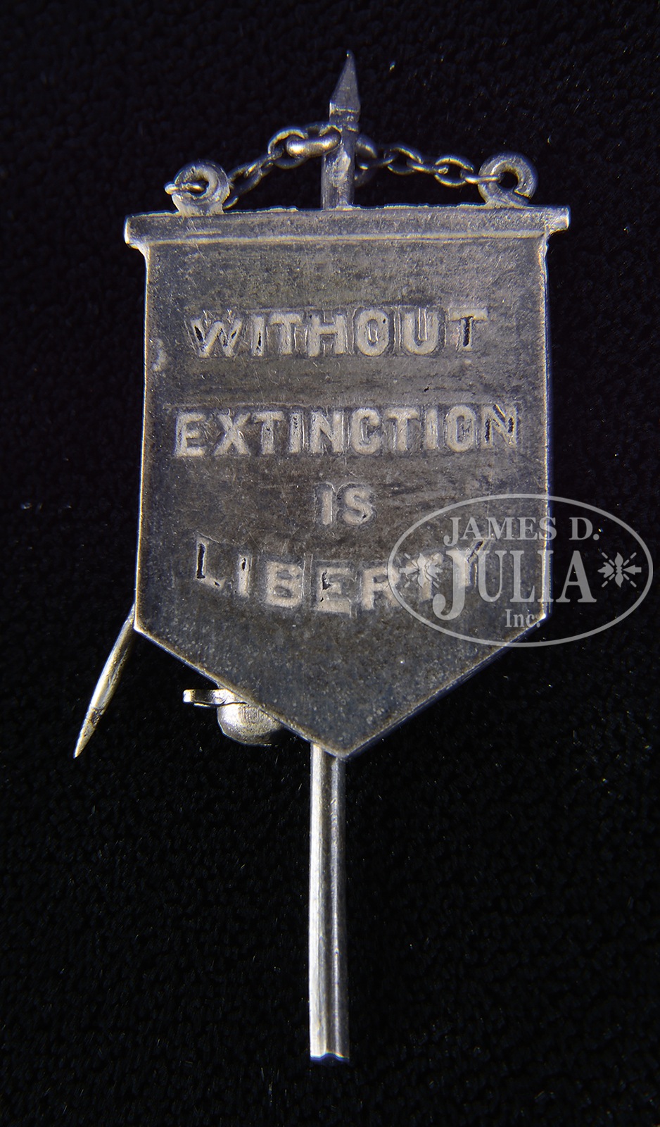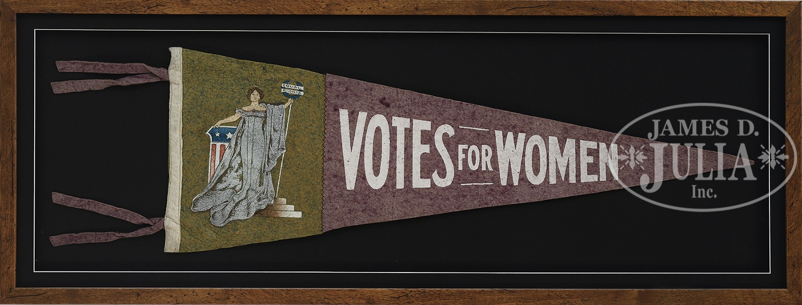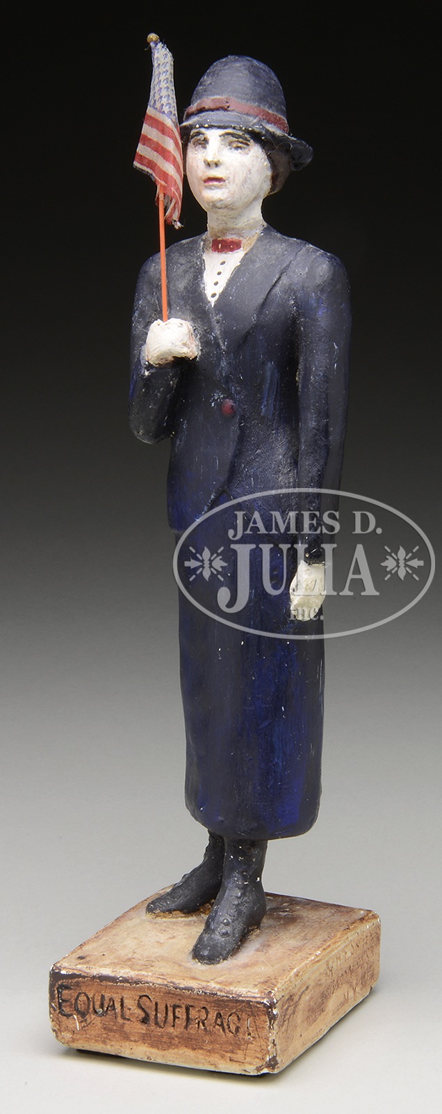 THREE SUFFRAGETTE RELATED ITEMS.1) 11-1/2″ h chalk figurine of a woman holding flag titled “Equal Suffrage”. 2) 1-1/2″ National Women’s Party sterling miniature banner pin. The pin titled “Without Extinction is Liberty”. 3) 33″ l Framed felt pennant “Equal Rights Vote’s for Women”. Housed in a shadowbox frame against black background. (37″ x 14″ framed). PROVENANCE: From the personal estate collection of John W. Armiger Jr. CONDITION: Statue has crack in leg, good. Pin is very good. Pennant with fading. 49055-15 (4,000-5,000) – Lot 3256