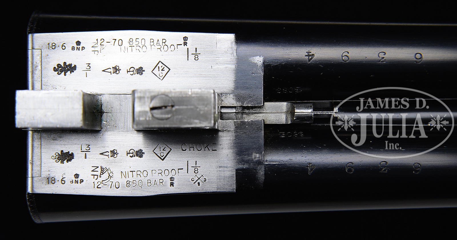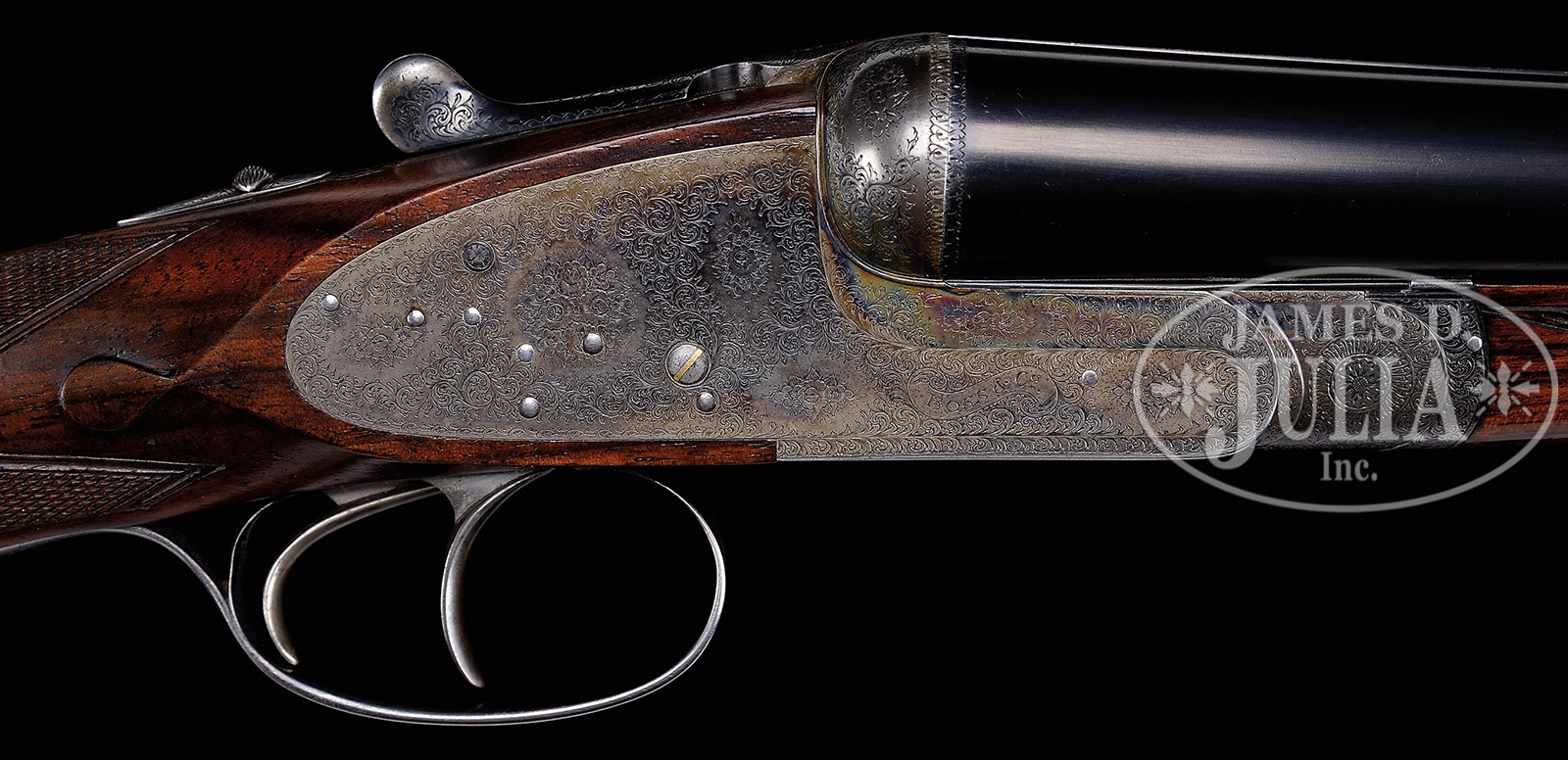 *LOVELY OLD BOSS SIDELOCK EJECTOR GAME GUN WITH CASE AND ACCESSORIES.SN 6394. (ca 1913) Cal. 12 ga. 29″ Chopper lump steel bbls are engraved “Boss & Co, 13, Dover Street, Piccadilly, London. W” on narrow, swamped game rib. Bbl flats are stamped with London nitro proofs for 1-1/8 oz of shot and 2-1/2″ chambers, and later Birmingham re-proofs for 2-3/4′ chambers. Bottoms of bbls are stamped with SN. Case hardened sidelock action is stocked to the fences and features non-automatic safety (SAFE inlaid in gold), gold band tumbler end cocking indicators, and dbl triggers. Action is engraved in Boss house style with full coverage rose and scroll incorporating 19 rose bouquets in the style of, and most likely executed by, Jack Sumner. “Boss & Co” is in scrolling riband on the front portion of each lockplate, and over “PATENT” on bottom of action. Blued and scroll engraved single beaded trigger guard has SN in relief on tang. Nicely streaked and lightly figured European walnut straight grip buttstock measures 15″ over old brown leather covered pad. Stock features typical drop points and flat top point pattern checkering with mullered borders, as well as a small gold oval on toe line engraved “JRC”. Matching splinter forend has Anson release and is fitted with Boss’s excellent and renowned ejector system. Bore diameter: left -.729, right – .729. Bore restrictions: left – .011 (lt mod), right – .008 (IC). Wall thickness: left – .026, right – .024. Drop at heel: 2-1/4″, drop at comb: 1-1/2″. Cast off approx 1/2″. Weight: 6 lbs. 12 oz. LOP: 15″. Makers oak and leather case with brass corners is embossed “R. I. B.” on top, and has relatively new green canvas trimmed outer cover. Case has some parcel post stamps affixed to top. Interior is lined in burgundy cloth and has large paper Boss label in lid. Label is originally printed with St. James’s Street address, which has been lined out in red, with two stamps at upper corners stating “PLEASE NOTE THE NEW ADDRESS, 13, DOVER STREET PICCADILLY.” Also on the lid is a small label regarding re-cocking of ejector hammers. Case contains a 2-pc brass and rosewood cleaning rod with short handle, pair of Boss marked snap caps, square oil bottle, bench cloth, and two keys. CONDITION: Very fine, as partially refinished. Bbls retain over 95% of a fine quality re-black, engraving still sharp and clear. Action and lockplates retain 60 – 70% orig case hardening color, silvered on bottom, beads, and fences from normal hand wear. Top lever is silvered on thumbpiece. Trigger guard is silvered on sharp edges and bead, considerably so at grip. Stocks retain nearly all of a good quality hand rubbed oil finish, sharp edges preserved, checkering nicely freshened. Bores are excellent, nearly perfect, with one or two very minor shallow spots in right bbl toward breech end. Action is tight. Bbls are on face. Ejectors are strong and in time. Case leather has considerably darkened and has a number of rubs and scuffs. Straps and handle are good. Interior cloth is fine with some insect damage at edges in lid, with compressions and soiling. Partitions are tight. Label is excellent, lightly foxed overall with a small rub through from contact with fence. Small ejector label has some soiling. Accessories are good. A fine classic Boss that measures well in all respects. 50430-1 MGM44 (28,000-48,000) C&R – Lot 3256