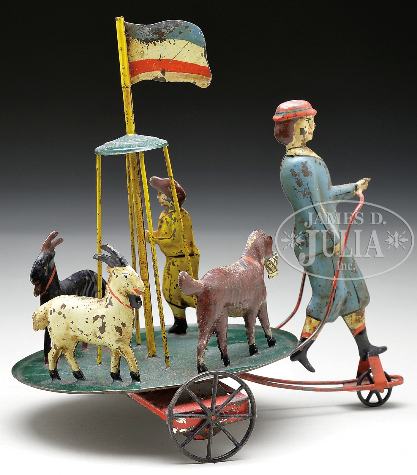 EARLY AMERICAN TIN MERRY GO ROUND TOY.A most unique form depicting a gentleman on a three wheeled base with a circular merry go round with three animals and a child behind him. When the toy is pushed along the floor, the platform would spin in a counter clockwise motion. Two goats and a dog with a basket along with a youth are on the platform. Toy itself and its form appear to be an original entity but there has been significant overall restoration to this toy. Still with this in mind, it is quite appealing and noteworthy. Perhaps the original maker was George Brown but no definitive attribution can be made. SIZE: 8-1/2″ l x 8-1/2″ h. CONDITION: As stated above. 1-13890 (1,500-2,500) – Lot 3257 Auction: Advertising, Toy & Doll - Spring 2014 Please Note: All prices include the hammer price plus the buyer’s premium, which is paid by the buyer as part of the purchase price. The prices noted here after the auction are considered unofficial and do not become official until after the 46th day. |