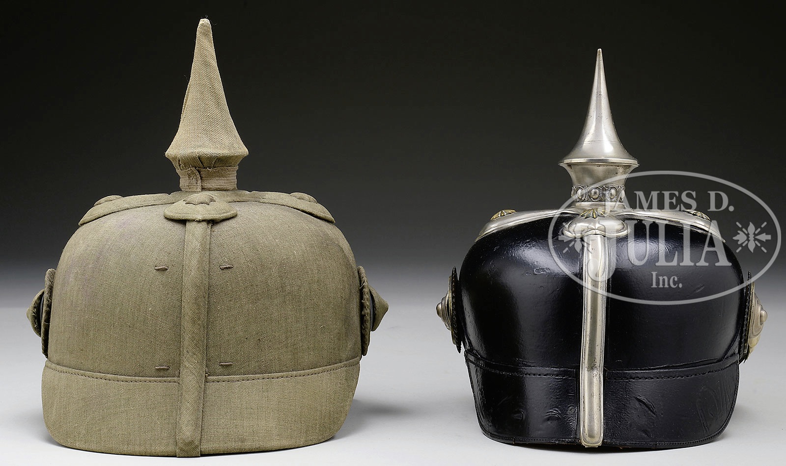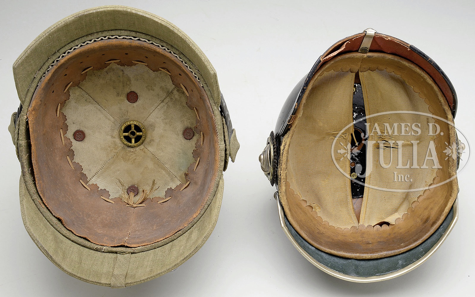 LOT OF TWO PRUSSIAN DRAGOON OFFICER’S HELMETS.1) Prussian Dragoon Officer’s Field Helmet. Unique “Feldhelm” specially purchased by officers for use in the field. Prussian line Dragoon Regiments eagle pressed under cloth. A similar helmet was featured in the recent book Feldzug 1914 Vol 1 by Michael Baldwin pp 104-107. Pressed cork body with cloth trim sewn over interior interior and exterior. Made by “Ludwig Borgefeldt / Bremen” embossed into leather liner the banner “Elovit”. Leather liner with fenestration to reduce heat. Rounded chin scales that are now zinc ultralight construction. Extremely rare. 2) Prussian Line Dragoon Officer’s Helmet with silver trim. Leather helmet body with silver metal trim. Body in fine form with firm stitching. Interior sweat leather and silk head liner. Visors colored. No extra holes in body. Exterior of helmet shows use with minor crazing on body and more crazing on visors. Frontplate is the standard Prussian Dragoon style eagle in silver. Silver crossed base and smooth spike. Gold chin scales with Reichs and Prussian cockades. Accompanying the helmet is a white linen field cover. This field cover used by judges in war games activities prior to WWI. PROVENANCE: Robert H. Haskell,III Estate Collection. CONDITION: 1) Beautiful helmet in perfect form, slight staining to cloth finish on left side, cork firm throughout helmet, interior has slight separation of stitching to sweat leather, otherwise in perfect condition. 2) Helmet in very good condition. Leather body shows much use and has been polished. One Star in spike base has been replaced. Rosettes on chin scale has been replaced. Interior of helmet shows great amount of use. Sweat leather stained from sweat. Silk head liner has numerous tears. Back visor has damage along the edge with material loss causing red paper to be exposed. Spike is not removable. White field cover has broken stays on each end from use. 4-50221-2 RT3 (2,000-4,000) – Lot 3258