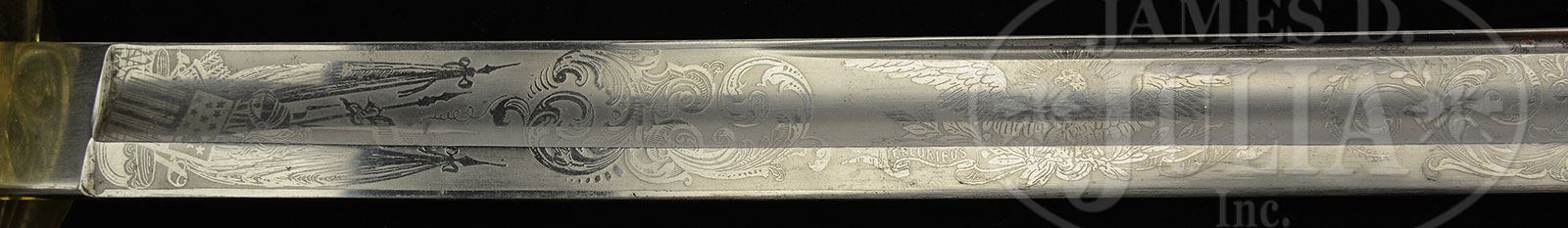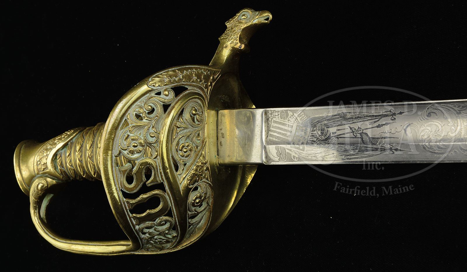 STAFF AND FIELD OFFICERS SWORD, LT. JAMES FOLEY 69TH NEW YORK, IRISH BRIGADE.SN NSN. This high grade US model 1850 Staff and Field Officers Sword has extra engraving and chasing work with a spiral metal grip and an eagle head quillon. 31-3/4” blade has about 17” etched panels with patriotic motifs retaining much of its orig shine and luster. There is a 2-1/4” presentation in shape of shield in German silver scabbard between top mounts which reads, “Presented to First Lieut. James Foley Co. H. 69 N.Y.S.N.G.A. by the Members of his Company as a mark of their esteem March 8th, 1865”. The roster of the 182nd Regiment, New York Infantry records that James Foley enlisted September 24, 1862 in New York City to serve three years, mustering in as first sergeant of Co. H., November 17, 1862. He was promoted to second lieutenant, December 22, 1864 and first lieutenant, January 3, 1865. Foley mustered out with the company in Washington, D.C. on July 15, 1865. He was promoted to Captain in the 69th Regiment New York State National Guard on September 17, 1865. “The Irish Brigade,” was largely made up of members of the 69th Regiment of the National Guard of the State recruited primarily from Irish immigrants in and around New York City. Famously carrying Green Regimental Colors, they sustained the third highest combat casualties of all Union brigades. This sword has affidavit stating that it had descended in the family with various owners until now. CONDITION: Very good to fine overall. Etched panels retain much of their dull luster. Hilt, grip, mounts and scabbard body have been highly polished and no remnants of plating are seen. There is a slight bend to knuckle bow and several small dents in scabbard body. Traces of old polishing compound are found in recesses of hilt and mounts. 4-53609 JS264 (4,000-6,000) – Lot 3262 Click here to view provenance