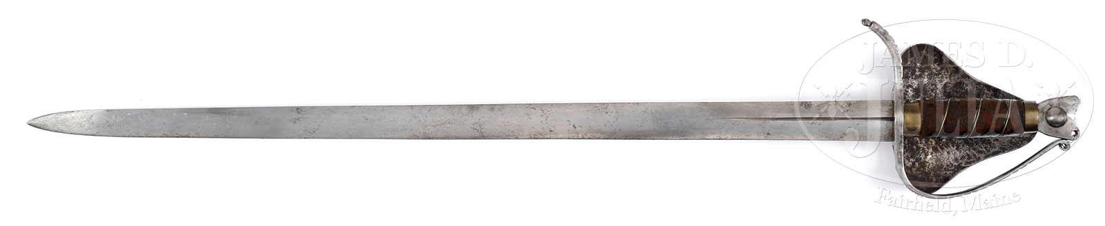 VENETIAN NAVAL CUTLASS.32-1/2″ overall, 27-1/4″ double edge blade with thin central fuller. Iron guard with cat’s head shaped iron pommel, leather grip with brass ferrules. The large spade shaped basket has chased 2-1/4″ central oval device with a small Venetian bronze coin or disc with The Lion of St. Mark’s as central device. This form, undecorated, was known in early 16th Century during the peak of the Venice’s Naval power. This sword appears to be 19th Century in style and construction. PROVENANCE: Private Lifetime Collection Of A Noted Scholar And Authority. CONDITION: Very good to fine overall, cleaned in the European style. Iron is bright grey overall. Leather grip is intact with scuffing to exposed high areas, still retaining single strand brass wire wrap. 51627-11 JS (1,500-3,000) – Lot 3262
