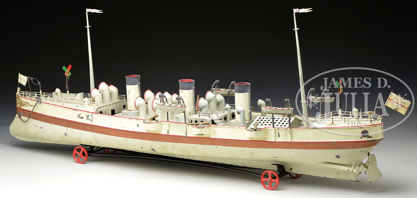 SCHONNER “AVISO GREIF” LIVE STEAM GUN BOAT.Believed to be the largest version of this particular early 20th century boat that Schonner produced (37-1/2″ l). Not as complicated and detailed as Marklin boats, but somehow in its simplicity, it is quite appealing and intrinsically pleasing. A bevy of smokestacks, funnels, lifeboats, and mounted guns further add to the appeal of this wonderful toy. Live steam motor is contained within the hull of the boat under the cabin area and powers the twin screw propellers. Professionally restored a number of years ago and aging has set in to give it an original appearance.Schonner tended to use some lifelike features including cast davits to lower the lifeboats, and a pair of smaller signal masts (red/green) along with a fancifully cast yardarm on the bow of the boat. Boat is supported by a wheeled framework for display or perhaps to pull it along the floor (of more recent vintage). SIZE: 37-1/2″ l. CONDITION: Overall some uniform chipping and paint flaking, most notably to the right underside of hull. 1-13650 (13,000-15,000) – Lot 3263 Auction: Advertising, Toy & Doll - Spring 2014 Please Note: All prices include the hammer price plus the buyer’s premium, which is paid by the buyer as part of the purchase price. The prices noted here after the auction are considered unofficial and do not become official until after the 46th day. |