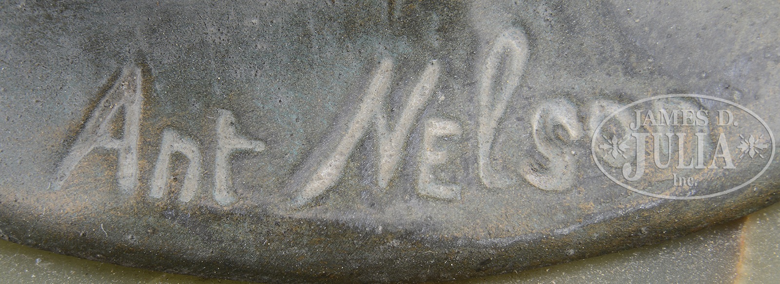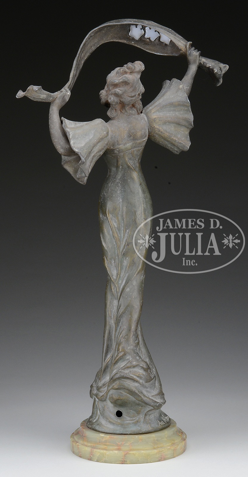ART NOUVEAU STYLE FIGURE OF “STELLA”, BY ANT NELSON.Affixed with a plaque near base of statue “Stella” mounted on a green onyx socle. Figure with outstretched hands waving a banner inlaid with three 5 pointed white glass stars. Figure is signed on the base in script “Ant Nelson”. SIZE: 25-3/4″ h. CONDITION: Surfaces have been cleaned. Back of statue has been drilled for probable application for lamp. Otherwise good. 50567-47 (400-600) – Lot 3263