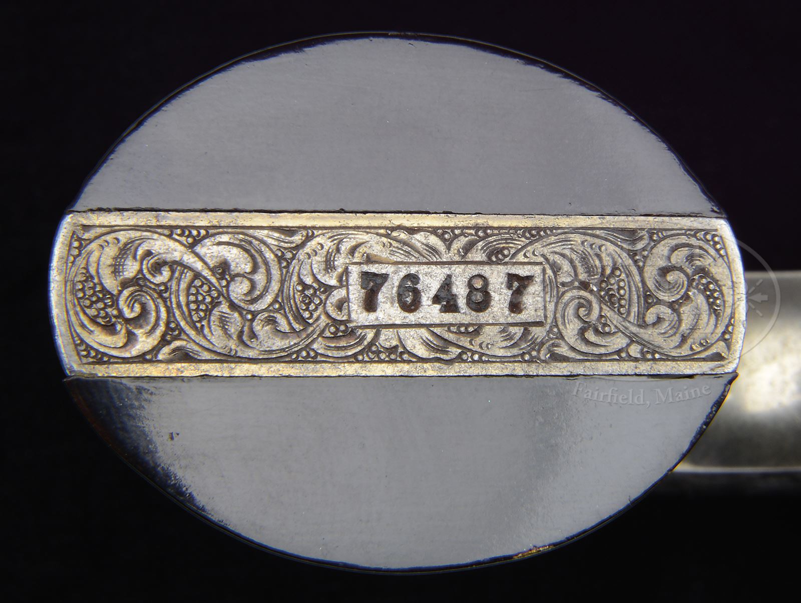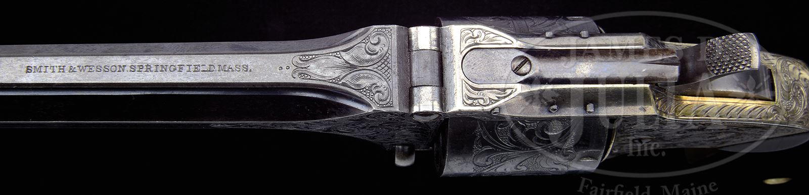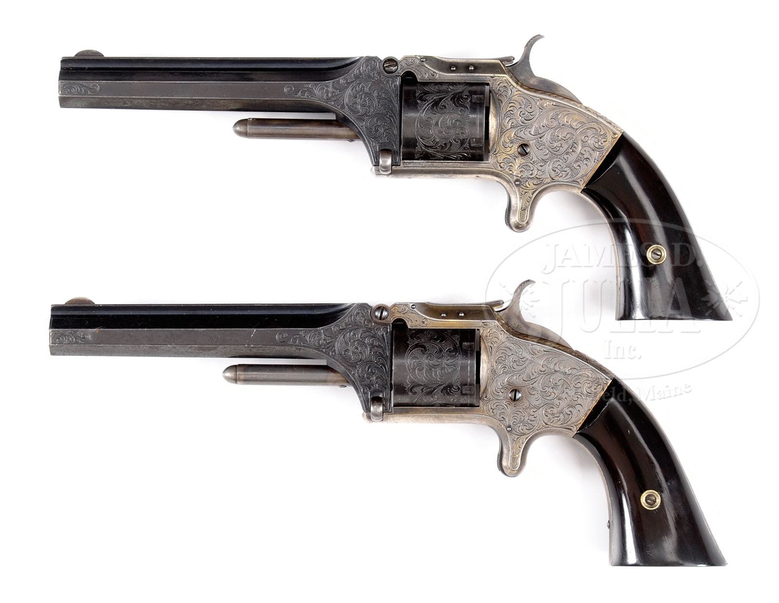 Please Note: Recent information has been received that this set of revolvers was purchased from a farmer in Wisconsin in 1974 by renowned collector Roger Muckerheide. He sold them several years later through a West Coast auction house. EXTREMELY RARE CASED SET OF FACTORY ENGRAVED SMITH & WESSON NO. 2 ARMY TIP-UP REVOLVERS.SN 75381/76487. Cal. 32 RF. Both revolvers are identical, blue and silver finish with 5″ oct ribbed bbls, German silver front sights with 1-line address on ribs. Top straps are 3-pin style with cyl stops and rear sight. Both are mounted with 2-pc smooth rosewood grips, matching numbered to their respective revolvers. Both revolvers have assembly numbers on left side of their grip frames, under the grips, with matching assembly numbers on rear faces of bbl lugs and front faces of cyls. Revolvers are nearly identically engraved with extremely fine, intertwined foliate arabesque patterns that have fine pearled background. Frames have full coverage on the sides with matching patterns on the backstraps and buttstraps. Matching patterns extend onto the bbl lugs and side flats at the muzzles. Top front flats of the frames and rear top flats of bbls are also beautifully engraved. Cyls are engraved with a full band of matching foliate arabesque patterns around the patent dates in the center. Accompanied by an incredible, blue velvet lined mahogany casing that is recessed for the two revolvers and a rosewood handled brass cleaning rod. There are 5 covered compartments with “certified antique ivory” pulls containing a small bottle of oil, a functioning key, and 9 cal 32 rimfire cartridges. These revolvers are accompanied by a factory letter which confirms they were among a 50-unit shipment of Model No. 2 Army’s in January 1871 to M. W. Robinson of New York City, S&W’s largest distributor of the late 19th & early 20th Century. The letter states this shipment consisted of a variety of finishes and barrel lengths and that 10 of the 50 were engraved, 2 of which had a “plated breech” (frame), which conclusively identifies this pair of revolvers as being factory engraved. Throughout the U.S. and around the world, both during the Civil War and in the last half of the 19th Century, many soldiers and, famous and not so famous personages, made great use of the S&W No. 2 Army as they’re arm of personal protection, such as Wild Bill Hickok who was found to have been carrying a No. 2 Army on the night he was killed in 1874. Rarely does one find an engraved No. 2 Army, let alone a matched set and especially housed in an incredible case. This is one of the finest sets of Smith & Wesson No. 2 Army Revolvers come to market in recent years Special Note: This item contains or is made of ivory. Do not bid on this lot unless you have read and agreed to our "Ivory Position Statement" and the "Waiver of Legal and Financial Risk to James D. Julia in regards to your Purchase of an Ivory Object." This information is located in the front section of our catalog. CONDITION: Revolvers are virtually identical, all matching and in very fine to extremely fine condition. They retain about 95% glossy orig blue on the bbls with the losses from flaking, not wear. Frames retain virtually all of their strong orig silver finish, slightly thin on the backstrap of #75381. Triggers and hammers show dark case colors. Cyls retain virtually all of their strong orig blue, slightly lighter on the cyl of #75381. Grips are all extremely fine plus, with sharp edges and 99% plus orig varnish. Mechanics are crisp. Strong bright bores with some light roughness. Case is sound with some minor handling and storage nicks and scratches and retains about 97-98% orig finish. Interior is lightly faded with light soil. Other accessories are fine. 49654-5 JR IVORY (25,000-40,000) – Lot 3265 Click here to view provenance