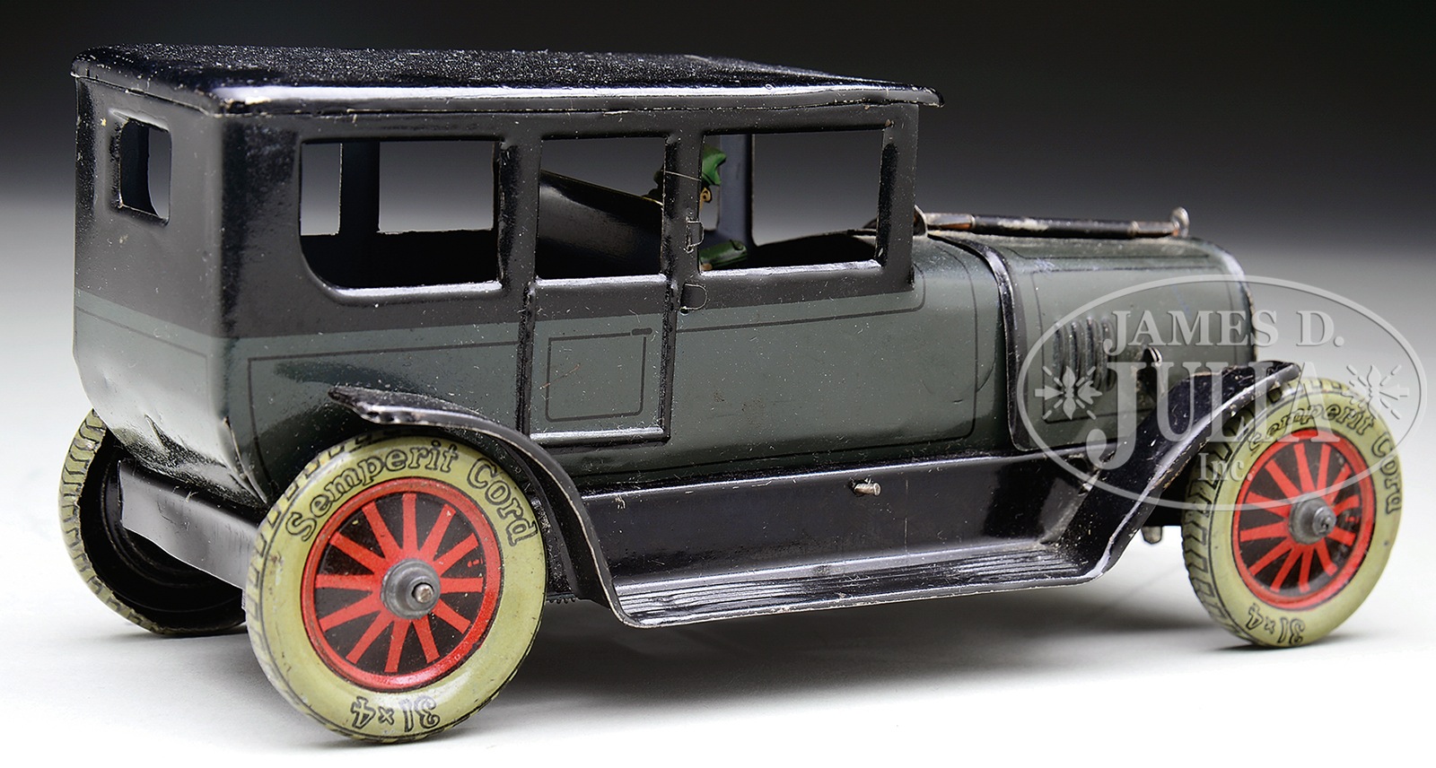 TIN WINDUP LIMOUSINE BY MOKO.Well articulated German toy features windup action with moving pistons and spinning fan as car rolls forward. Tin lithographed chauffeur. Car is in dark gray and black with tires marked “Semperit Cord 31 x 4”. SIZE: 8-1/2″ l. CONDITION: Near excellent and working. Fine example. 1-14090 (800-1,200) – Lot 3268 Auction: Advertising, Toy & Doll - Spring 2014 Please Note: All prices include the hammer price plus the buyer’s premium, which is paid by the buyer as part of the purchase price. The prices noted here after the auction are considered unofficial and do not become official until after the 46th day. |