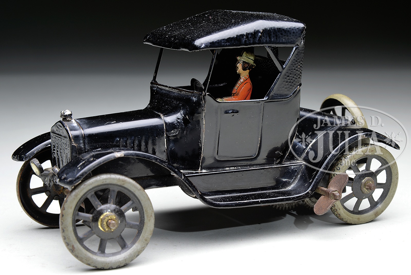BING MODEL T WINDUP.Well marked tin windup black roadster has gray wheels and tin lithographed driver. Running boards embossed “Ford”. Nice quality German toy. SIZE: 6-1/2″ l. CONDITION: Roughness to original paint area at cowl (factory). Otherwise toy is very good to excellent and working. 1-13920 (250-400) – Lot 3271 Auction: Advertising, Toy & Doll - Spring 2014 Please Note: All prices include the hammer price plus the buyer’s premium, which is paid by the buyer as part of the purchase price. The prices noted here after the auction are considered unofficial and do not become official until after the 46th day. |