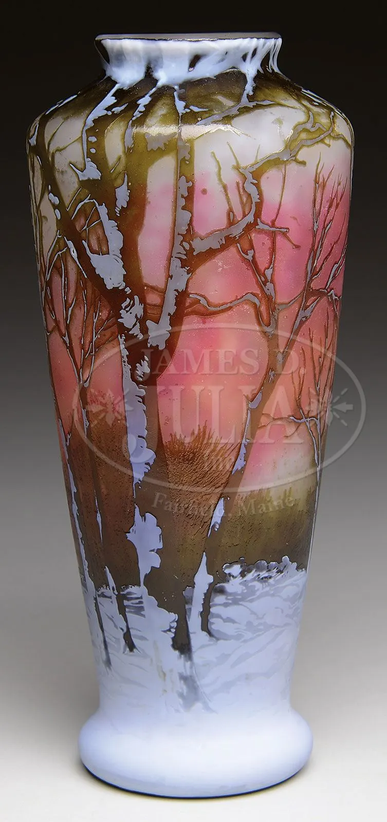 DAUM FIRE & ICE VASE.Daum vase is decorated with a cameo winter scene of barren trees and snow covered ground against a fiery red mottled sky. The vase is signed on the side of the foot with engraved signature “Daum Nancy” and the cross of Lorraine. SIZE: 10-1/2″ t. PROVENANCE: Private New England Collection. CONDITION: Very good to excellent. 5-69255 (7,000-10,000) – Lot 3271