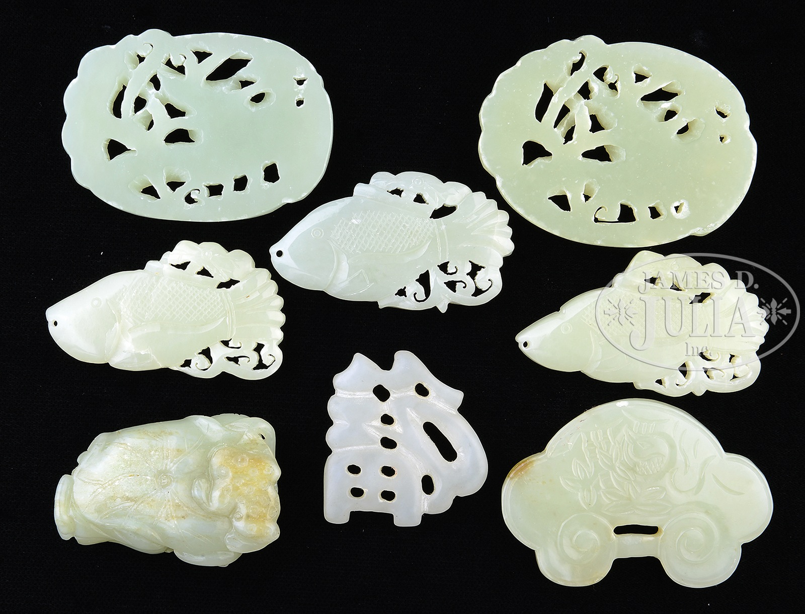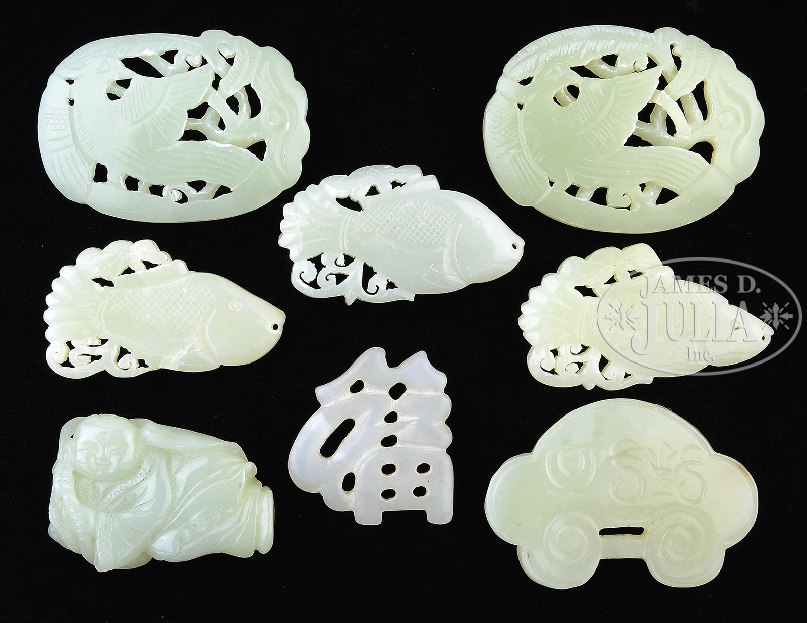 LOT OF EIGHT JADE CARVINGS.China, 20th century. The lot comprising of eight jade carvings including three fish form pendants, two openwork pendants with birds, a lock amulet, and a carved pendant in the form of a fu character. SIZE: Ranging from 1-1/2″ l to 2-1/4″ l. CONDITION: Very good. 49996-2 (600-800) – Lot 3272