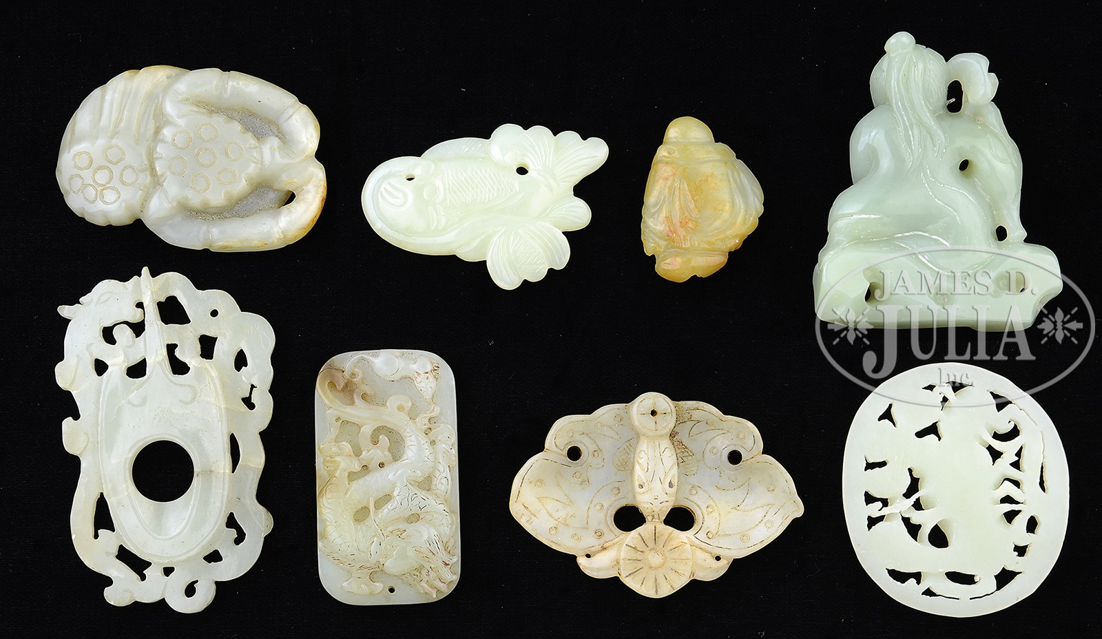 LOT OF EIGHT JADE CARVINGS.China, 20th century. The lot comprising of four pendants all of a grey celadon color in various design depicting dragons, lotus, and fish. Also included are two carvings of figures along with an amulet in the form of a bat and a small round plaque depicting a bird with openwork. SIZE: Ranging from 1-1/2″ l to 3″ l. CONDITION: Good, the round plaque with small chips at the edges. 49996-6 (600-800) – Lot 3273