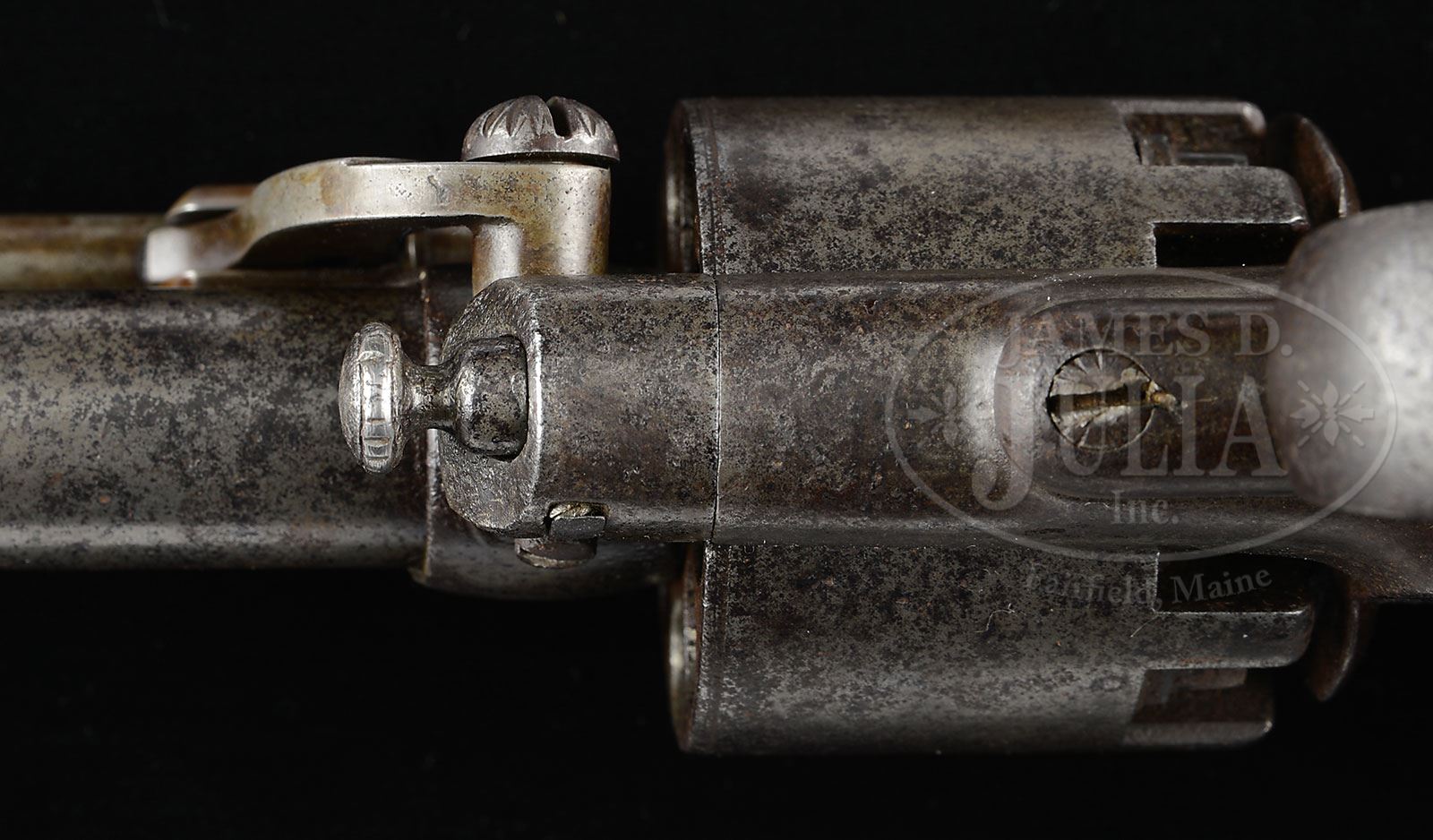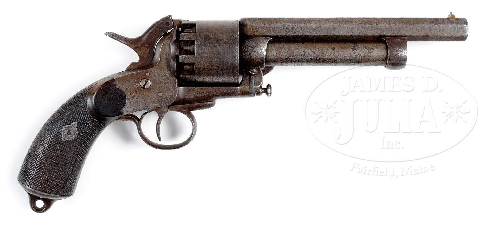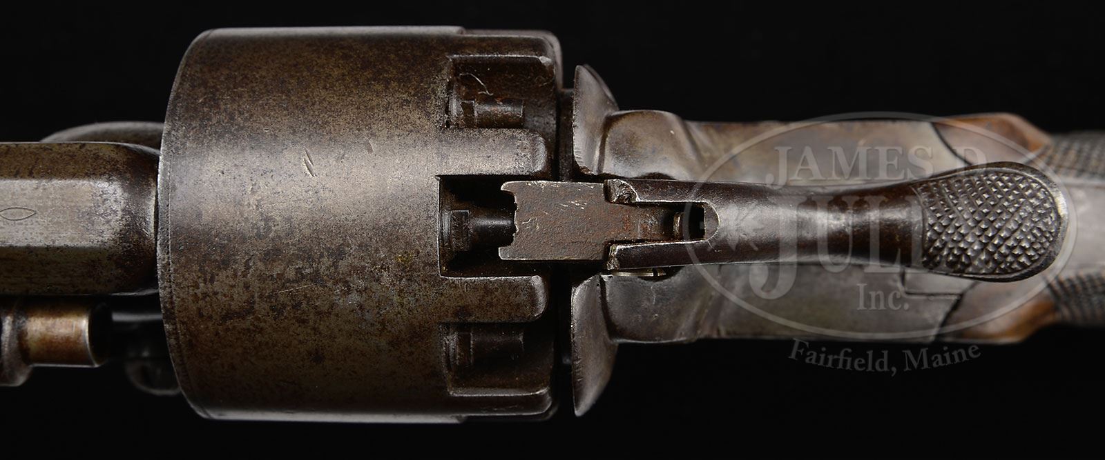 SN 1448. 42 Cal./18 Bore. This is an orig example of the standard production LeMat grape-shot revolver. Standard production guns, often called 2nd Models, feature improvements made by LeMat that worked the best after lots of service in the field by Confederates in the field reporting problems in the early Civil War years, including Colt style ratchet system to turn cyl. The revolver has the distinctive LeMat 9-shot cyl. 42 caliber rifled bbl with smooth bore ‘grape-shot’ 18 ga bbl for firing buckshot. The top bbl flat is marked “Col. LeMat Bte s.g.d.g. Paris” which is the standard addressing on LeMat standard production guns. In Wiley Sword’s text Firepower From Abroad he notes that probably only the first 1450 LeMats made it to the Confederacy in time for the Gettysburg Campaign. If that is the case this would have been one of the last guns to make it for the major 1863 and 1864 Campaigns of the Civil War. LeMat revolvers were prized by their Confederate owners (and the Yankee capturers too). Many notable Confederate Generals and Officers were known to have carried these unique weapons. In Charles Frazier’s 1997 National Book Awards winning Cold Mountain the book’s hero Inman proudly owned a pair of LeMat revolvers showing how well known this particular revolver is among modern culture. PROVENANCE: Greene Museum of Southern History. CONDITION: Gun overall is gray/brown, cleaned and pitted. Bbl address and SNs are all discernible. Bbl address is quite discernible as can be seen in photos. Loading assembly is unserialized and is a well made copy with similar color and patina to balance of gun. Ears of hammer are broken and pivoting shotgun hammer is not orig nor is its pivot screw. Dove-tailed front sight is an old brass replacement with steel pin. Stocks are sound, solid, well fit with fairly crisp checkering with minor small dings, dents and chipping to left stock at interface with frame. Mechanically gun functions with crisp rifling in bore. 4-54252 JS213 (6,000-9,000) – Lot 3274