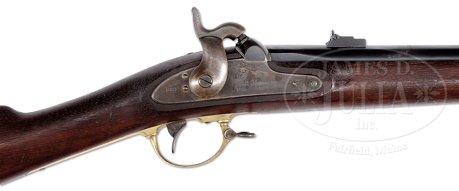 EXCEPTIONAL CIVIL WAR REMINGTON MODEL 1863 ZOUAVE PERCUSSION RIFLE AND BAYONET.SN NSN. Cal 58. 33″ bbl. This is a beautiful example of the popular Remington Civil War rifle in extremely fine condition. This gun conforms to standard configuration with blued rnd bbl with “VP”/eagle head proofs and “1863″ date on bbl tang. Left side of bbl stamped “STEEL” followed by “RKA” (Remick K. Arnold) inspector mark, 2-leaf rear sight and distinctive Remington part cylindrical front sight and bayonet lug. This gun is brass mounted with two spring retained bbl bands, nose cap, trigger guard, buttplate & patchbox. These brass components each have small brass inspector’s initials being “L”, “C”, “J” or “B”. Stock has two crisp inspector cartouches which read “HDJ” (Henry D Jennings) and “BH” (Benjamin Hannis). Accompanying bayonet is also inspected “BH” for Benjamin Hannis. This is a fine, complete and orig example of the popular brass mounted Remington rifle with beautiful stock and metal retaining much of its orig finish with a like-new shiny bore and excellent matching bayonet and scabbard. PROVENANCE: The William Smith Collection. Formerly from the Dr. Miller Estate Collection. CONDITION: Extremely fine. Appears to be unfired retaining virtually all of its orig factory finish to both metal & wood with minor nicks, dings & a few light bruises in wood. Lockplate & hammer retain strong case colors, more faded on hammer. Bbl has a small band of wear just in front of rear sight. Mechanics are crisp, brilliant shiny bore. 49312-72 FTL (6,000-8,000) – Lot 3275 Click here to view provenance