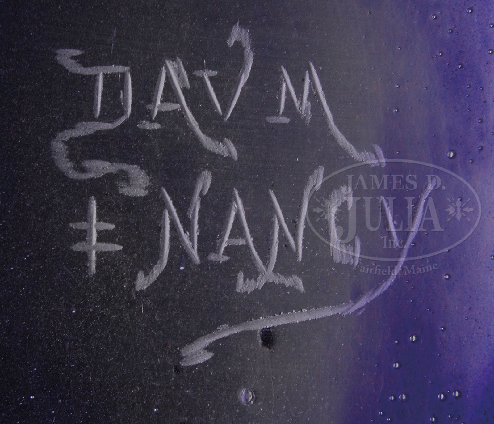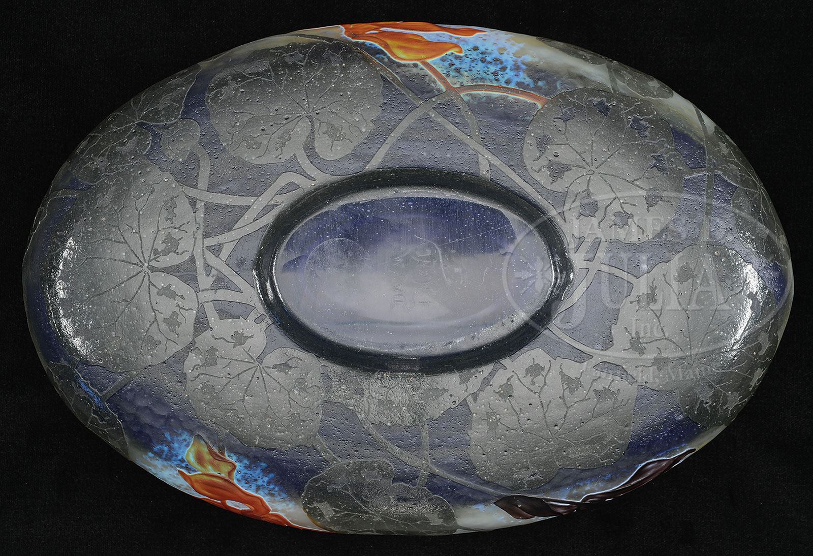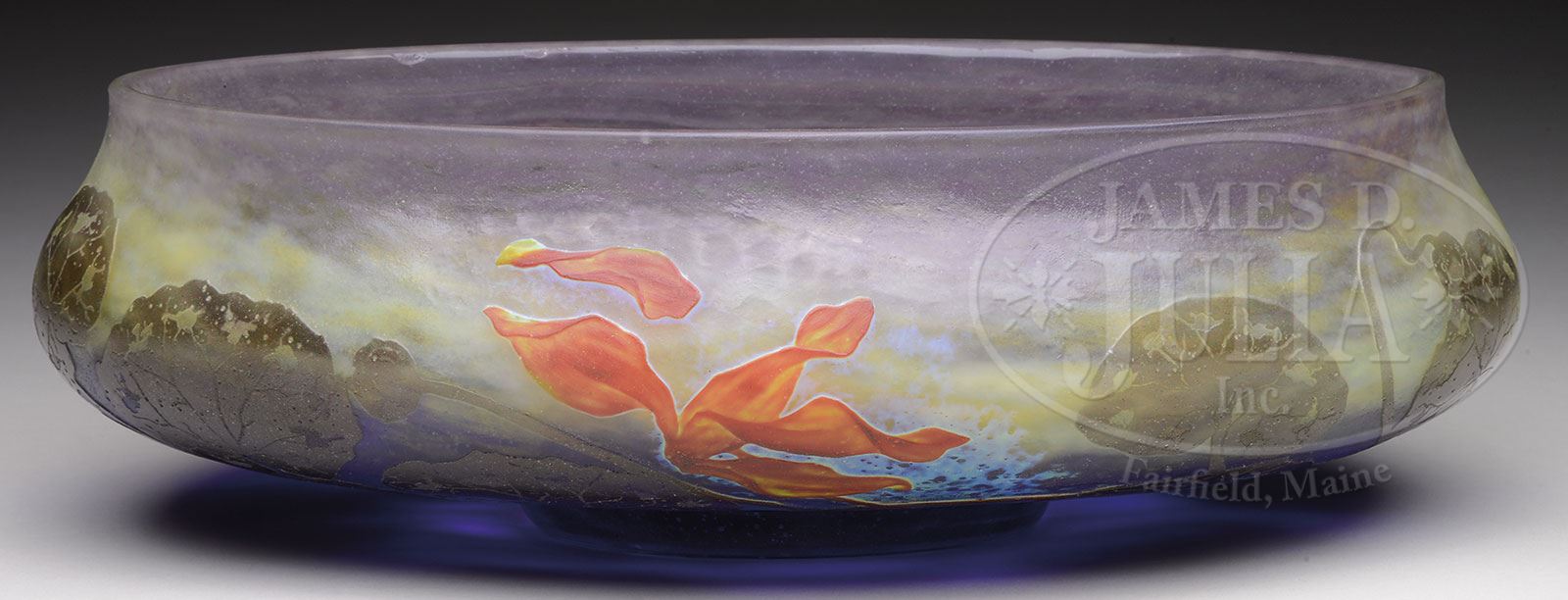 DAUM PADDED AND WHEEL CARVED BOWL.Daum bowl has cameo lily pond decoration with green lily pads surrounding the bottom against a mottled blue shading to cream shading to purple background. Bowl is further decorated with purple and orange padded and wheel carved lilies and is finished with random areas of martele. Signed on the underside with engraved signature “Daum Nancy” with the cross of Lorraine. SIZE: 3-3/4″ t x 11-1/2″ l x 8″ w. PROVENANCE: Private New England Collection. CONDITION: Very good to excellent. 5-69244 (3,000-4,000) – Lot 3276