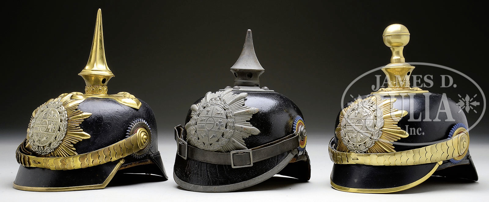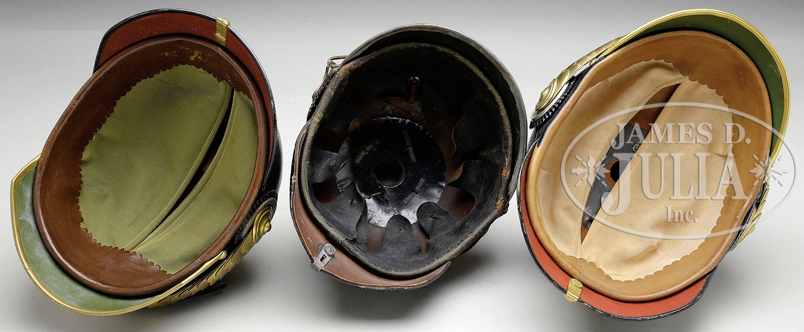 TWO MECKLENBURG-SCHWERIN OFFICER’S HELMETS AND ONE MECKLENBURG-SCHWERIN FIELD GRADE ENLISTED MAN’S HELMET.1) Mecklenburg-Schwerin 17th Dragoon officer’s helmet. Black leather body with fine gilt trim. Leather body has good form and excellent stitching. Interior has sweat leather and silk head liner. Visors colored. No extra holes in helmet body. Leather finish lightly crazed due to age but no loss of material. Crossed base and fluted spike for the dragoon regiment. Frontplate is the rising gold star with silver Arms of Mecklenburg in center. Round chin scales with Reichs and Mecklenburg cockades. Very rare. 2) Mecklenburg 60th Field Artillery Regiment officer’s helmet. Black leather body with fine gilt trim. Body with excellent form and firm stitching. Interior sweat leather with silk head liner. Colored visors. No extra holes. Body finish matte due to age but with no cracks or crazes. Tall elongated neck to ball base. Frontplate gold rising star with the silver Arms of Mecklenburg schwerin in the center. Rounded chin scales with Reichs and Mecklenburg cockades. 3) Mecklenburg-Schwerin field gray enlisted man helmet model 1915. Black lacquered leather body with pewter-field gray trim. Leather body with excellent form and firm stitching. Interior has enlisted man’s black round tab liner. No regimental marking on back of rear visor. Frontplate held in place with two leather wedges. No extra holes. Leather body has good finish with crazing to both front and rear visors. Metal trim has all the same gray color and patina. Bayonet lug type spike attachment. Frontplate is the rising sun with the Arms of Mecklenburg in the center, all in field gray color. Replacement leather chin strap. Genuine Reichs cockade. Mecklenburg cockade appears to be repainted. Includes conical black helmet carrying case. PROVENANCE: Robert H. Haskell, III Estate Collection. CONDITION: 1) Overall excellent condition. Exterior shows age related spider crazing to leather body. Metal trim in excellent condition with only mild age discoloration. Cockade original but are dirty. Interior shows virtually no wear and in near mint condition. 2) Excellent condition inside and out. Exterior shows fine gilding with only minor age discoloration. Cockades bright. Interior shows no use and is virtually mint. 3) Overall very fine condition. Exterior excellent with no damage. Interior shows use with wear both in the liner and back visor where light crimping can be seen from the use of a field cover. Chin strap modern day replacement. Mecklenburg cockade appears repainted. Otherwise extremely rare. 4-50221-21 RT22 (4,000-6,000) – Lot 3277