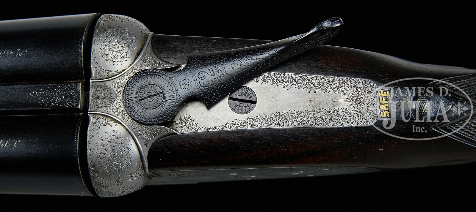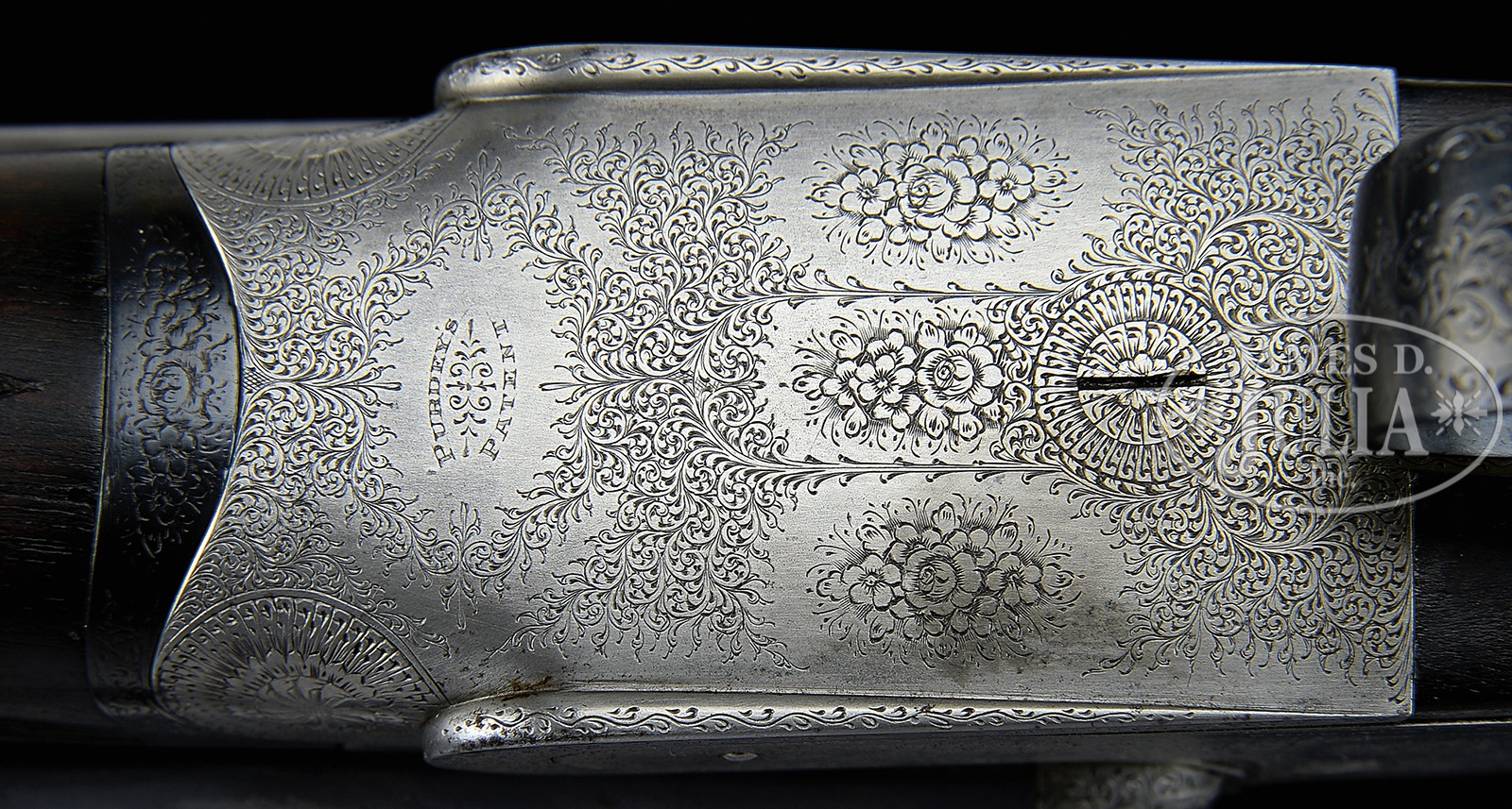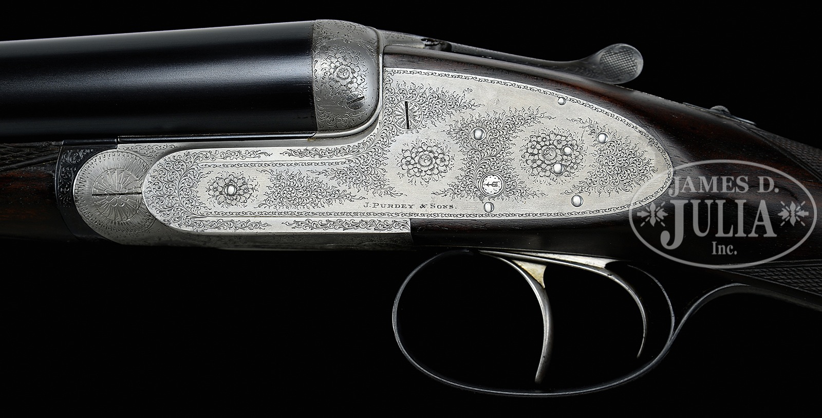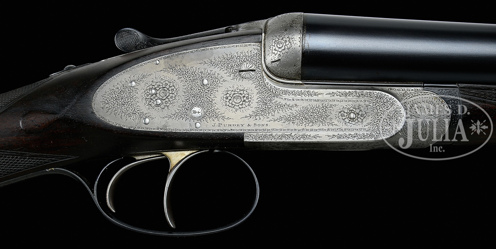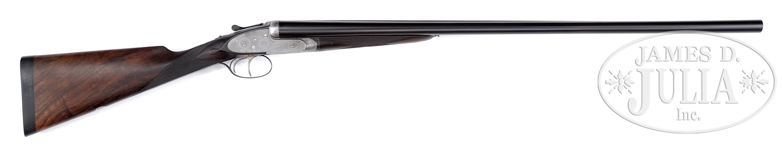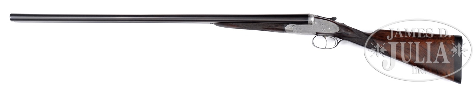 *REFURBISHED JAMES PURDEY SIDELOCK EJECTOR GAME GUN.SN 19265. Cal. 12 ga. 2-1/2″ Chambers. 30″ Chopper lump bbls fitted with narrow game rib, are engraved with Purdey’s famous Audley House address and Whitworth steel information on tops. Bbl flats are stamped with London nitro proofs for 2-1/2″ chambers; bottoms of bbls with chokes, SNs, and bbl makers initials “S.S” (Sam Simons). Tube nos “36232” and “36233” are on loop. Coin finished, Beesley patent self-opening sidelock action features automatic safety, hidden third fastener, gold plated internals, engraved arrow tumbler end cocking indicators, bushed strikers, and dbl triggers. Action is engraved with near full coverage Purdey house style rose and scroll. SN is on grip of scroll engraved and blued trigger guard. Well streaked and lightly figured dark European walnut straight grip buttstock measures 14″ over 7/8″ thick ebony buttplate, which appears to be fitted to orig curve. Typical drop points and point pattern checkering are at grip. A vacant silver oval is on toe line. Matching splinter ejector forend has Anson release. Iron is stamped with actioners initials “J.T” (Joe Thompson). Gun is the second of a pair, with “2” stamped on rear lump, engraved on top lever and forend iron. Bore diameter: left – .735, right -.739. Bore restrictions: left -.046 (extra full), right -.048 (extra full). Wall thickness: left -.021, right -.017. Drop at heel: 2-3/16″, drop at comb: 1-1/2″. Weight: 6 lbs. 1Relatively new oak and leather case with brass corners is lined in scarlet cloth. CONDITION: Very good, as refurbished. Bbls retain nearly all of a satin re-black, lettering appears to have been re-cut, with some subsequent softening. Action has been coin finished to pewter gray over a few light pits. Stocks retain nearly all of a hand rubbed oil finish, sharp edges rounded, drop points worn, checkering re-cut. Lengthening piece is relatively new. Bores are very good, frosted, with some light striations and a few scattered pits. Action is tight (new hinge pin). Bbls are on face. Drop is good. Ejectors are very slightly out of time. 51092-1 MGM297 (7,500-12,500) C&R – Lot 3277