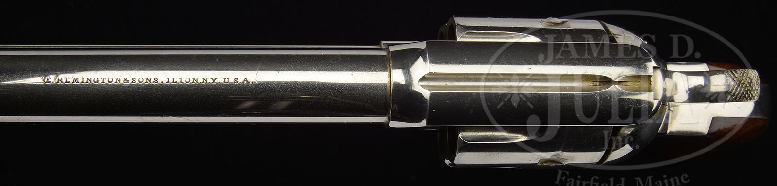 REMINGTON MODEL 1875 SINGLE ACTION ARMY REVOLVER.SN 616. Cal. 44 WCF (44-40). Nickel finish with 7-1/2″ bbl, full front sight and 1-line “E. REMINGTON & SONS” address. Mounted with 2-pc smooth walnut grips matching numbered on inside of each grip. According to Flayderman’s Guide to Antique American Firearms there were only about 25,000-30,000 of these fine revolvers produced in the period 1875-1889. The Remington Army was a fine revolver in its day and would have been serious competition for the Colt Model 1873 but it appeared on the market two years after the Colt, by which time Colt was well established with military contracts which Remington could never generate. Even though the Remington was every bit the equivalent of the Colt, Remington did not have the distribution and contacts to reach widespread customers. It is believed that there was a contract for 10,000 of these revolvers by the Egyptian government but apparently only a few were delivered. The government of Mexico purchased about 1,000 of them. PROVENANCE: Don Littman Collection; Robert Howard Estate Collection. CONDITION: Extremely fine. Overall retains just about all of its strong orig nickel finish with some faint muzzle edge wear, slight wear on ejector rod head and light dulling from handling; screws retain most of their orig fire blue; grips are sound with a couple of gouges & bruises, moderate edge wear and retains most of their orig varnish. Mechanics are fine, bright shiny bore. 49450-17 JR (9,000-15,000) – Lot 3278