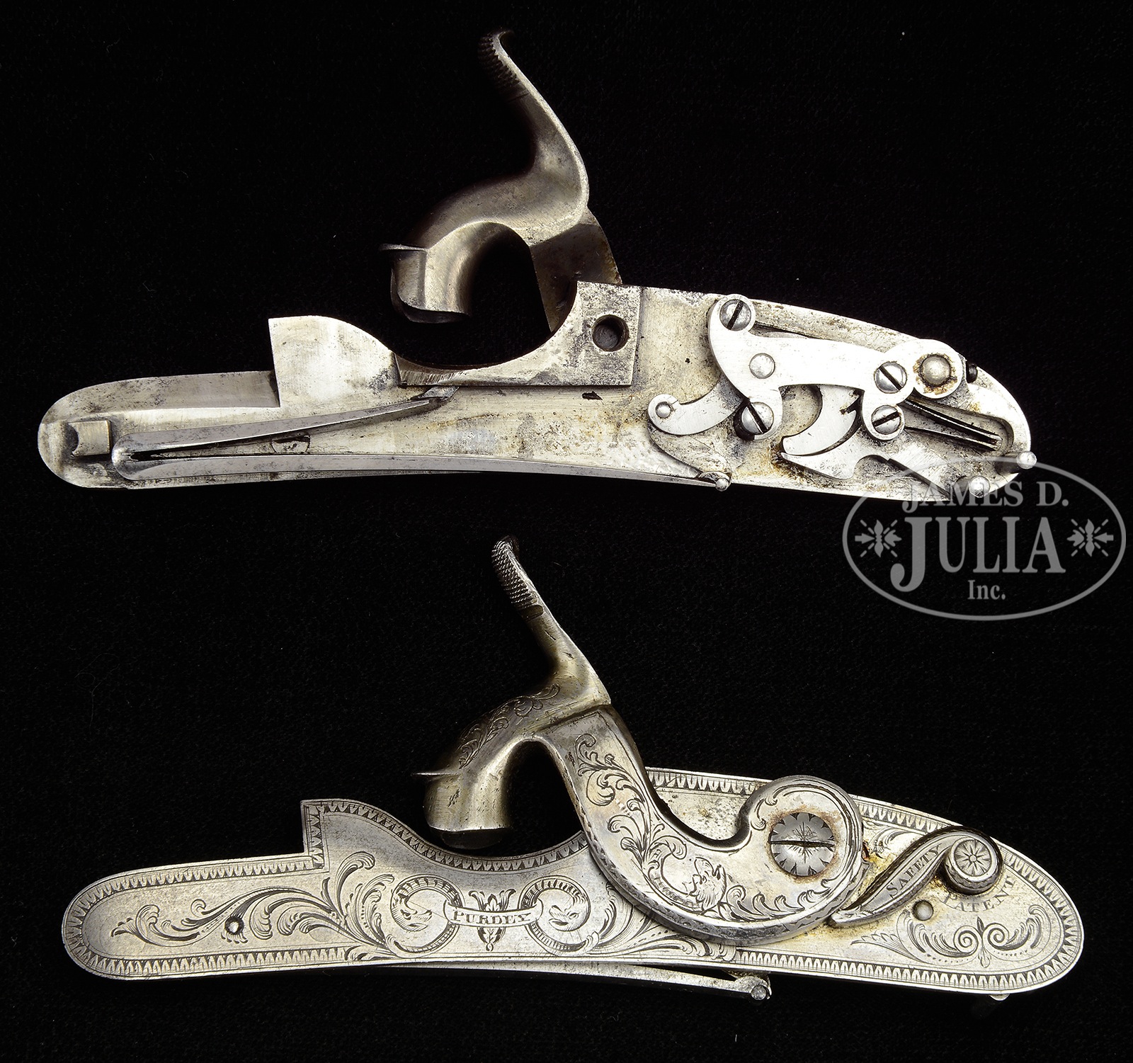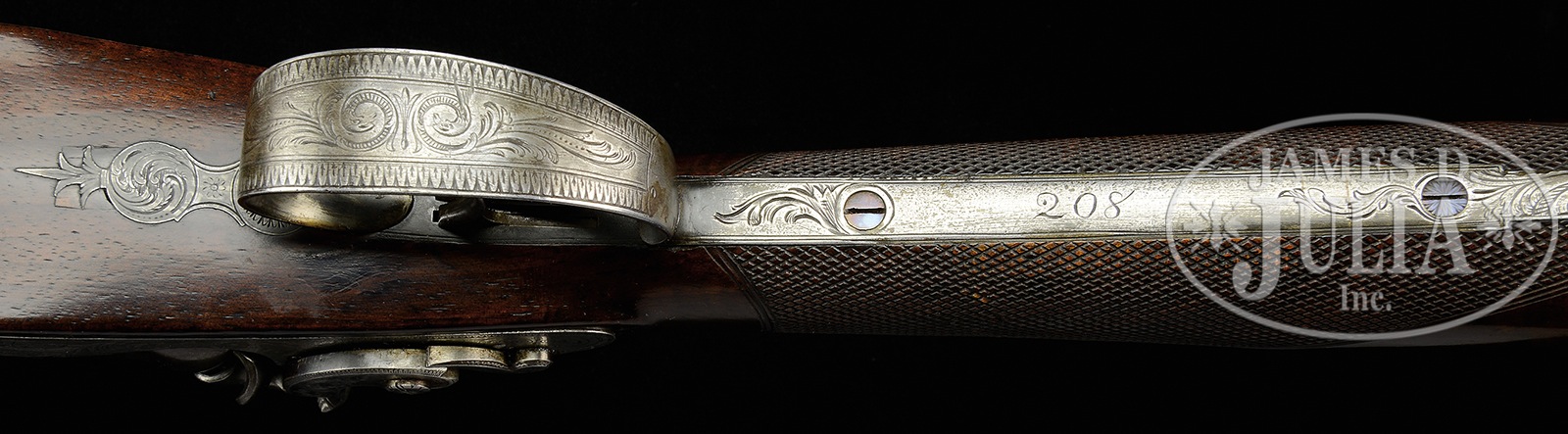 SN 208. (1820) Cal. 14 Bore. Only four Purdey shotguns with lower serial numbers are extant; Number 14 (a single) is in the National Museum of Scotland; 86 is in the collection of James Purdey & Sons London; 44 and 200 are in private collections. This particular shotgun, no. “208” was given to David Trevallion, noted gunmaker and Purdey stocker, by his “Gaffer” (apprentice master, Bill O’Brien) who was responsible for the restoration of this gun and no. 86, an orig flint gun, which was retained by Purdeys. No 208 was given to Mr. O’Brien by Purdey’s as payment for the work done on both, as work was performed on Mr. O’Brien’s own time. This gun has boldly patterned 30″ stub twist bbls fitted with broad, concave, elevated rib, engraved in script “J. Purdey Princes Strt. Leicester Square London”. Bottoms of bbls are stamped with London black powder proofs, SNs and bbl forgers initials “CL” (the noted Charles Lancaster, who worked as a bbl forger before building complete guns at a later date). An ebony ramrod with brass tulip head and tail with steel worm under cap, is held by two plain pipes. Bbls were originally flintlock, and new percussion patent breeches have been fitted, most likely by Purdeys in the 1830’s. Breech iron with later style integral fences, has near full coverage well cut acanthus scroll with sea monster finials. Though originally flintlock, lockplates have been nicely shaped, fitted with flat bodied, serpentine percussion hammers, and nicely re-engraved with classic early sea monsters and scroll. “PURDEY” is on banner linking opposed sea monster scrolls on each lockplate. Locks are fitted with the Wyatt patent safety sears, patented in 1818, which hold hammers at half cock, and act as supplement to the normal internal sear. This safety device was often incorporated with a lever at grip which when depressed would also unlock the triggers. It appears this secondary function was removed from this gun, as there is a piece dovetailed into trigger guard tang where pivot for the grip safety would normally be. Stock is of dense, somewhat crotch figured European walnut, and measures 14-1/8″ over broad engraved steel buttplate with long top spur. Other furniture is of steel including trigger plate and thimble, both with stylized pineapple finials, and trigger guard with opposed coiled sea monsters on bow, and SN on tang. Flat top checkering with mullered borders wraps around grip and is at forend. Stock attaches to bbls with captive side nail through oval silver escutcheons. Bore diameter: left -.670, right – .670. Wall thickness: left – .032, right – .034. Drop at heel: 2″, drop at comb: 1-3/8″. Cast: neutral. Weight: 6 lbs. 15 oz. LOP: 14-1/8″. High quality early mahogany case with dual pivoting hook and key closure has inset brass corners, and typical D-ring central handle. Interior is lined in green baize, and has reproduction Purdey Princes Street Leicester Square label in lid. Case contains an array of fine period accessories including correct style unmarked copper bodied flask, Japanned Rangoon oil tin, 3-pc brass and rosewood cleaning rod in leather case marked “208”, a bird carrying sling with a swivel head, a small circular oil bottle, and a tin of Eley caps. Covered compartment with mahogany top inlet for holding locks in a typical flint manner, contains ebony handled turnscrew, 16 ga. wad punch, main spring vise, and T-shaped percussion nipple wrench with spare nipples under caps, and pricker. Another compartment with sliding top contains a morocco leather shot pouch with German silver spout by Deane, and a turks head. PROVENANCE: This gun was the subject of an article in Nov/Dec 2014 “Shooting Sportsman” on pages 69-71, 138, 140, entitled “Purdey no. 208 Examining One of The Oldest Surviving Purdeys” by David Trevallion and Steve Dalzell. Copy included. This gun is also mentioned and pictured in JAMES PURDEY & SONS GUN AND RIFLE MAKERS 200 YEARS OF EXCELLENCE by Donald Dallas, on p. 44. CONDITION: Excellent, as patiently and finely restored by Purdey craftsman, Bill O’Brien. Bbls retain nearly all of an exceptional and dramatic re-brown. Iron parts nicely cleaned to a soft pewter patina. Stock retains nearly all of a Purdey “Slack-um” finish with a few light subsequent marks. Bores are very fine, lightly frosted, with evidence of a few dents being removed mostly in left bbl about 12″ from muzzle. Locks are crisp. Case retains nearly all of a fine oil refinish over numerous light scratches. Renewed interior cloth is very fine with some light soiling. Accessories are generally good to excellent. Cleaning rod leather case is new. 51009-1 MGM214 (10,000-15,000) – Lot 3278