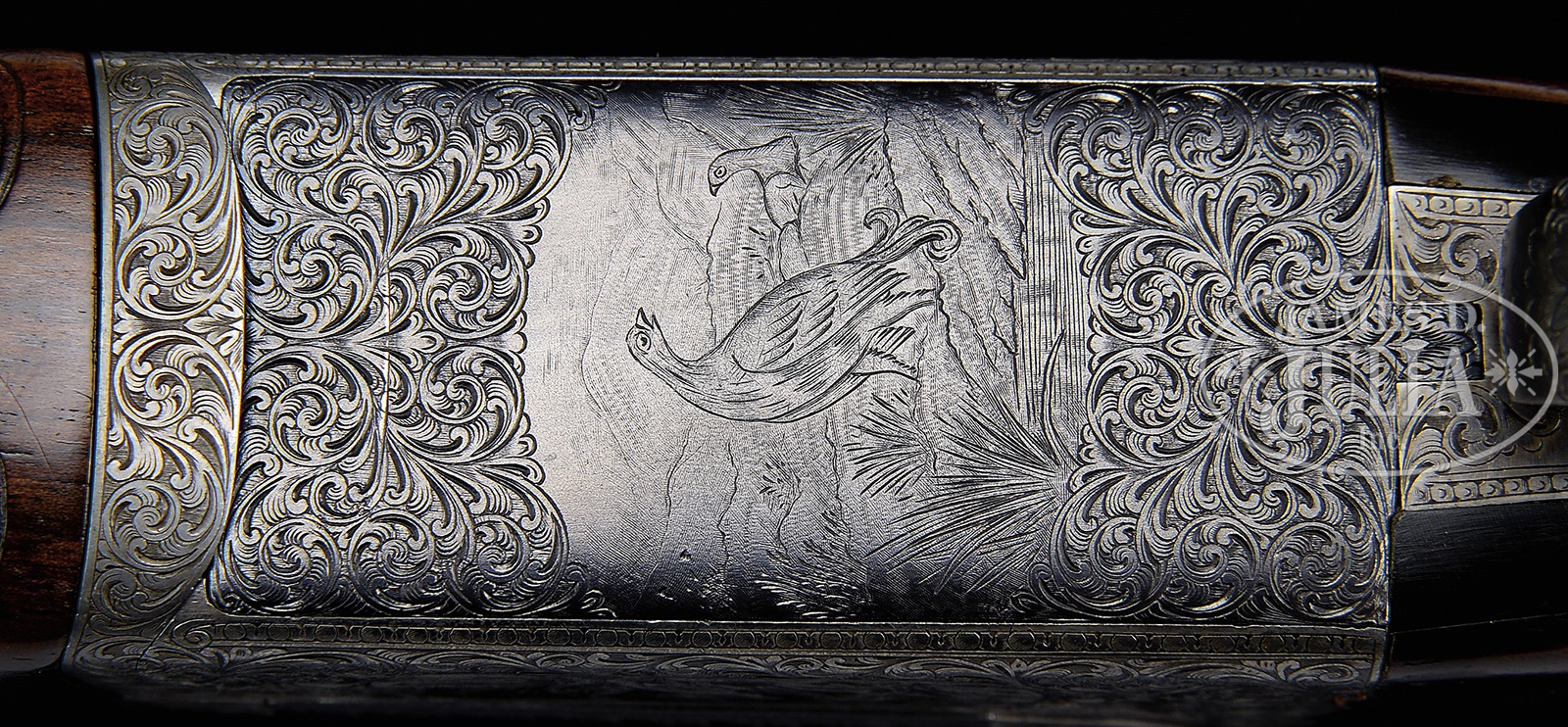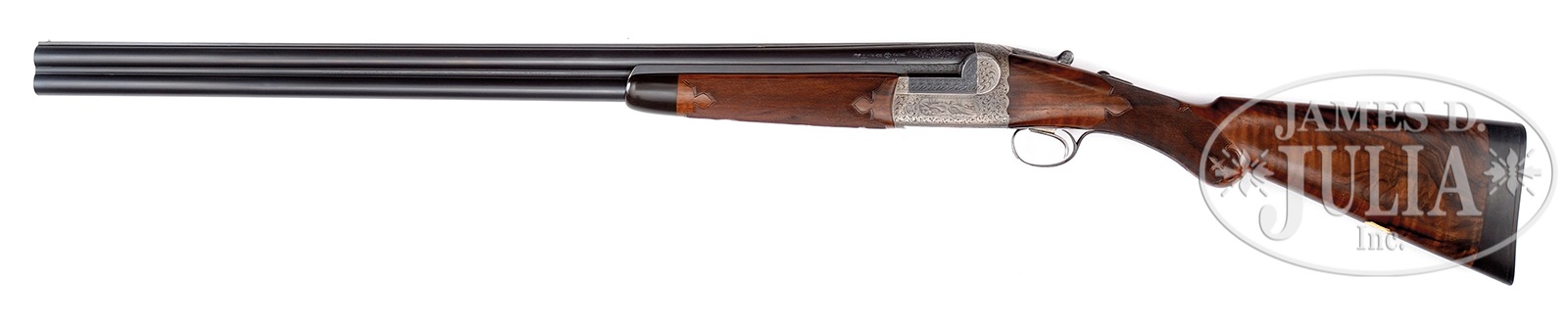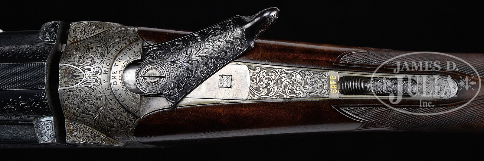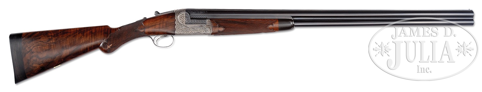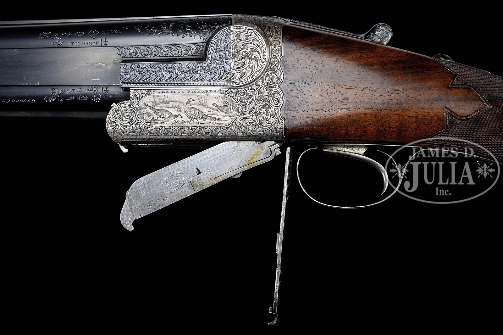 *SCARCE WESTLEY RICHARDS HAND DETACHABLE BOXLOCK EJECTOR SINGLE TRIGGER DELUXE “OVUNDO” ORIGINAL 3″ CHAMBERED HEAVY GAME GUN WITH CASE.SN 17597. (1915) Cal. 12 ga. 3″ Chambers. 29″ Demi-bloc bbls are fitted with concave, matted, solid rib, and Briley interchangeable choke tubes. Left side rib is engraved “Westley Richards 178 New Bond St London Gun Makers by Appointment to His Majesty George V Rex et Imp.” “OVUNDO”. Right rib is engraved “Von Lengerke & Antoine Chicago Agents”. Left sides of bbls are stamped with London nitro proofs for 1-1/4 oz of shot and long chambers. Left side of bottom bbl is engraved with “Ovundo” patent numbers. Case hardened, round bodied, ogee backed OU action with detachable locks has water table stamped with patent numbers. Locks are housed under hinged floorplate and are fully engine turned, and stamped with patent use number “2751”, also inlaid “L” and “R” in gold. Action is engraved with full coverage well cut large scroll surrounding ovate game scenes on sides of action under “WESTLEY RICHARDS”; a trio of feeding pheasant on left, and alert partridge on right. Top is engraved “Westley Richards Patent One Trigger”. Automatic safety has SAFE inlaid in gold. Blued floorplate has more scroll surrounding scene of black game cock and hen in highland environment. Single trigger with selector on right side is in small bow trigger guard engraved with pointing pointer on bow. SN is on tang. Finely marbled and nicely stump figured European walnut round knob “Prince of Wales” grip buttstock measures 14-3/8″ over Westley Richards embossed checkered horn buttplate over 7/8″ ebony spacer. Fancy pattern closely spaced checkering with line borders and intrusive fleur-di-lis are at grip. Rectangular horn chip guards are installed either side of trigger plate behind floorplate (most likely factory; one replaced). A gold truncated rectangle on toe line is engraved “S. S.” “10 – 10 – 77” “N.S.” Matching one piece ejector forend with large horn tip has Deeley release. Bore diameter: top -.735, bottom – .735. Bore restrictions: Screw chokes. Wall thickness: top – .027, bottom – .025. Drop at heel: 2-9/16″, drop at comb: 1-11/16″. Cast: approx 1/4″ off. Weight: 7 lbs. 10 oz. LOP: 14-3/8″. What appears to be orig makers leather case with shaped brass corners, is lined in burgundy cloth, and has Westley Richards New Bond Street paper label in lid. Case contains 2-pc rosewood and brass cleaning rod with mop and brush, a pair of snap caps, and three Briley thin wall choke tubes (2 in gun, for a total of 5). PROVENANCE: Factory email with orig specifications, stating it was the “highest grade” and was completed Sept 1915 for V L & A. CONDITION: Fine, as partially refinished. Bbls retain essentially all of a high quality rust blue, engraving still clear. Action retains a considerable amount, perhaps as much as 50% orig, never very strong, case hardening color. Top lever, floorplate, and trigger guard have been re-blued, and retain nearly all of that blue. Stocks have been nicely refinished over a few marks, with a few light subsequent marks. Checkering freshened. Bores are very fine to excellent, with a few light striations and frosting. Action is tight. Bbls are slightly off face. Ejectors are out of time. Trigger works. Case leather is dark, with numerous chips, rubs and scratches. Newer straps are good. Old handle is partially detached. Interior cloth is good with some insect damage, compressions, soiling and rubs. Some blocking has been renewed. Label is very good, foxed overall, and has some compressions and soiling. Accessories are good. A scarce gun especially in 3″ chambering; few Ovundos were made. 51091-1 MGM295 (12,000-18,000) C&R – Lot 3281 Click here to view provenance