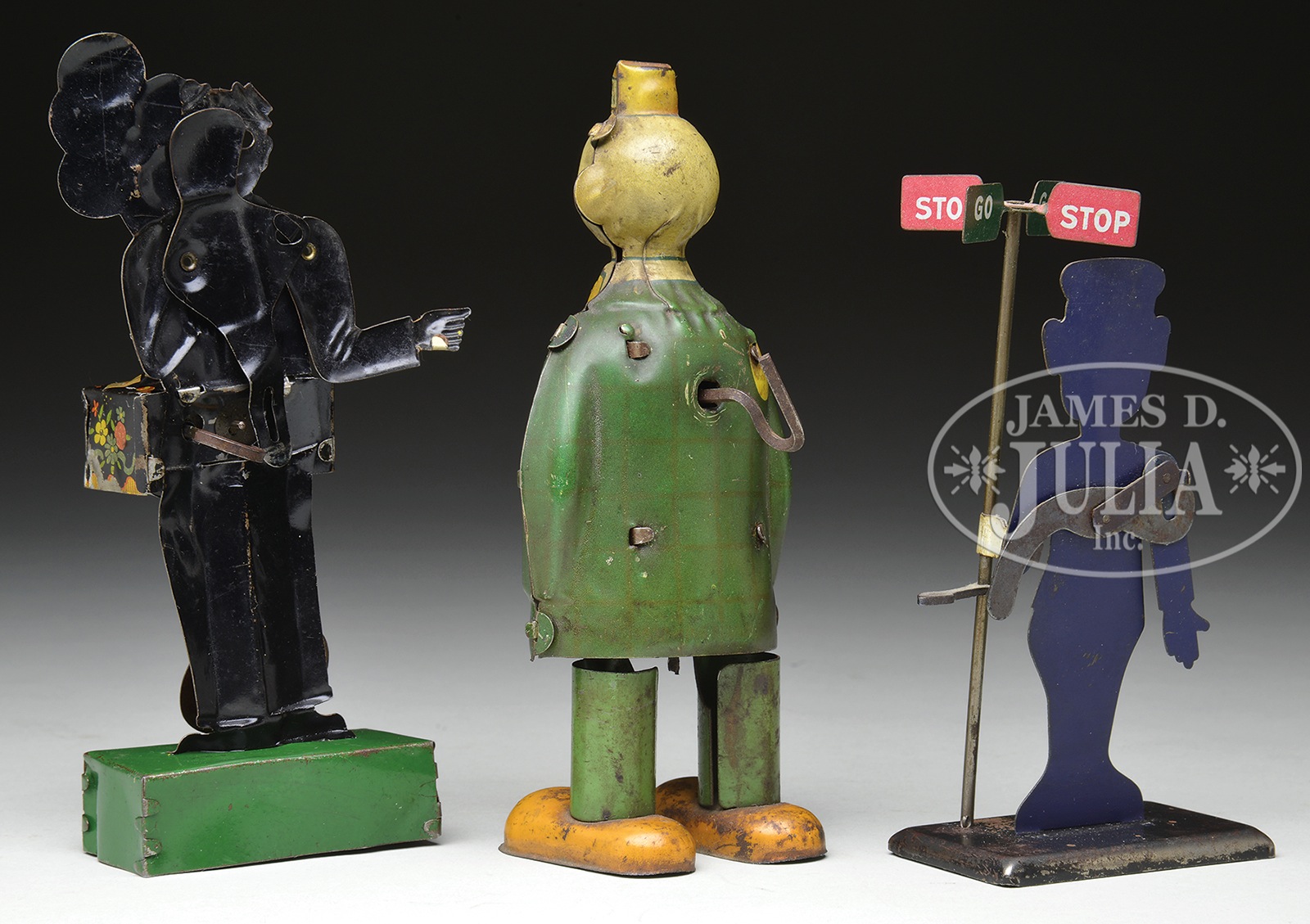 LOT OF 3 TIN LITHO TOYS.1) Distler balloon man that when activated has a googly eye effect and a swinging pendulum lithographed with monkeys while he raises his right arm. Normally right arm contains Mickey Mouse figure, but it is missing in this example. Good to very good condition and working, but in need of some minor straightening. 2) Traffic cop with stop/go sign of unknown manufacture. When activated sign turns and policeman raises and lowers his right arm. A cute go-with for collectors of automotive toys. Very good original condition. 3) Windup lithographed Happy Hooligan figure by Chein. In functional working order and in fair to good condition. SIZE: 6-7″ h. CONDITION: As stated above. 1-14242 (250-350) – Lot 3282 Auction: Advertising, Toy & Doll - Spring 2014 Please Note: All prices include the hammer price plus the buyer’s premium, which is paid by the buyer as part of the purchase price. The prices noted here after the auction are considered unofficial and do not become official until after the 46th day. |