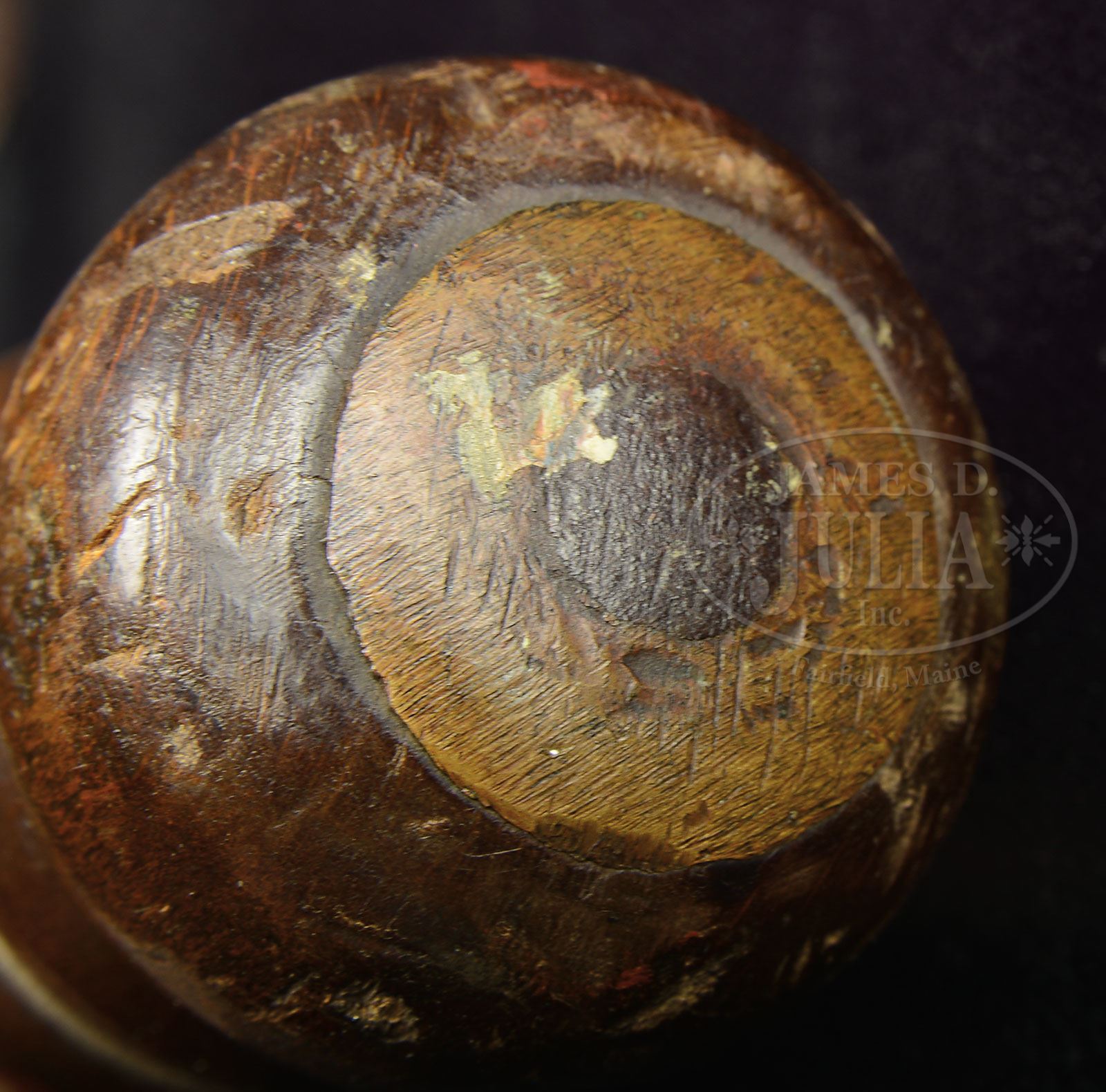 SN NSN. This particular well made short sword with turned wooden handle (possibly beech) was thought in the past to have been made by the Union Carworks in Norfolk, VA (see Albaugh, Confederate Arms ). New information and excavated examples in the Columbus, GA area make it most likely that these short swords were possibly made as naval cutlasses in Columbus, GA, possibly by Louis Haiman. Regardless of manufacturer in Columbus, this is a nice example of this classic wasp waist Confederate short sword. PROVENANCE: Greene Museum of Southern History. CONDITION: This 23-5/8″ sword is very good overall with 18-1/4″ blade being gray/brown, showing tool marks, old sharpening, staining and pitting. S-shaped 5-1/2″ iron guard and 7/8″ ferrule are brown/gray with staining and pitting. Wood handle is solid with scattered scrapes, dents and reductions with good hand worn patina. Copper washer at crown with peened over tang is intact, dark mustard patina and handle is tight. 4-54269 JS216 (4,000-6,000) – Lot 3283