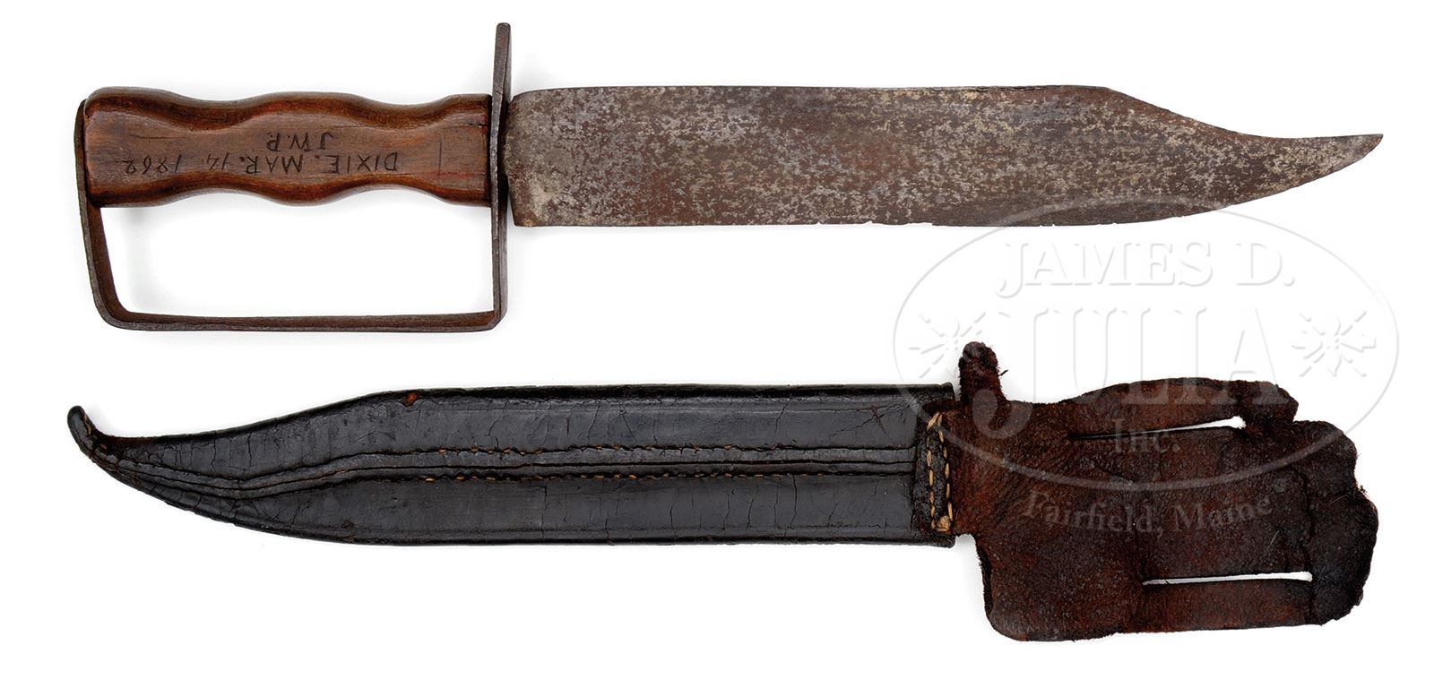 FINE CAPTURED CONFEDERATE D-GUARD BOWIE WITH SCABBARD.SN NSN. Rarely are Confederate knives found with such interesting capture inscriptions like this “TAKEN AT THE BATTLE OF NEW BERN, NC, DIXIE MAR. 14 1862 J.W.P.”. This Confederate made knife and its accompanying orig scabbard are a rare combination. The shaped wooden handle I have seen on several other knives at least one having a NC history and possible manufacture (see p.214 Confederate Bowie Knives). This is a wonderful knife and one of the few times I have seen the word “DIXIE” inscribed. PROVENANCE: Greene Museum of Southern History. CONDITION: Knife measures just over 16-1/2″ overall with 11-3/8″ clip point blade measuring just over 1-3/4″ wide and .30″ thick. Knife overall is in very good condition with gray/brown blade still with areas of shine but overall rusted, pitted and uncleaned. Blade has numerous small dents on top of blade where used as hammer and cutting edge has several small nicks and chips. The D-guard has matching color to blade, overall rusted and pitted. Grip has two old glued crack repairs and has remnants of black tar picked up where laying on scabbard frog. Grip is tight however D-guard is loose and wobbles. Guard is attached in an unusual manner with a screw through pommel into grip which is seen on few other knives known to me and usually those knives have partial tangs with pinned slabs. Regardless we have no reasons to question authenticity of this knife or carving and unusual wood which is probably beech. Scabbard is complete though much crazing and cracking of tooled body. Attached frog is quite fragile with reductions and tear as can be seen in photos. Sewn tip end of scabbard is also fragile but still attached. Blade and scabbard fit very tightly. 4-54271 JS217 (6,000-9,000) – Lot 3284