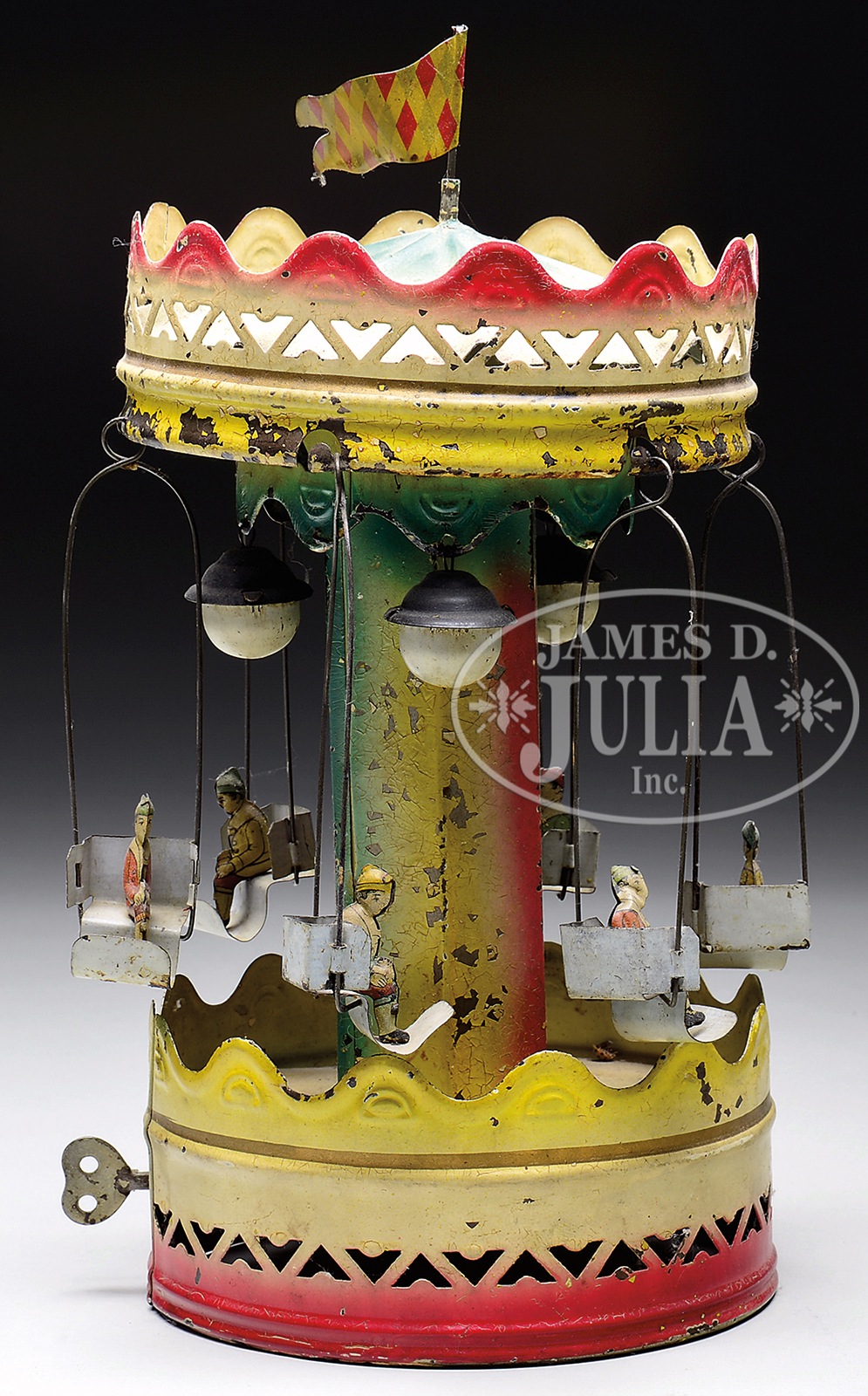 GERMAN CLOCKWORK SWING CAROUSEL.Clockwork driven German tin carousel with swing-out seats carrying lithographed tin riders. Toy retains all original airbrush colors, in blues, yellows, reds, and gold. Reticulated tin above and below. SIZE: 12″ t. CONDITION: Mechanism is not working. Retains all swing seats and riders as well as top flag. Paint averages fair to good with some chipping on the edges. 1-14030 (250-400) – Lot 3285 Auction: Advertising, Toy & Doll - Spring 2014 Please Note: All prices include the hammer price plus the buyer’s premium, which is paid by the buyer as part of the purchase price. The prices noted here after the auction are considered unofficial and do not become official until after the 46th day. |