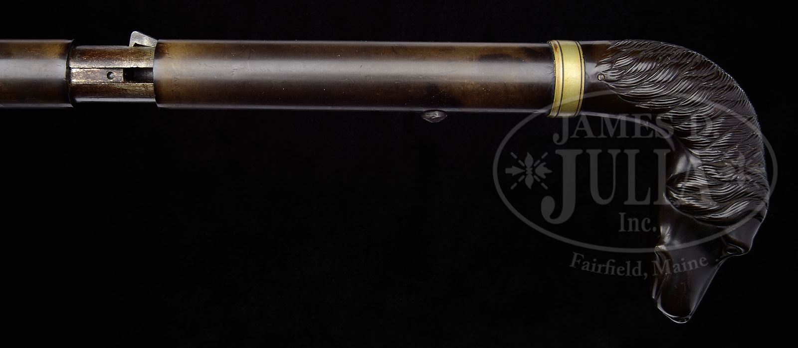 Please note: Estimate should be $8,000 – $9,000. SCARCE REMINGTON CANE GUN WITH LARGE DOGS HEAD HANDLE.SN 630. Cal 32 RF. Made of black gutta percha, 38-1/4″ long with metal tip that has reeded band. It has long handle shaft and domed trigger button with concentric rings. The joint between the dogs head handle and shaft has a 5/16″ nickel silver band. SN is found on the handle shaft, main shaft and tip. Tip of the main shaft has a steel sight band, missing its bead. The Remington and patent information on the handle shaft is partly visible. Handle is unscrewed from the shaft for loading and unloading and when reassembled handle is pulled to cock the striker and raise the rear sight. There were only about 1800 of these scarce cartridge cane guns produced 1866-1888 with at least four handle styles and a variety of lengths. Finding one of these canes completely orig and intact is a great rarity. PROVENANCE: The Elliott Burka Estate Collection. CONDITION: Very fine, all matching. Gutta percha is completely intact with no visible chips or breaks, having faded from black to brown. Metal tip is a smooth brown patina with plier marks. Dog’s head handle is extremely fine retaining great detail. Mechanics are fine; strong bright bore with very fine frosting 49662-13 JR (4,000-6,000) – Lot 3285