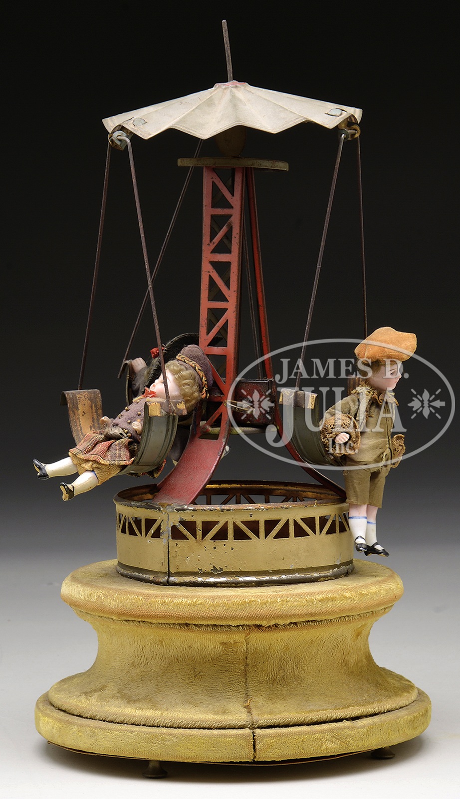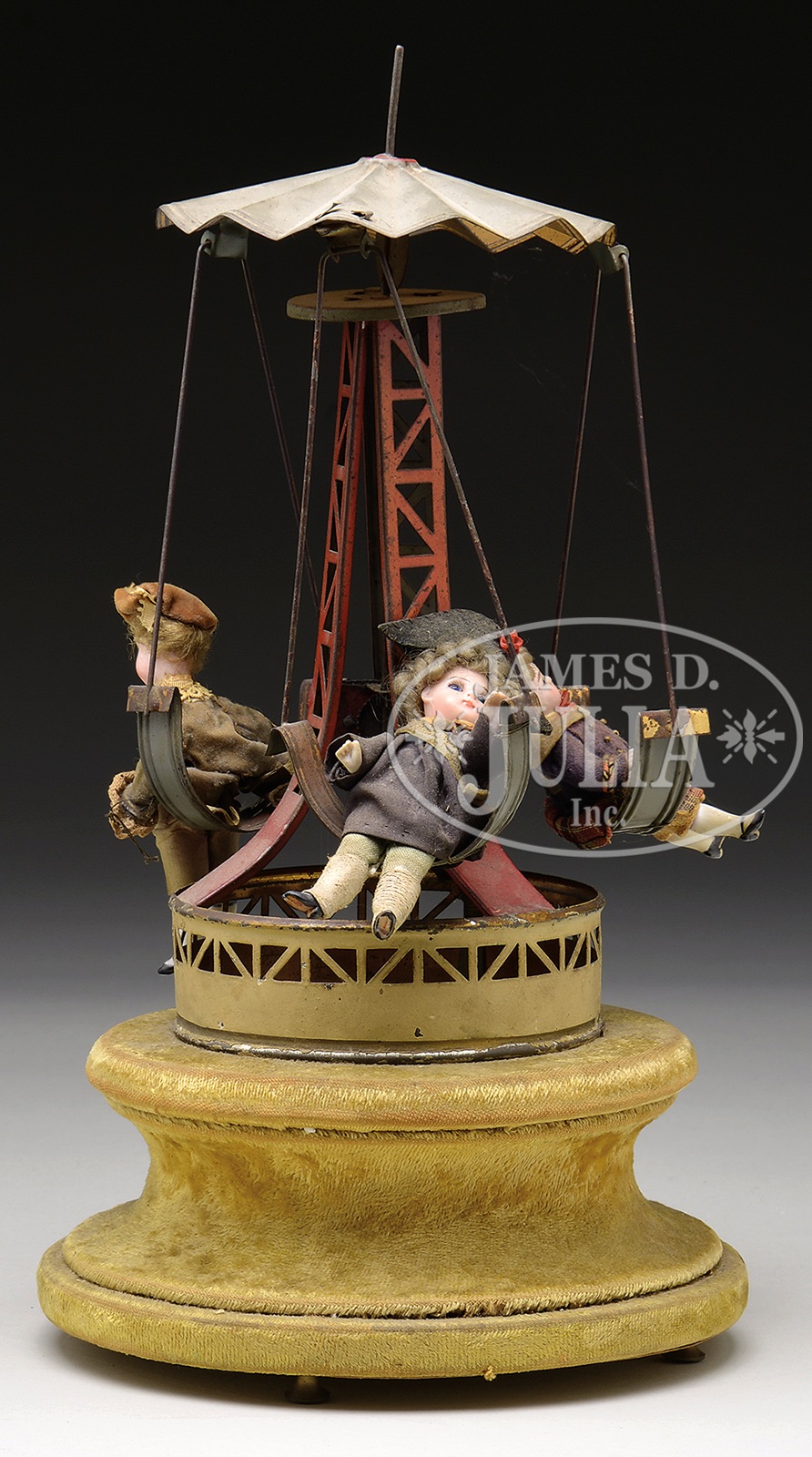MUSICAL WINDUP CAROUSEL.Of German manufacture, possibly by M&K. Combination of hand painting and litho, the carousel features three seated bisque figures with a windup mechanism housed in the center section. Affixed to a velvet covered plinth and a separate musical movement housed within. SIZE: 14″ h. CONDITION: Overall very dusty and in need of a light cleaning. Missing a top ornamental pennant, but in working order. 1-14189 (200-300) – Lot 3286 Auction: Advertising, Toy & Doll - Spring 2014 Please Note: All prices include the hammer price plus the buyer’s premium, which is paid by the buyer as part of the purchase price. The prices noted here after the auction are considered unofficial and do not become official until after the 46th day. |