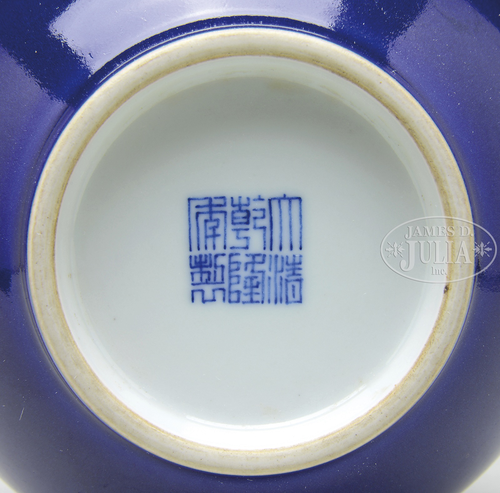 BLUE GLAZED BOTTLE VASE.Qing Dynasty period, China. The bottle vase glazed in brilliant blue color, with ovoid body and tapering neck, the base partially covered with a white-tinted glaze, and bears a six character QIANLONG mark. SIZE: H: 9-3/8 in (23.7cm) D: 4-3/4 in (12cm). CONDITION: Good. 9-97048 (6,000-8,000) – Lot 3288