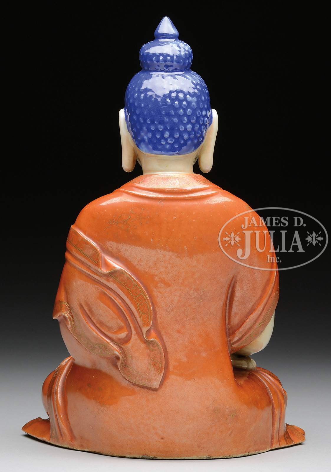 CAFE-AU-LAIT PORCELAIN SHYAKAMUNI BUDDHA FIGURE.Qing Dynasty period, China. Seated Shyakamuni, painted in three colors of sparrows egg blur & coffee, red, and white, over porcelain. SIZE: H: 9-7/8 in (25.1cm)W: 7 in (17.8cm). CONDITION: Good. 9-97017 (2,000-4,000) – Lot 3289